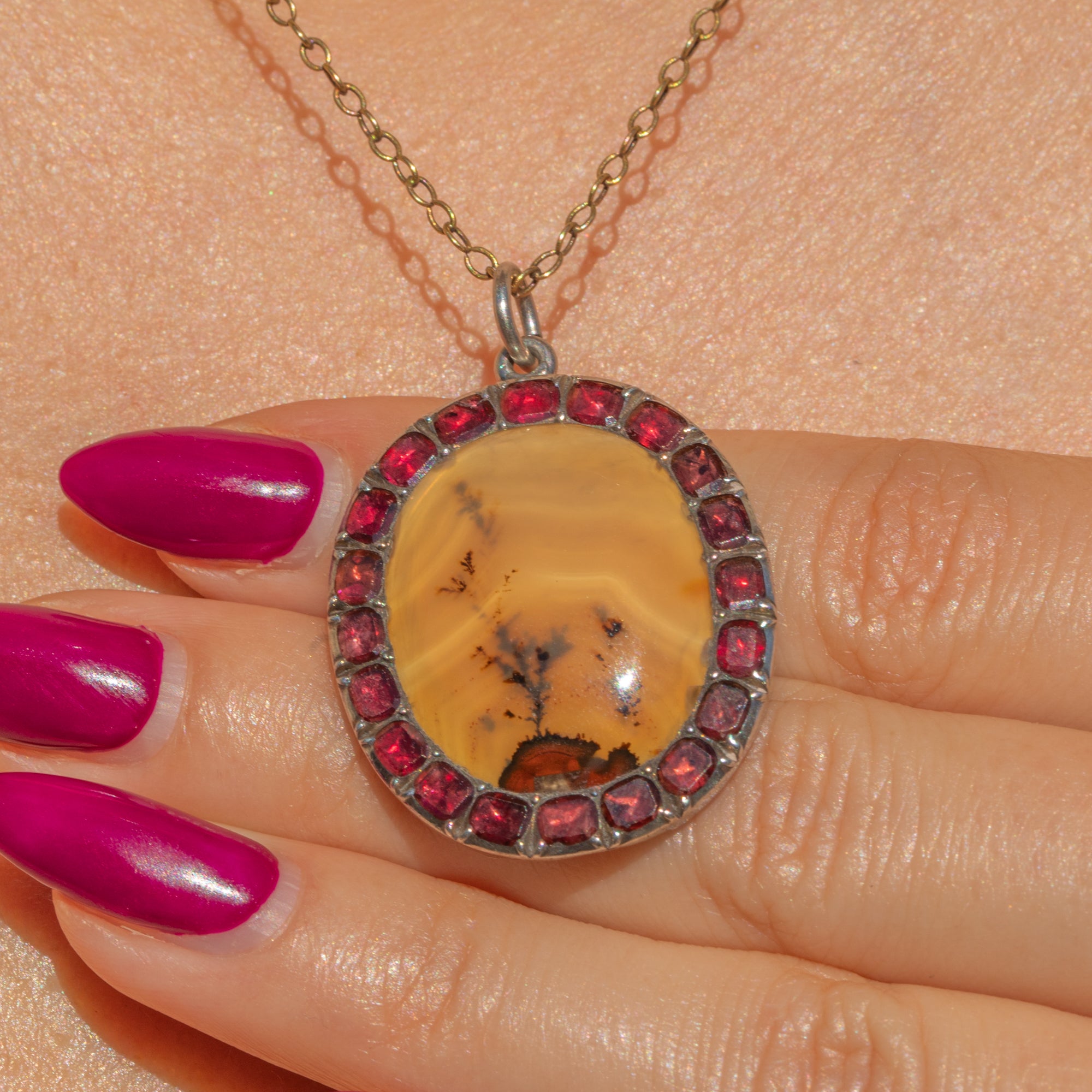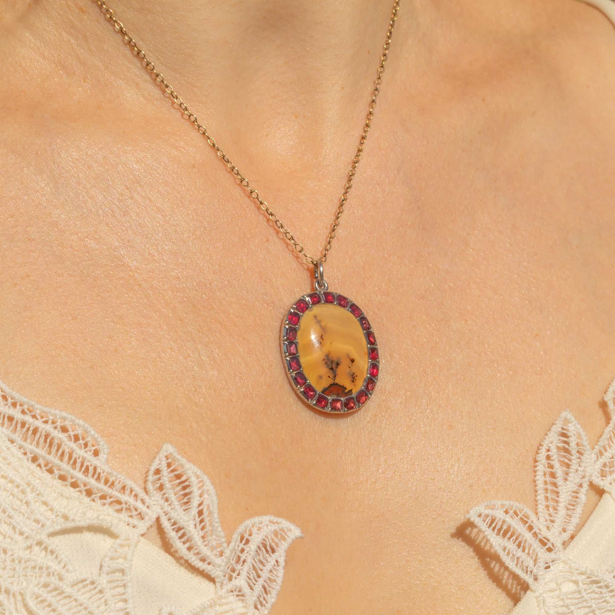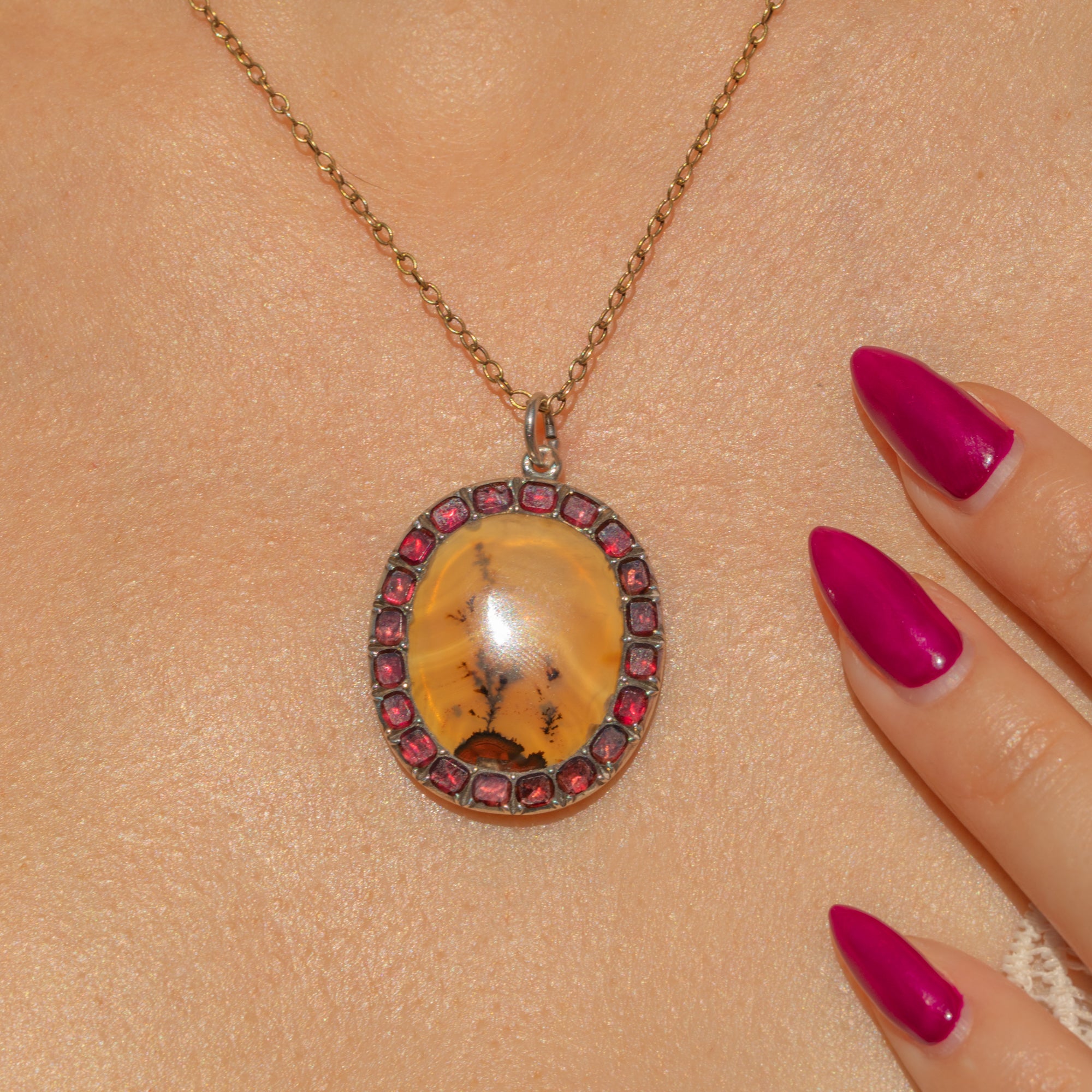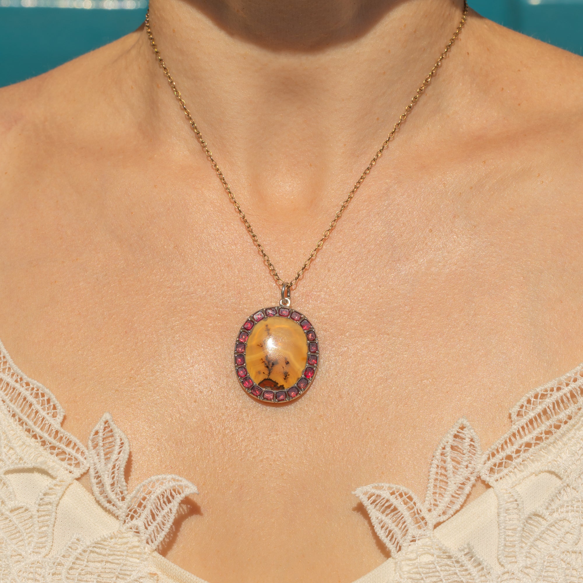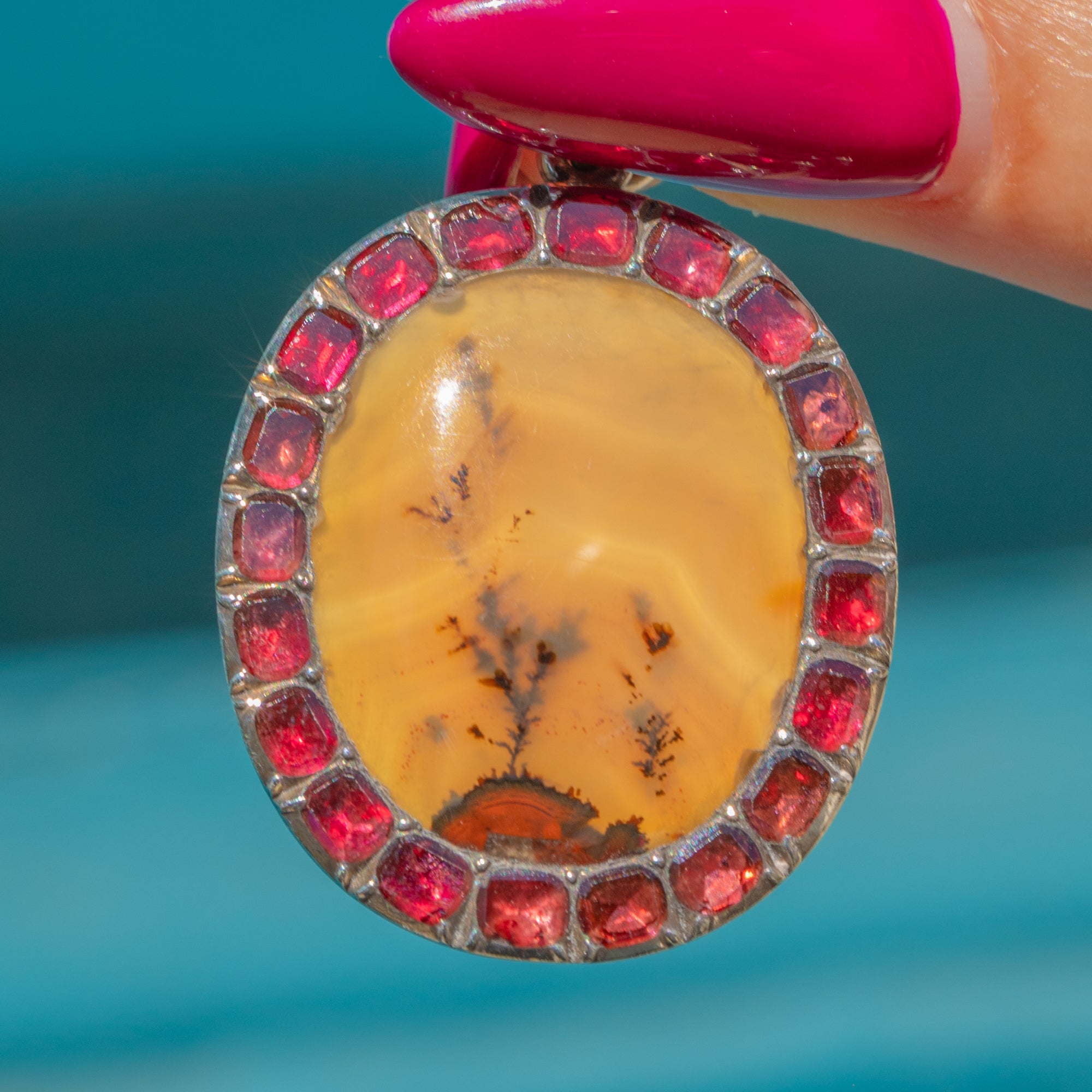 In the centre of this antique pendant sits a large, earthy dendritic Agate, adorned with distinctive fern-like inclusions for which the gemstone is so revered. It is encircled by 3.60cts of glistening flat-cut Garnets - a staple stone of Georgian jewellery.