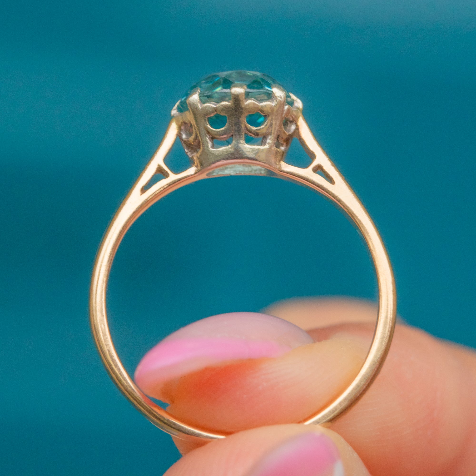 This dazzling Art Deco ring centres a vivid blue Zircon weighing approximately 2.50cts. The gem’s electric brilliance and depth of colour are mesmerising, capturing the crisp geometry and glamour of the 1930s era.