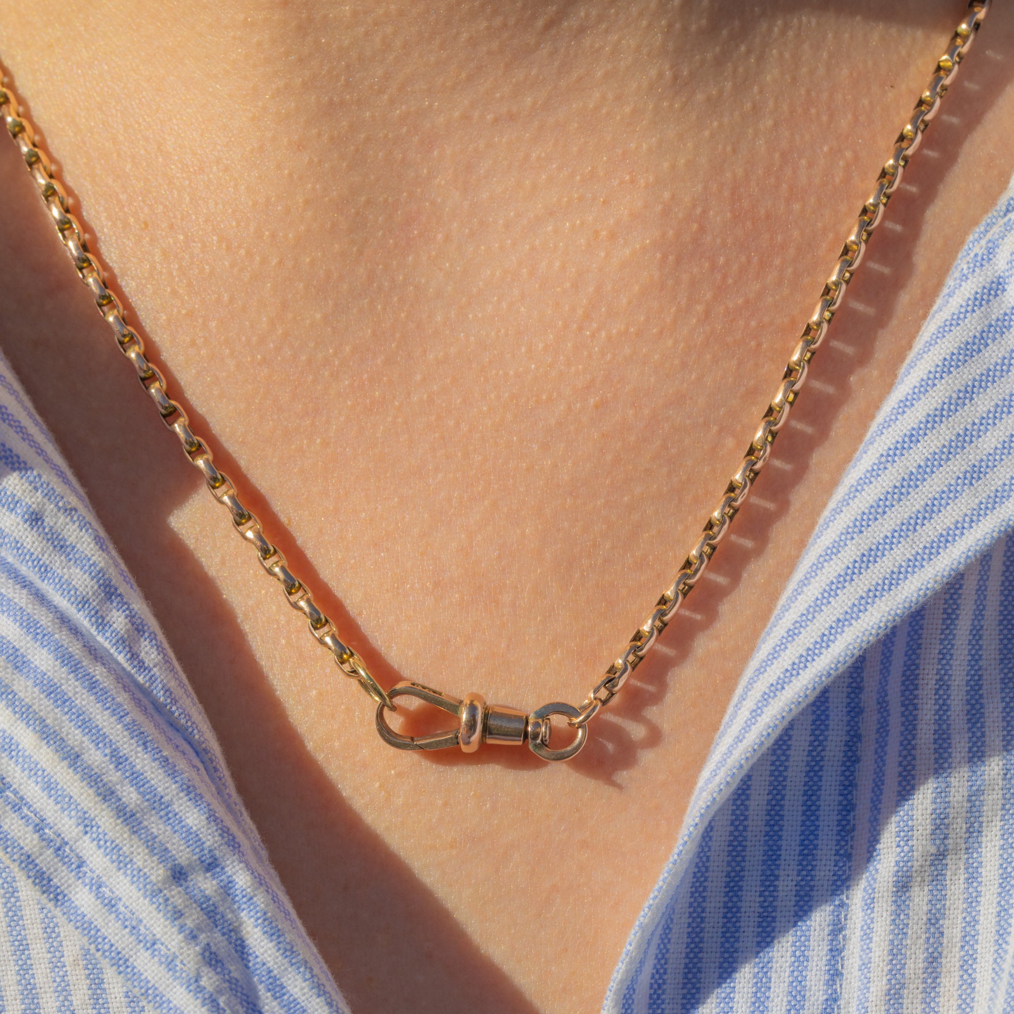 Complete with an antique dog clip, this Victorian Gold chain will rest beautifully on your décolletage, perfect for suspending your chunkier pendants and charms. A versatile piece, she will make a wonderful addition to your collection, either layered with other chains or simply worn alone for a welcome flash of Gold.
