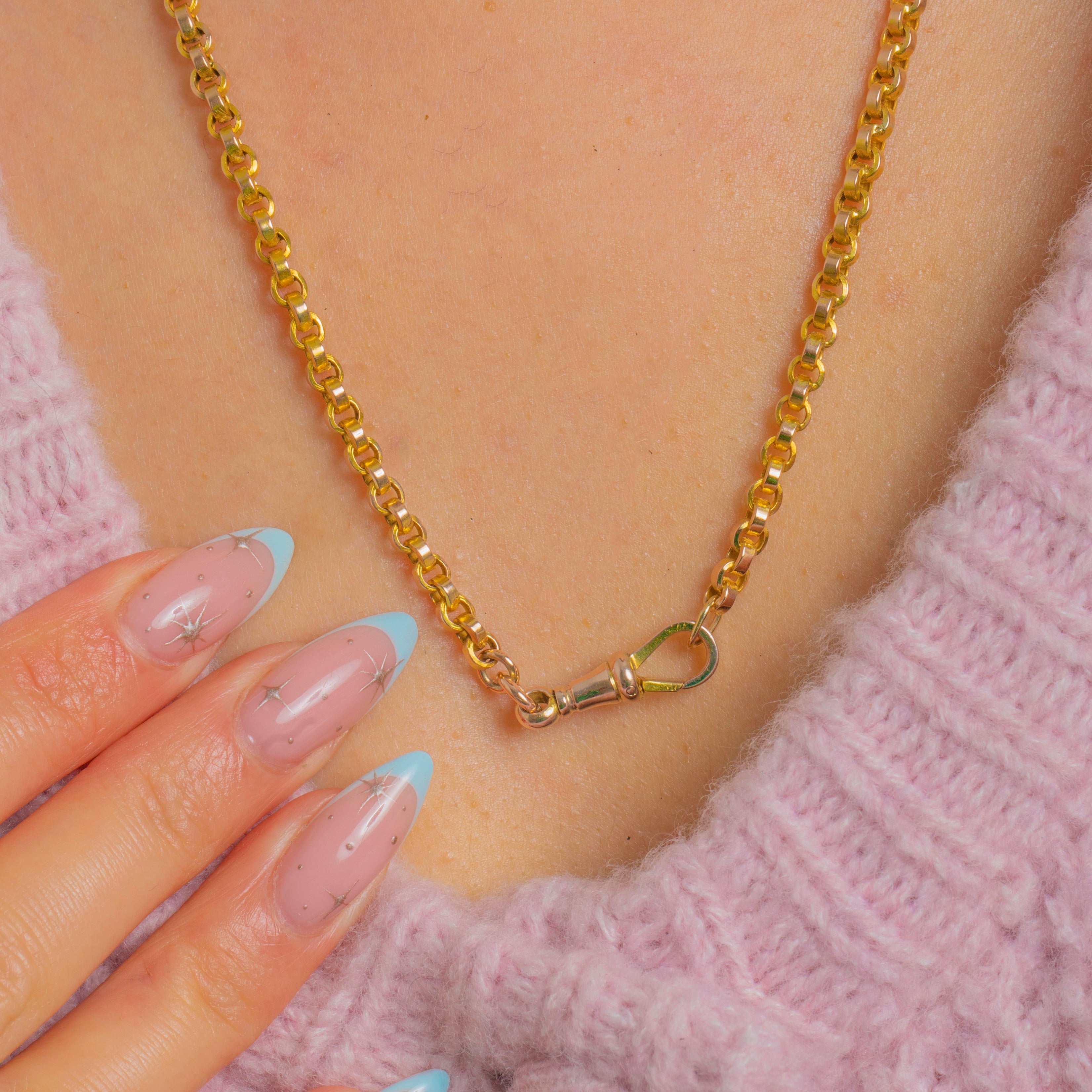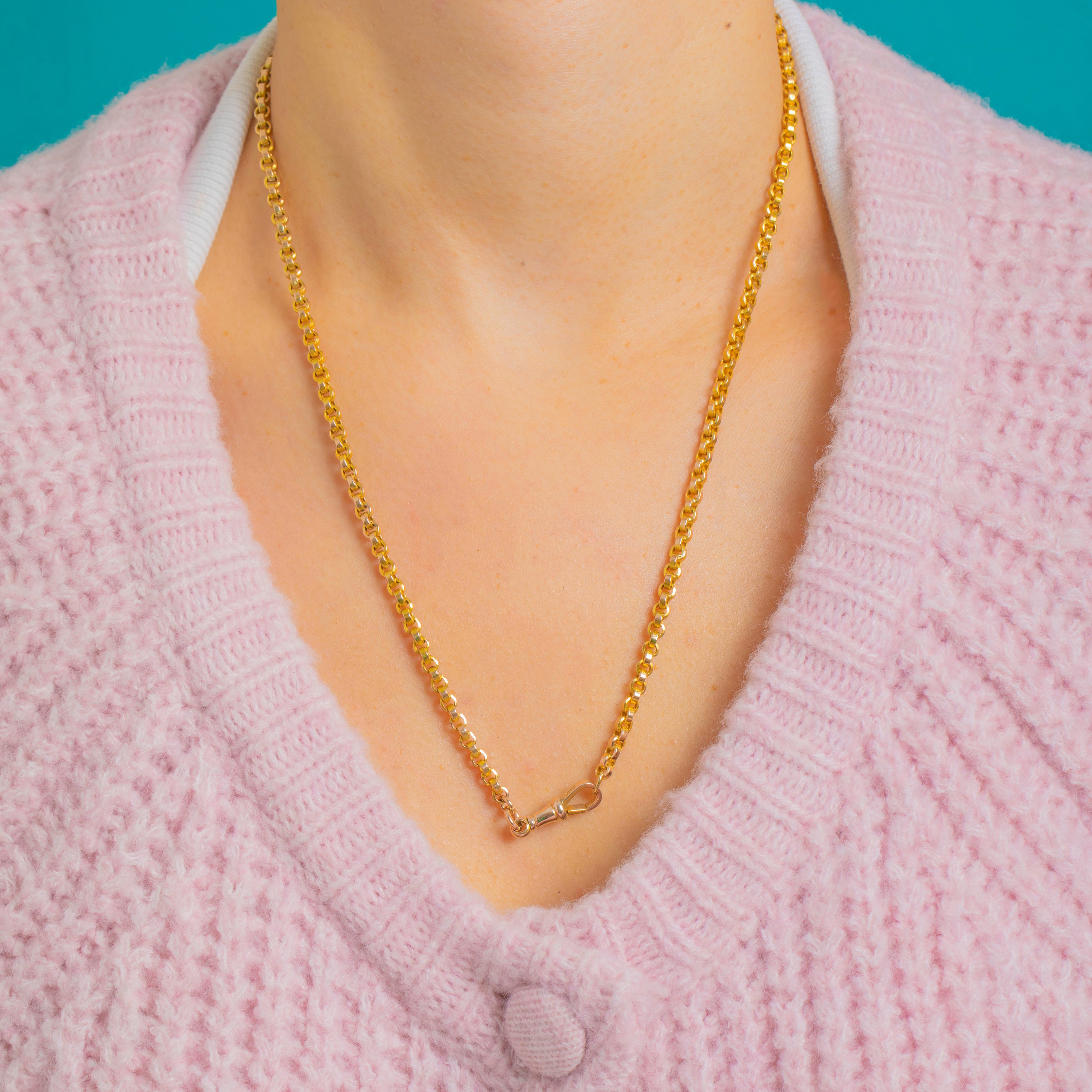 A timeless Victorian belcher chain in glowing 9ct Gold, finished with a traditional dog clip clasp. The uniform round links have that clean, utilitarian elegance beloved of antique watch chains, with a bright polish that catches the light beautifully.