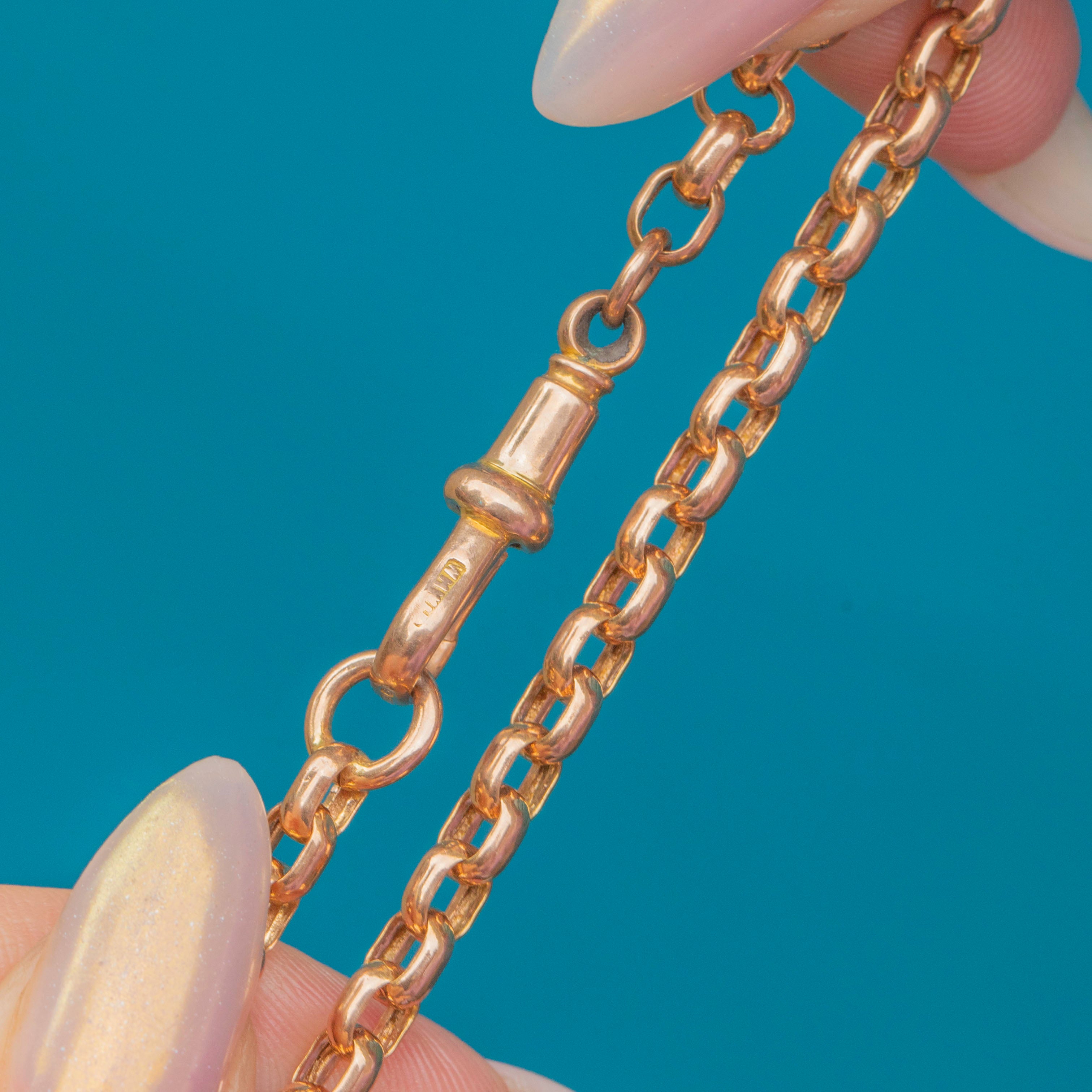 EXCELLENT: The links are in fine condition, well-shaped and free from dents. The Gold has retained a bright, warm tone. The dog-clip clasp is secure and functions smoothly, allowing you to wear this antique belcher chain with utmost confidence.