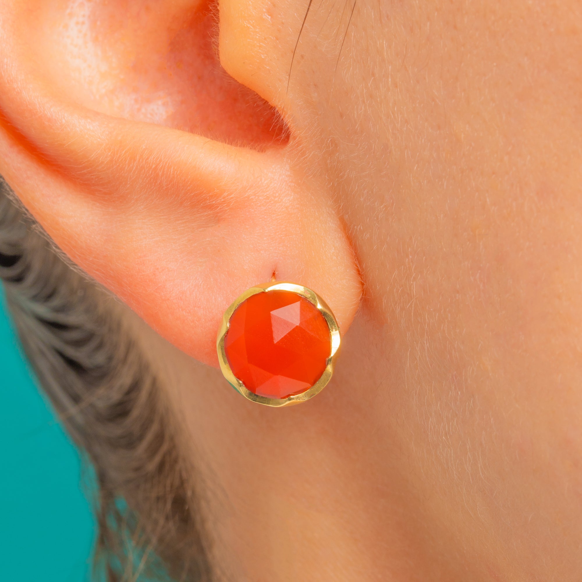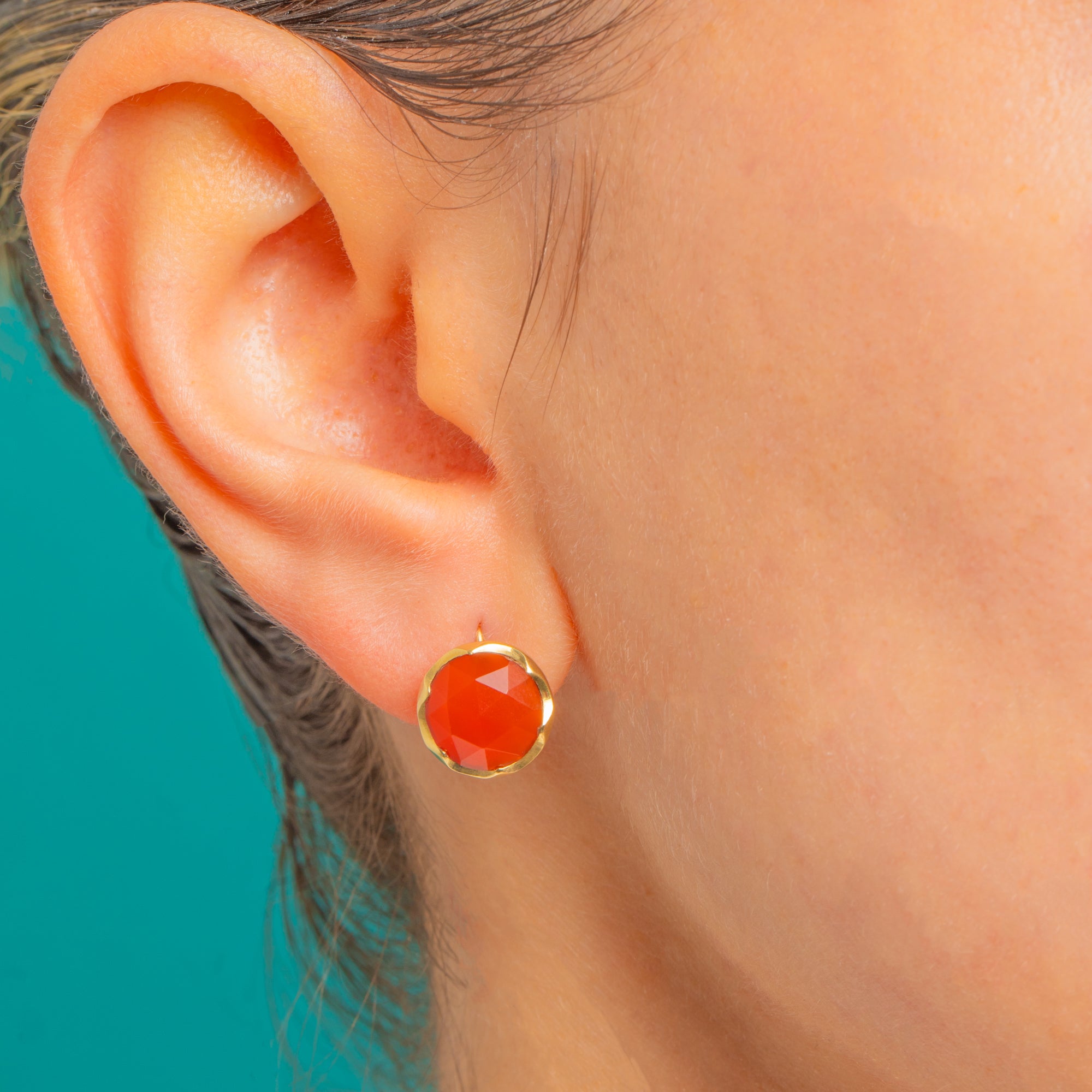 太陽に温められたような豊かな色彩が輝く、20世紀後半オランダ製カーネリアンイヤリング。15ctゴールドの上品な輝きに、鮮やかでファセットカットのカーネリアンが主役となり、ジューシーなオレンジレッドの色調がバターのようなゴールドと美しく調和します。繊細なスカラップ状のベゼルが花びらのような柔らかな印象を添えています。