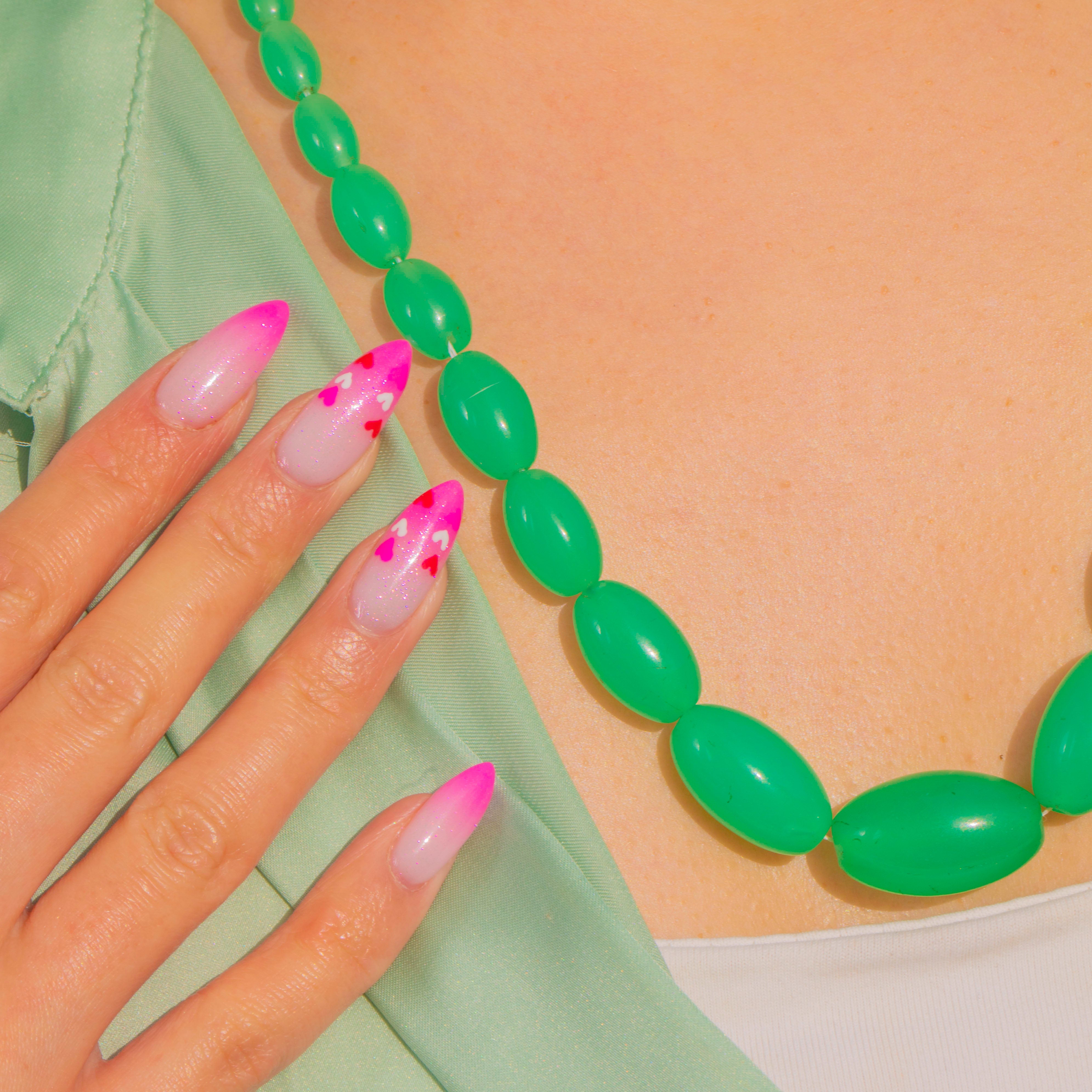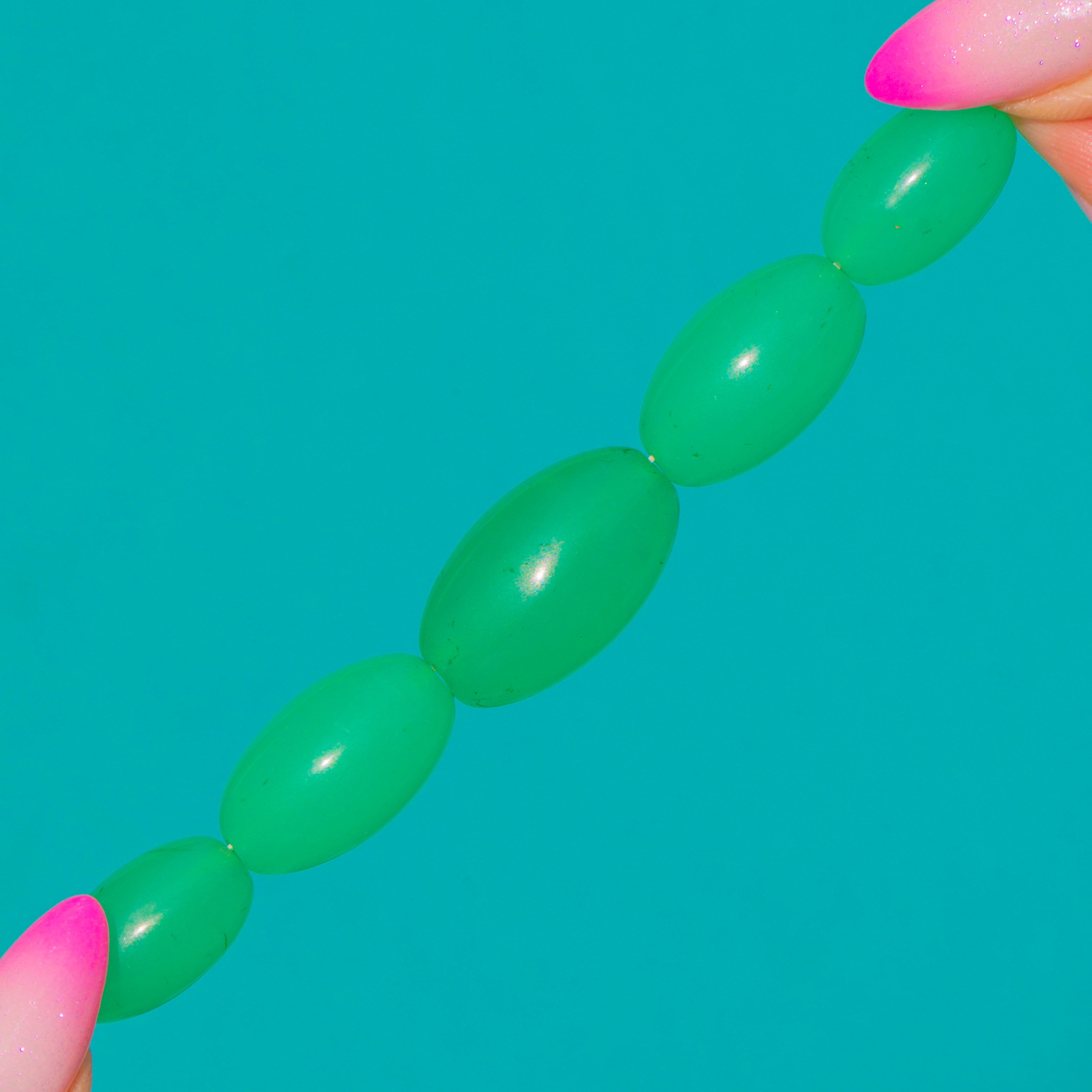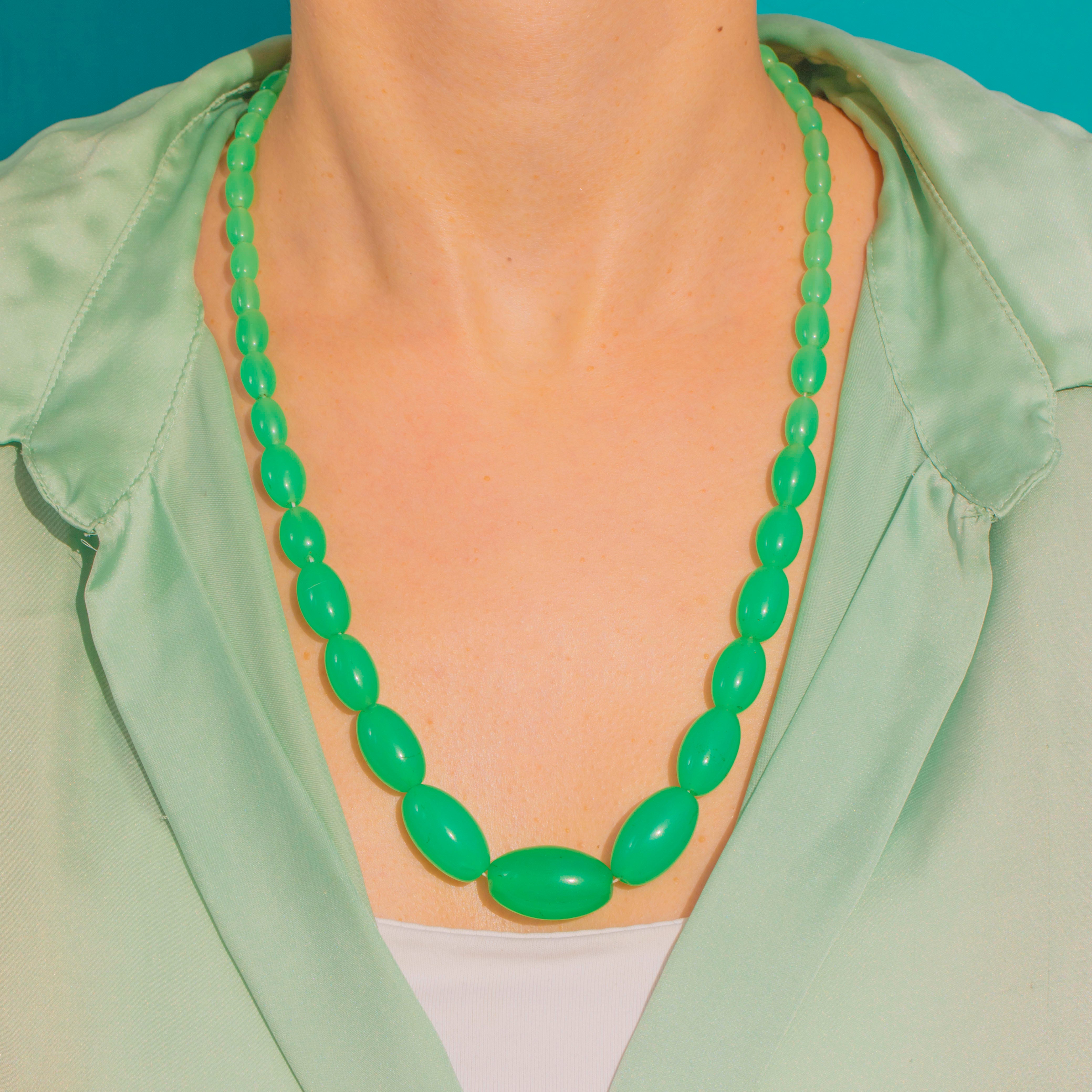 A vivid sweep of mint-green Uranium Glass beads brings this Art Deco necklace to life. The sleek, elongated ovals are beautifully graduated for a refined rhythm and flow, their glossy surfaces catching the light with every movement.