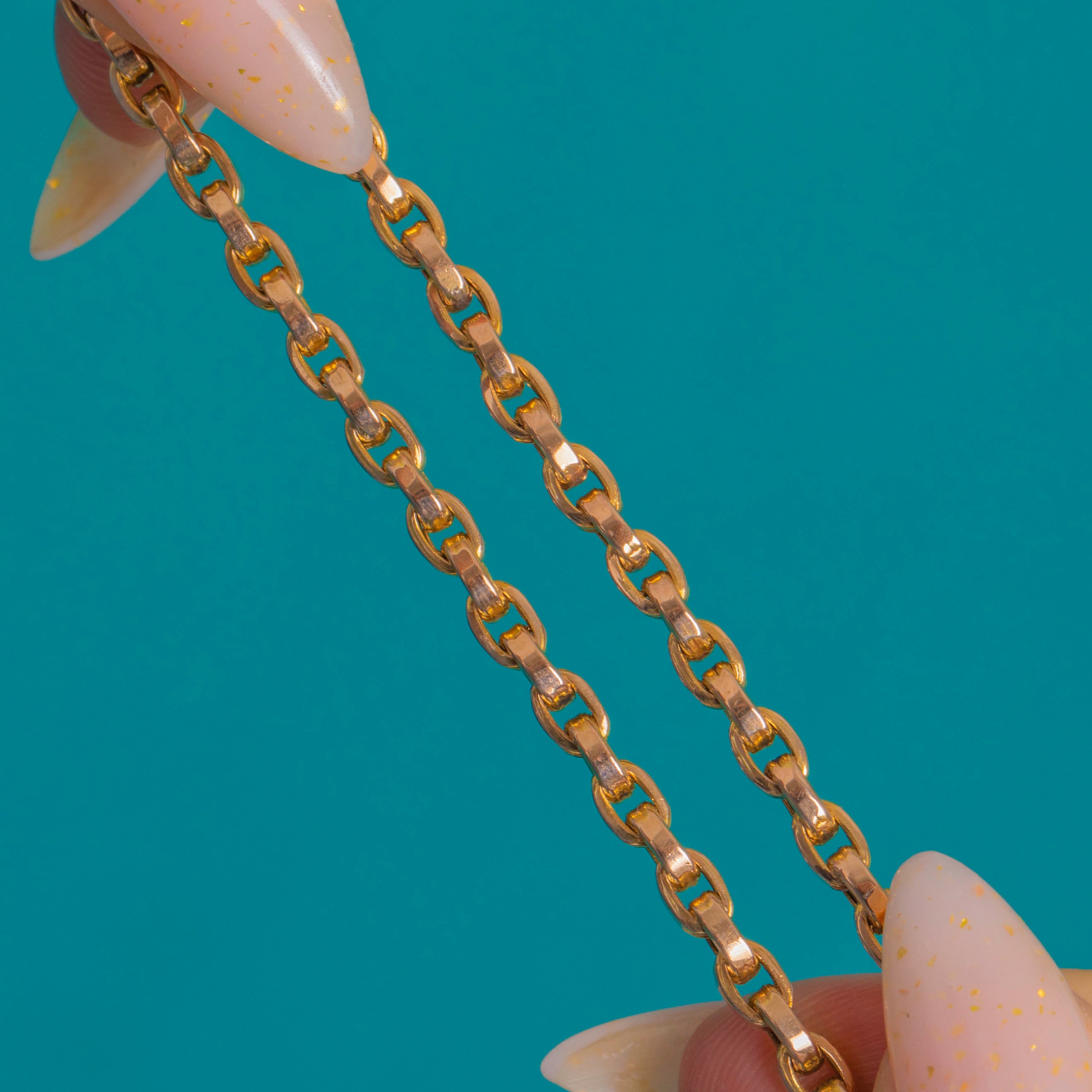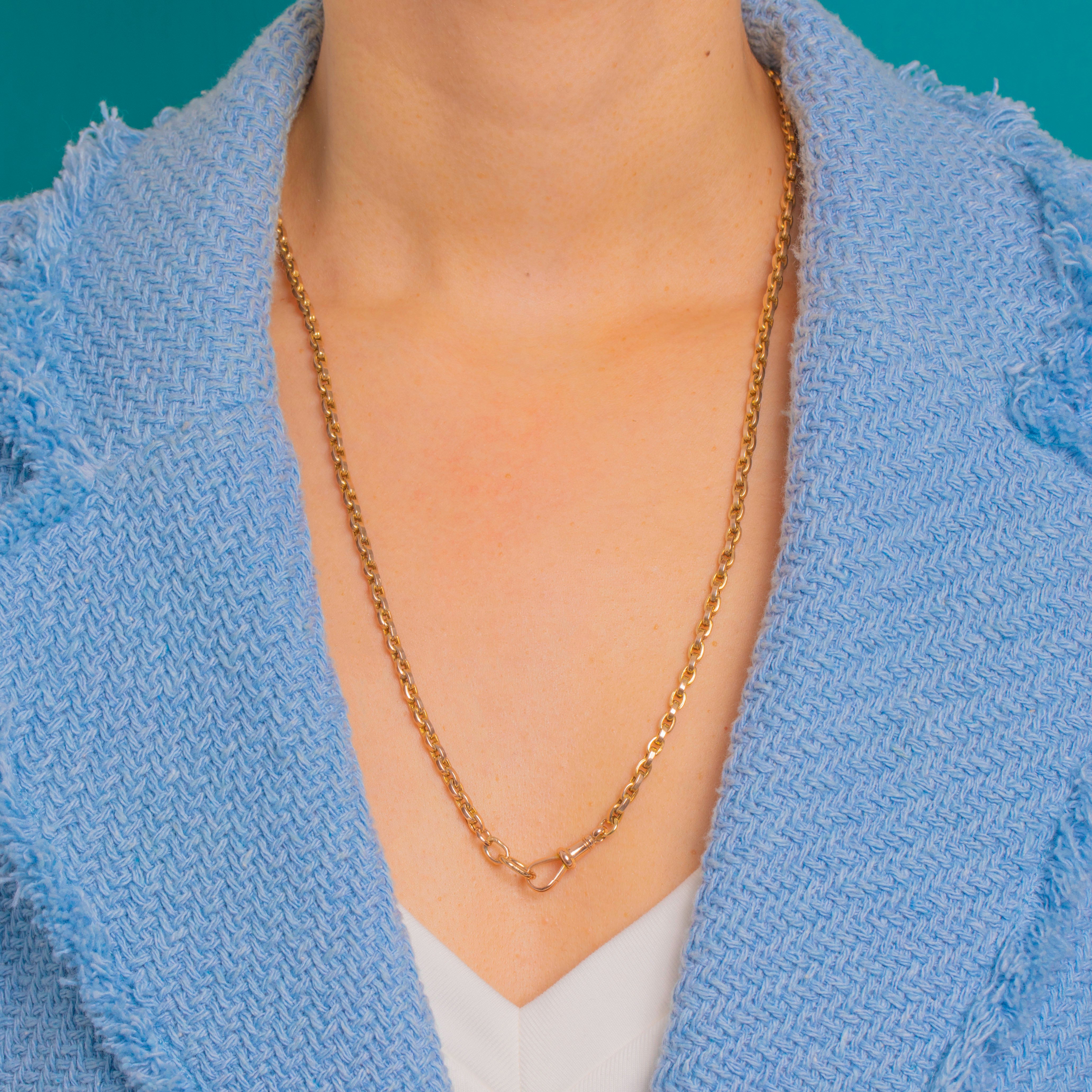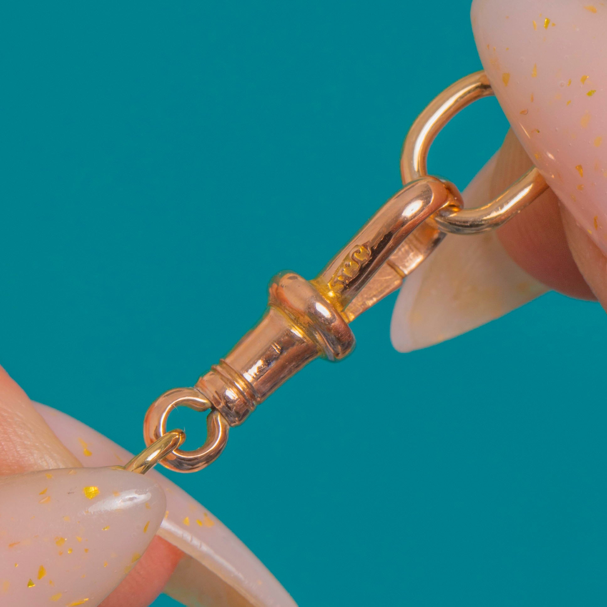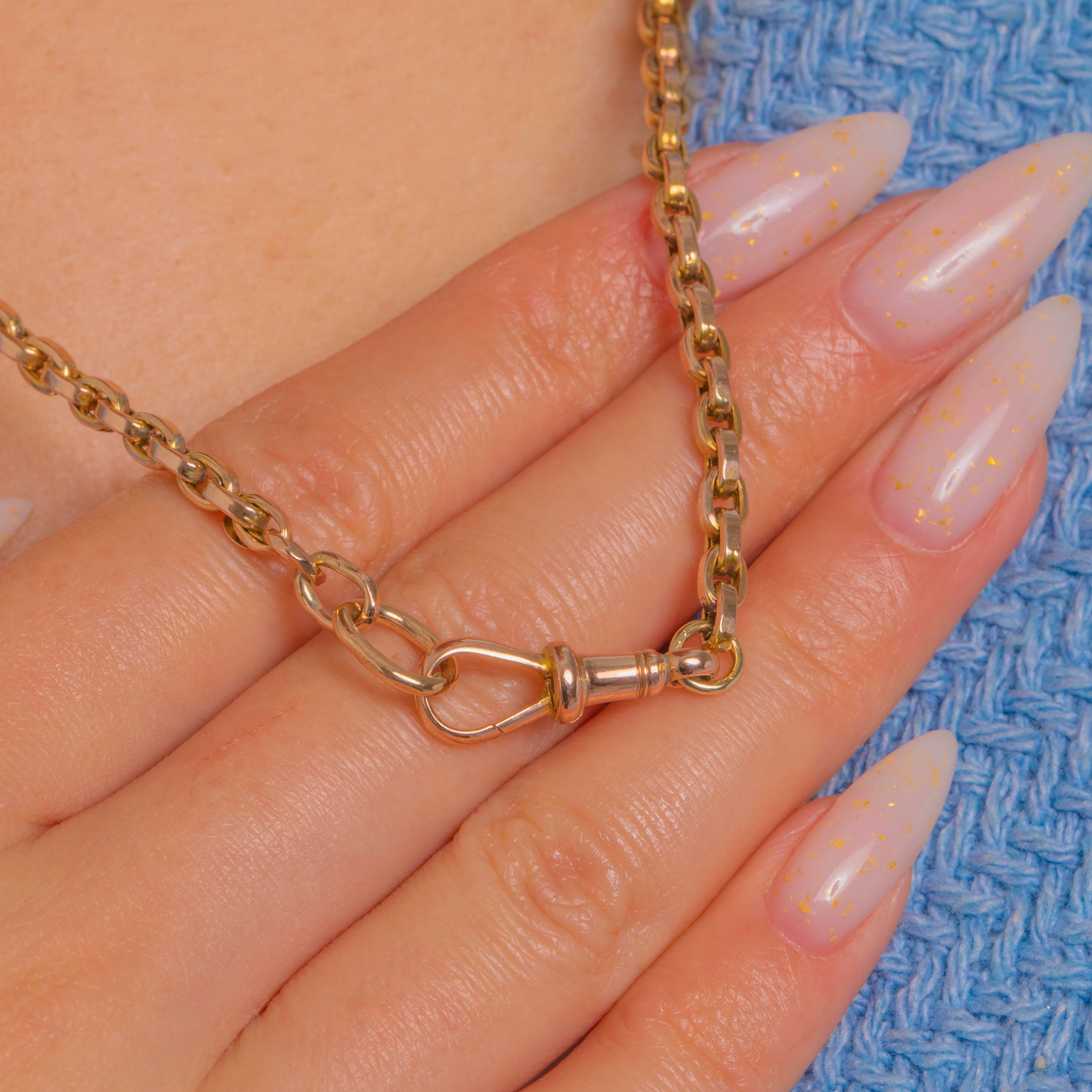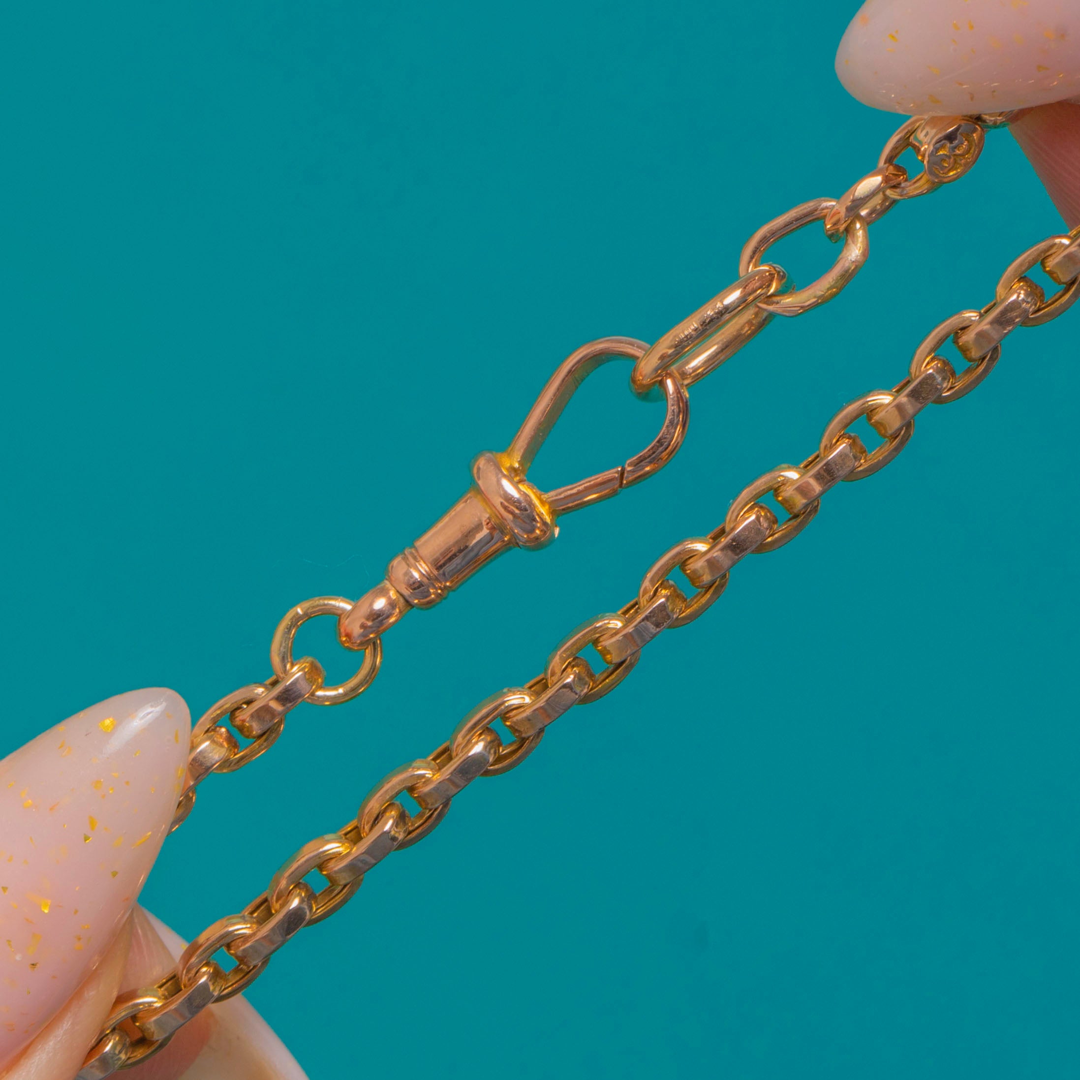 A timeless Victorian 9ct Gold Belcher chain with a classic Albert/watch-chain feel. It fastens at the front with a traditional turned dog-clip that connects to a round bolt ring—both beautifully engineered for that unmistakable antique finish.
