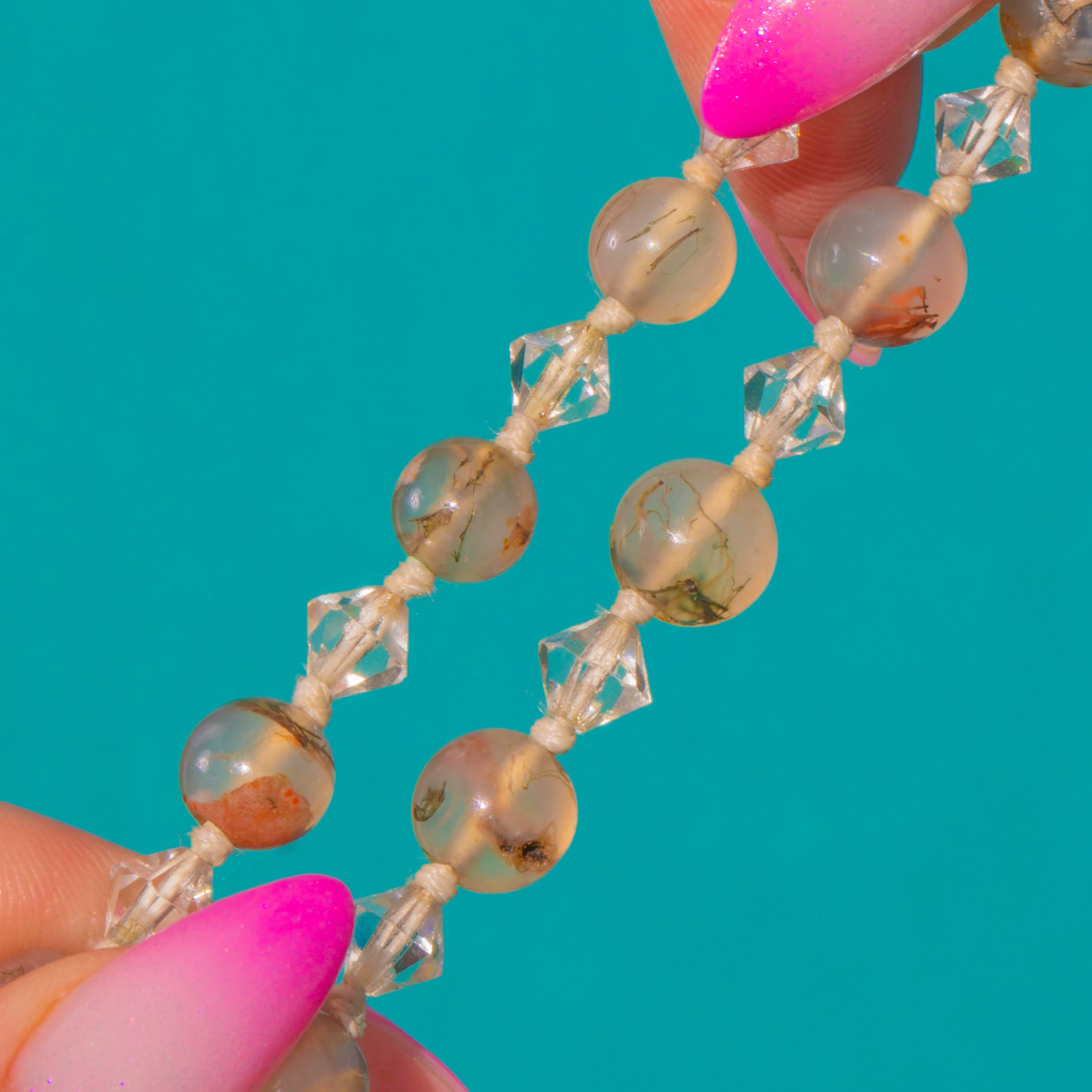 Evocative of misty forests and painterly horizons, this Art Deco necklace marries translucent Moss Agate with sparkling Rock Crystal. Each polished, round Agate bead displays natural dendritic inclusions in soft greys, olive-greens and warm amber tones, creating an organic, landscape-like effect. Clear faceted Rock Crystal spacers punctuate the strand with light and brilliance.
