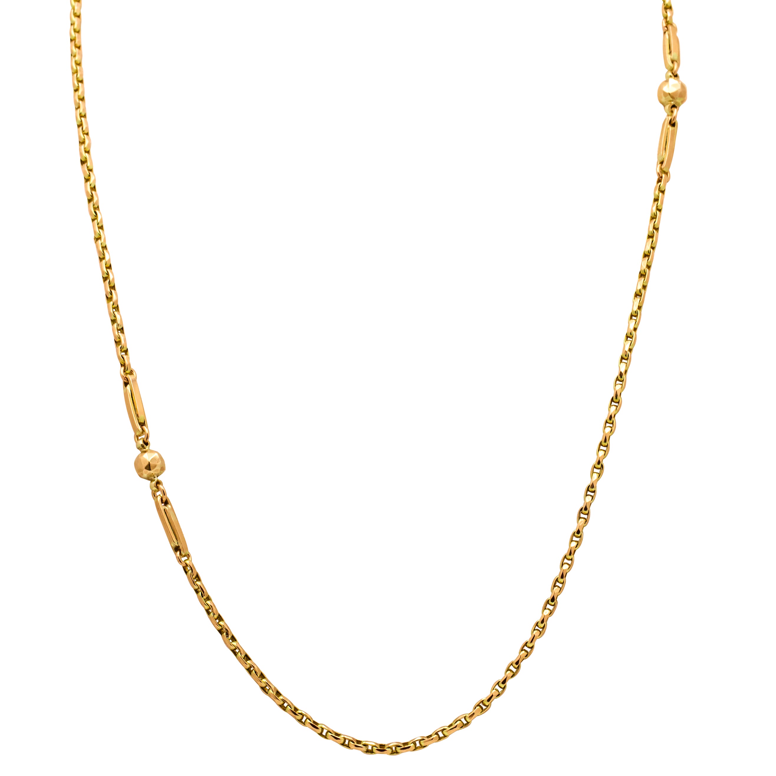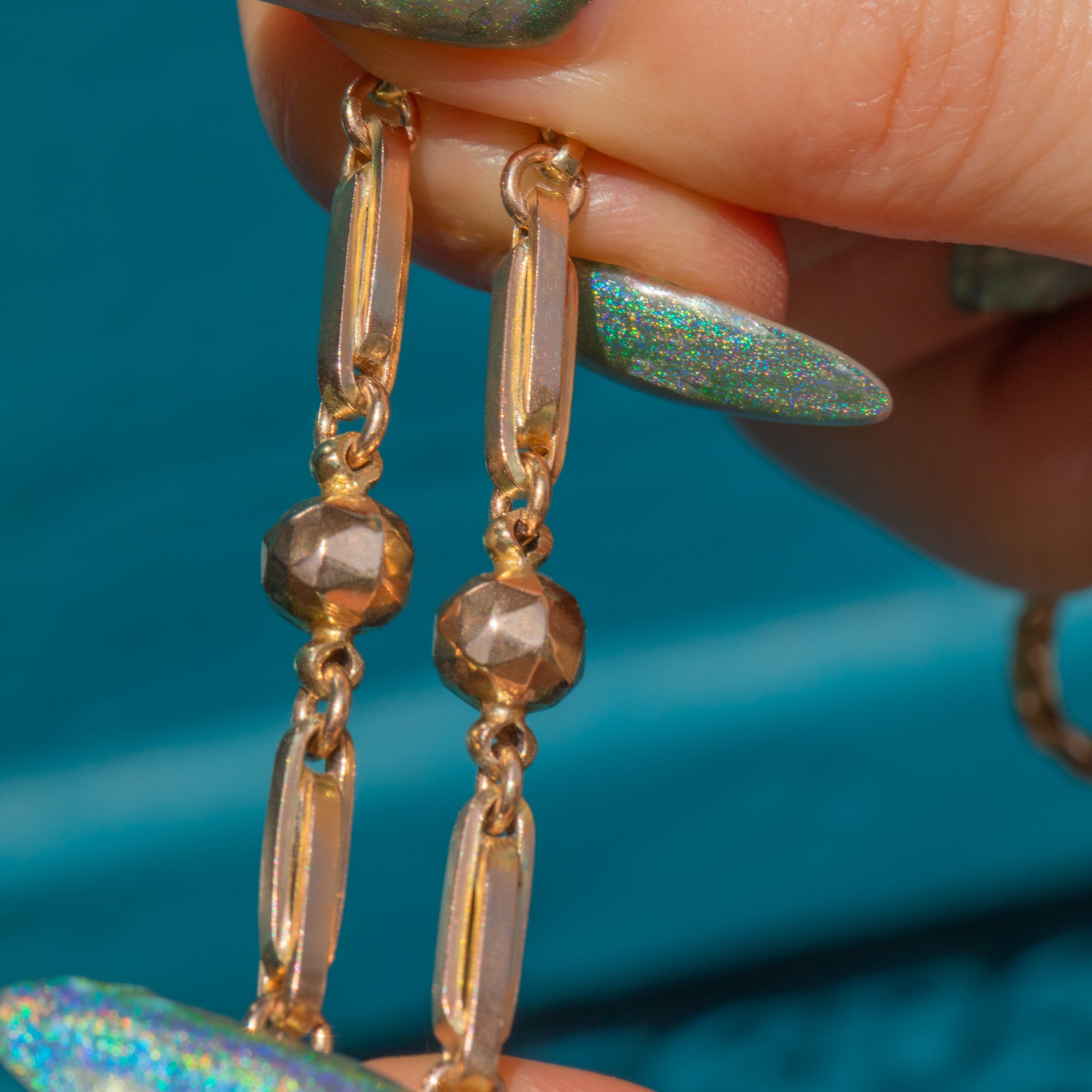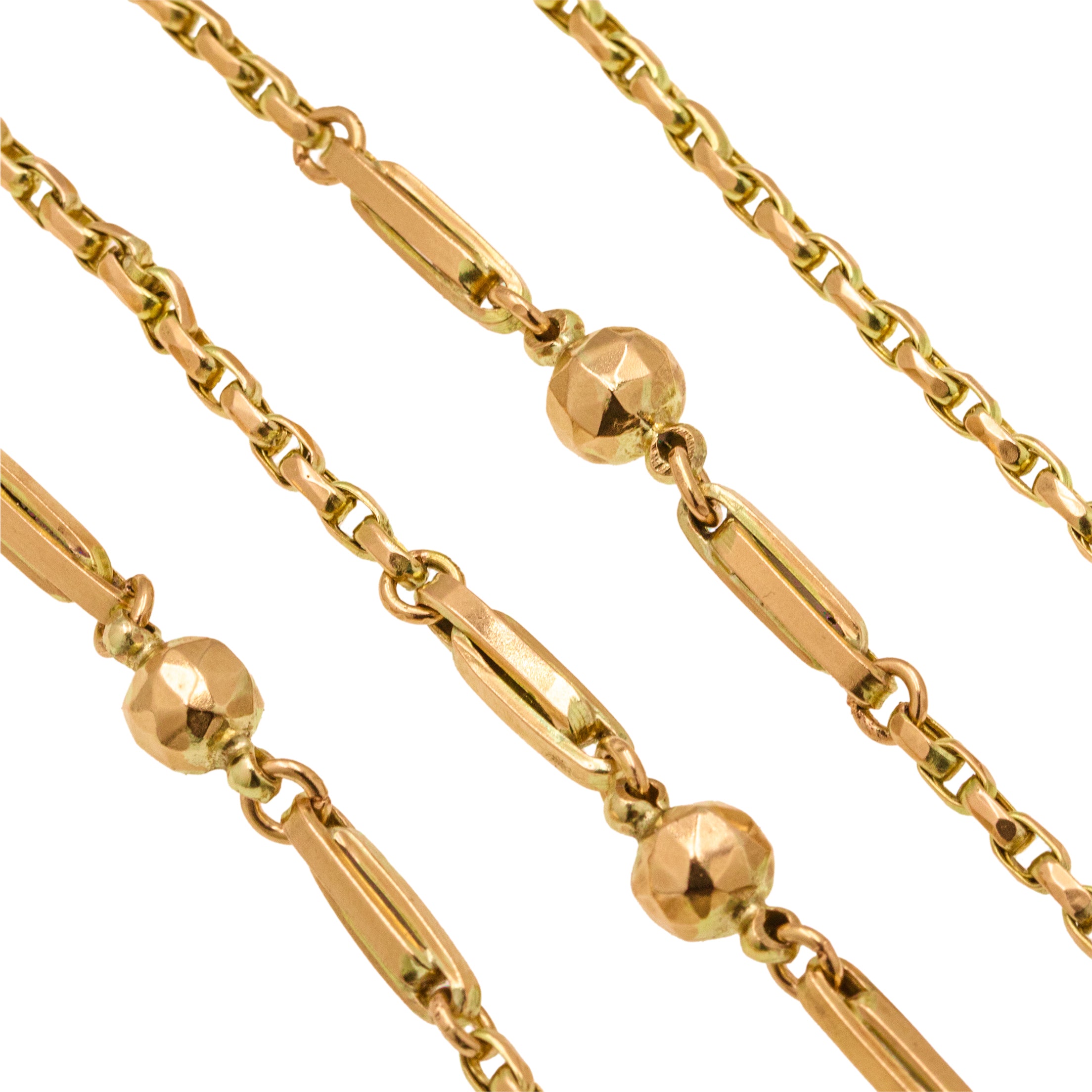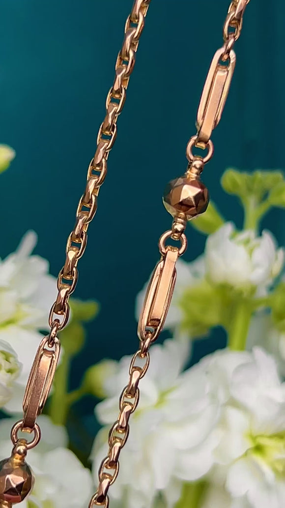 EXCELLENT. We are pleased to present this antique 9ct Gold ball and fetter belcher chain in excellent condition! The Gold is buttery throughout and each link is securely affixed, free from any signs of wear. Please note that there is no clasp on this chain, but her generous length allows you to pop her over your head with ease.