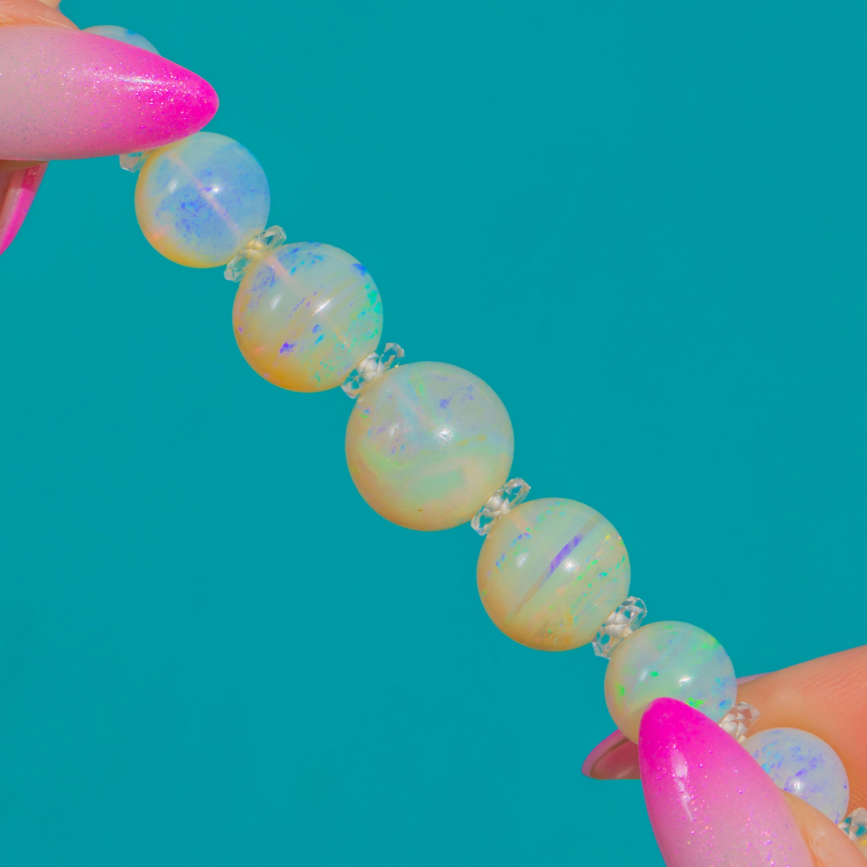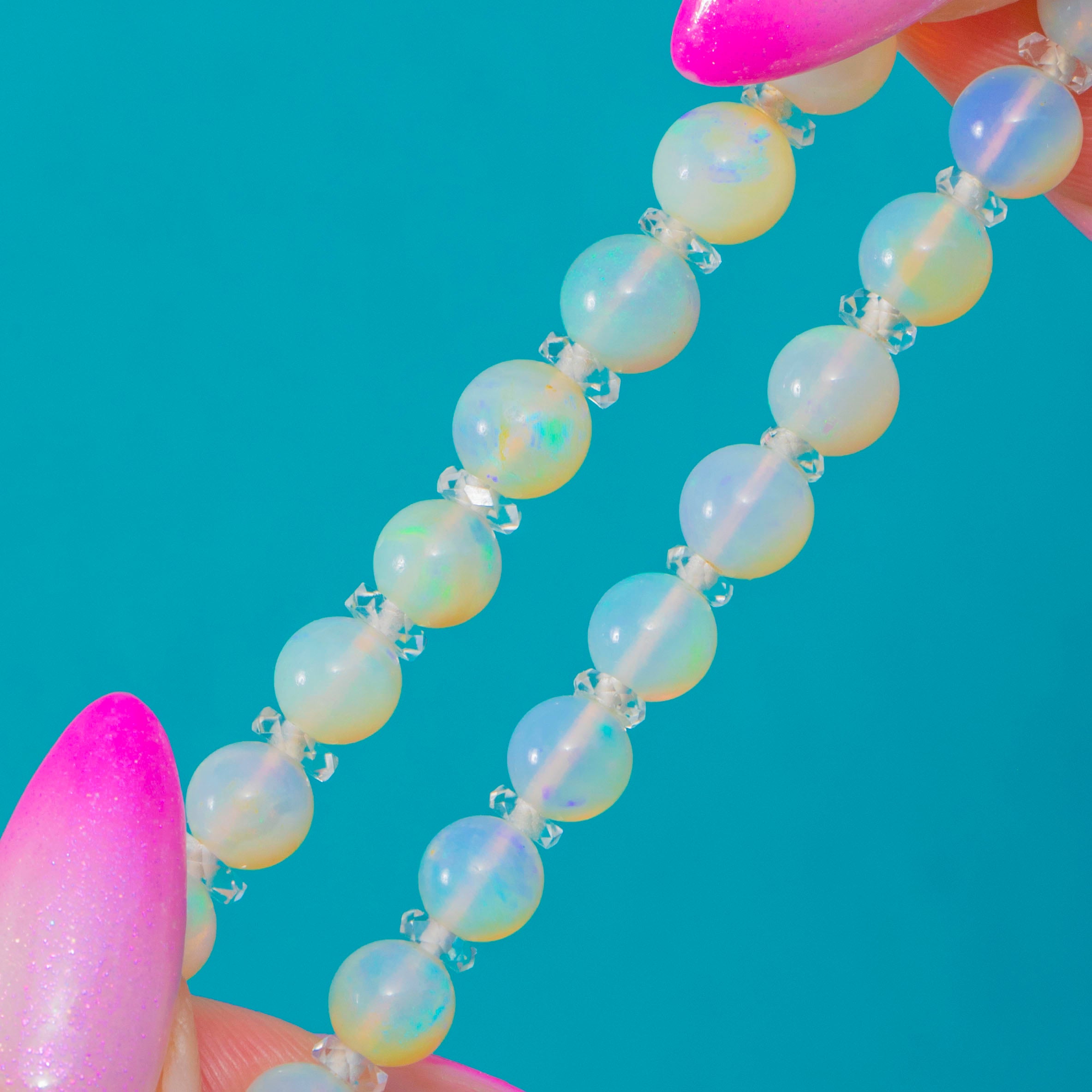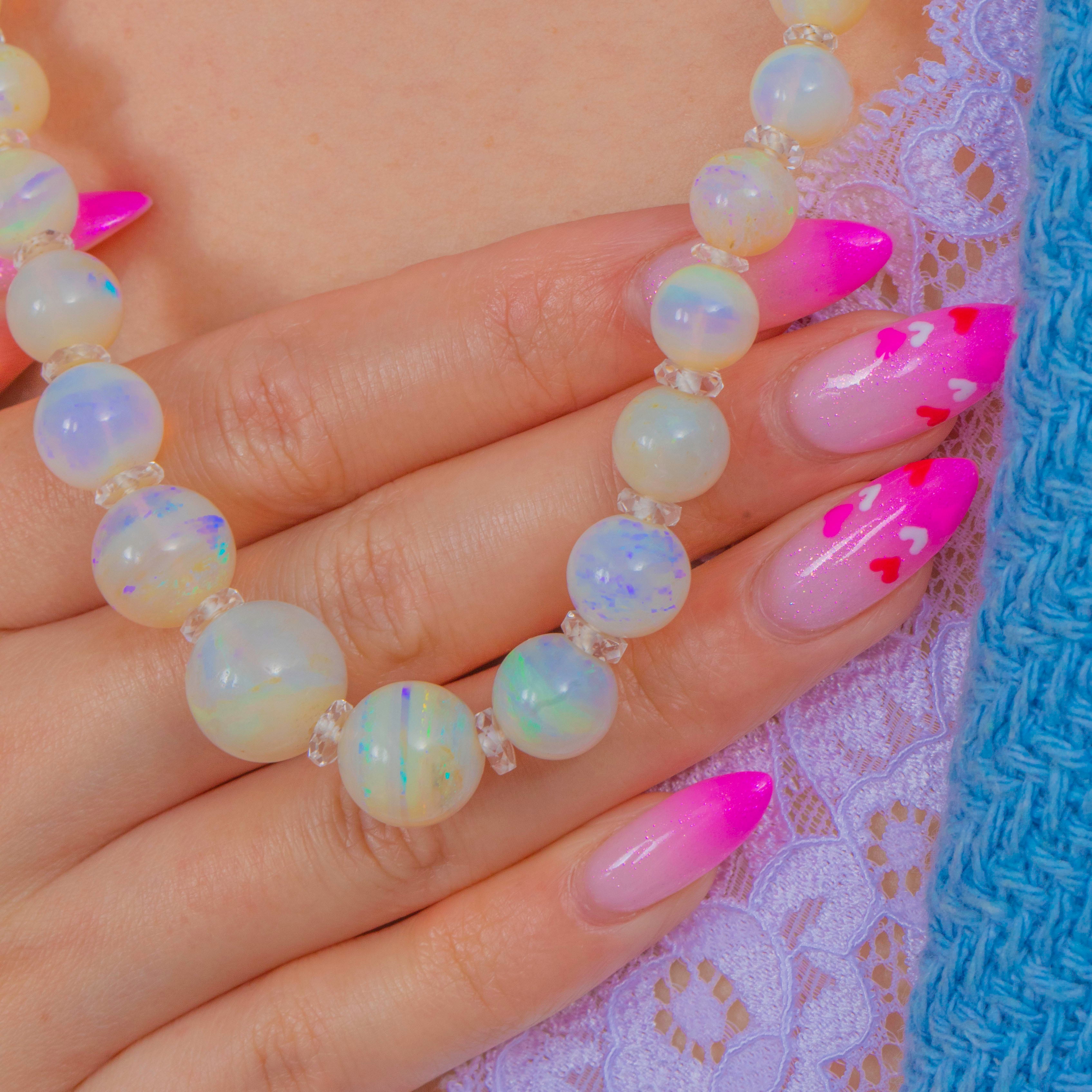 光り輝くArt Decoの気品を纏ったグラデーションオパールネックレス。柔らかなブルーやグリーンから繊細なピンク、ゴールドまで、幻想的な遊色効果が美しく揺らめきます。各球状オパールの間には、きらめくロッククリスタルのロンデルが配され、オパールの輝きにリズムと透明感、そして上品な煌めきを添えています。