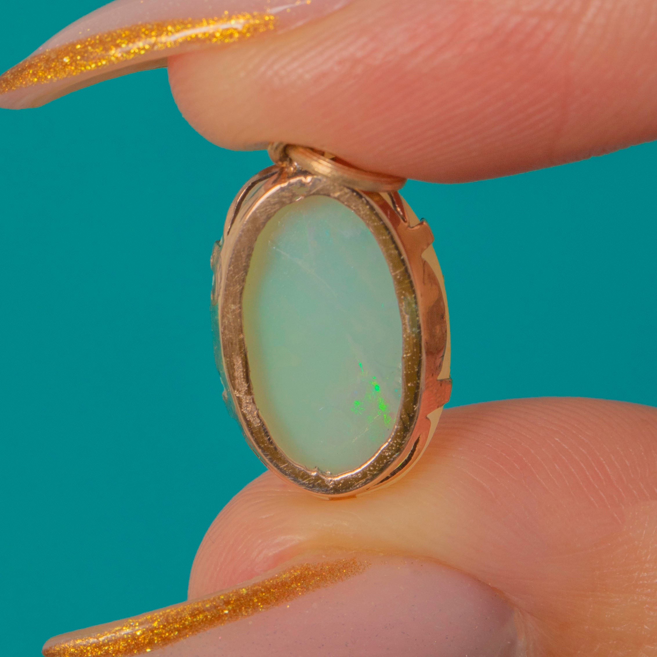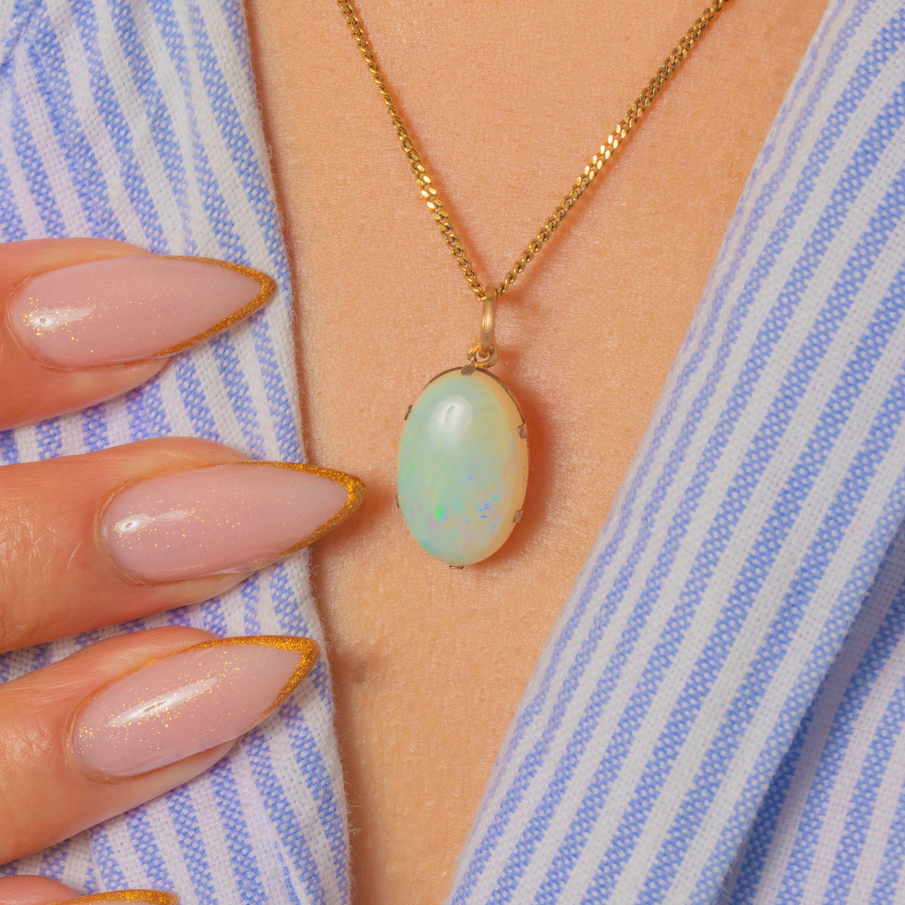 A striking Art Deco Opal charm showcasing a large 3.60ct natural solid Opal ablaze with colour. The gem displays a vivid play-of-colour that makes this piece truly captivating, shimmering with mesmerising flashes of green, blue, pink and orange.