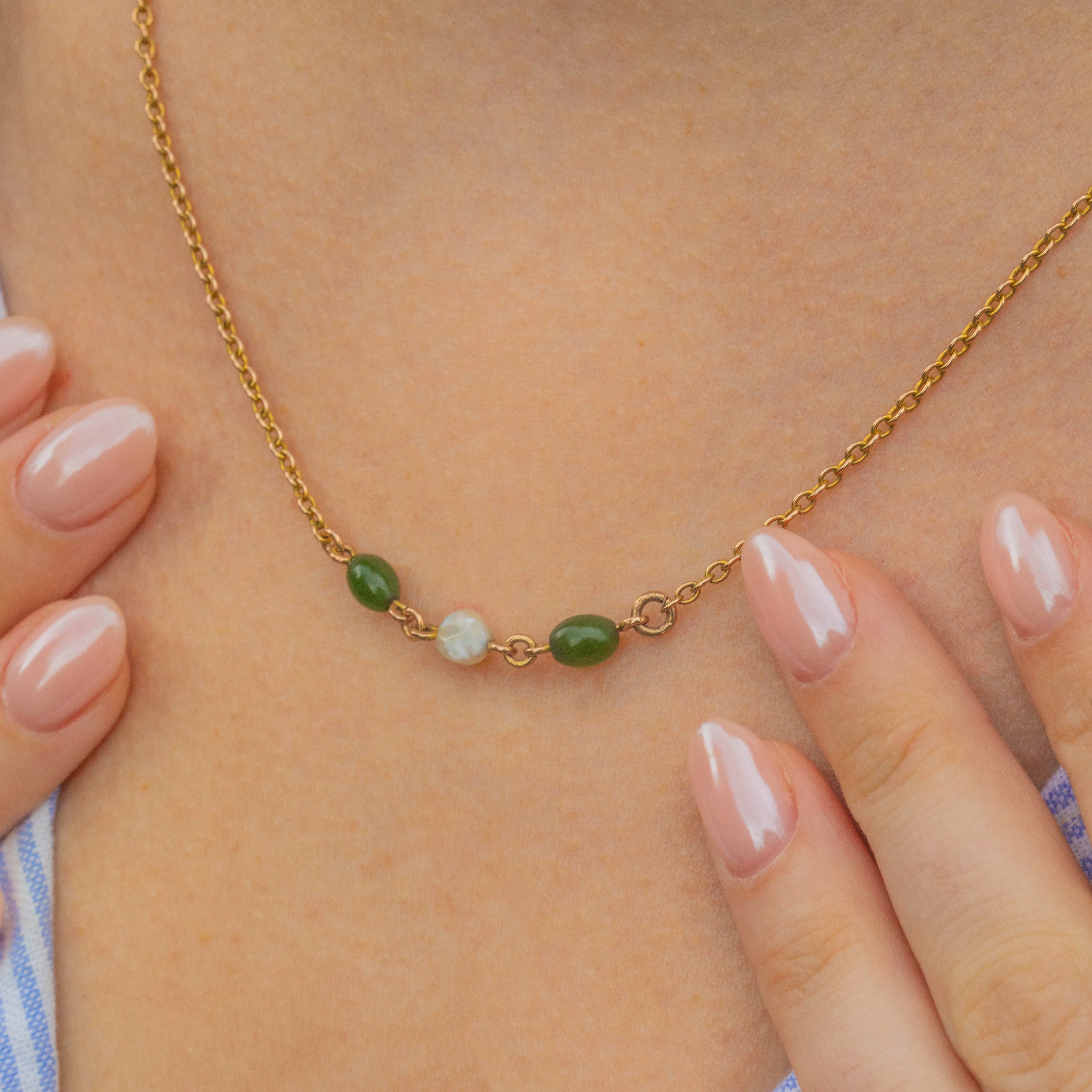 We adore the hues of olive green Jade, beautifully complimented by luminous white Pearls. This Victorian necklace wears at a longer length of 31", so it'll drape beautifully beneath the collar of your shirt or look sublime wrapped twice in a layered style!