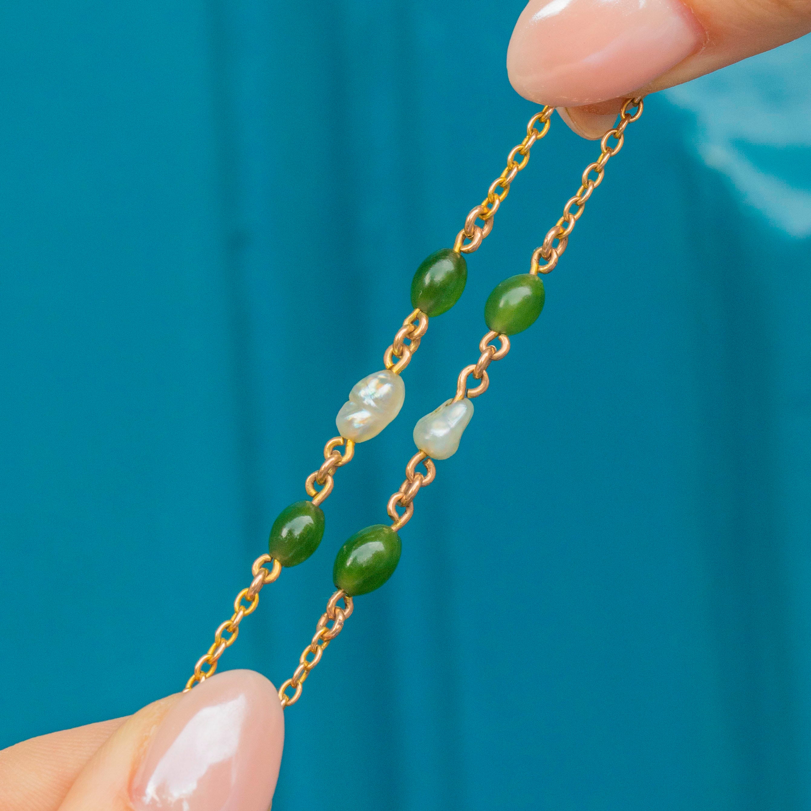 EXCELLENT. This 31" antique 9ct Gold Baroque Pearl & Jade necklace is in excellent condition. The Jade beads are smooth and the Baroque Pearls have their own unique texture, free from any chips or surface wear. The Gold is bright and buttery with a securely connected set of links. Don't waste a moment more in making this Victorian treasure yours!