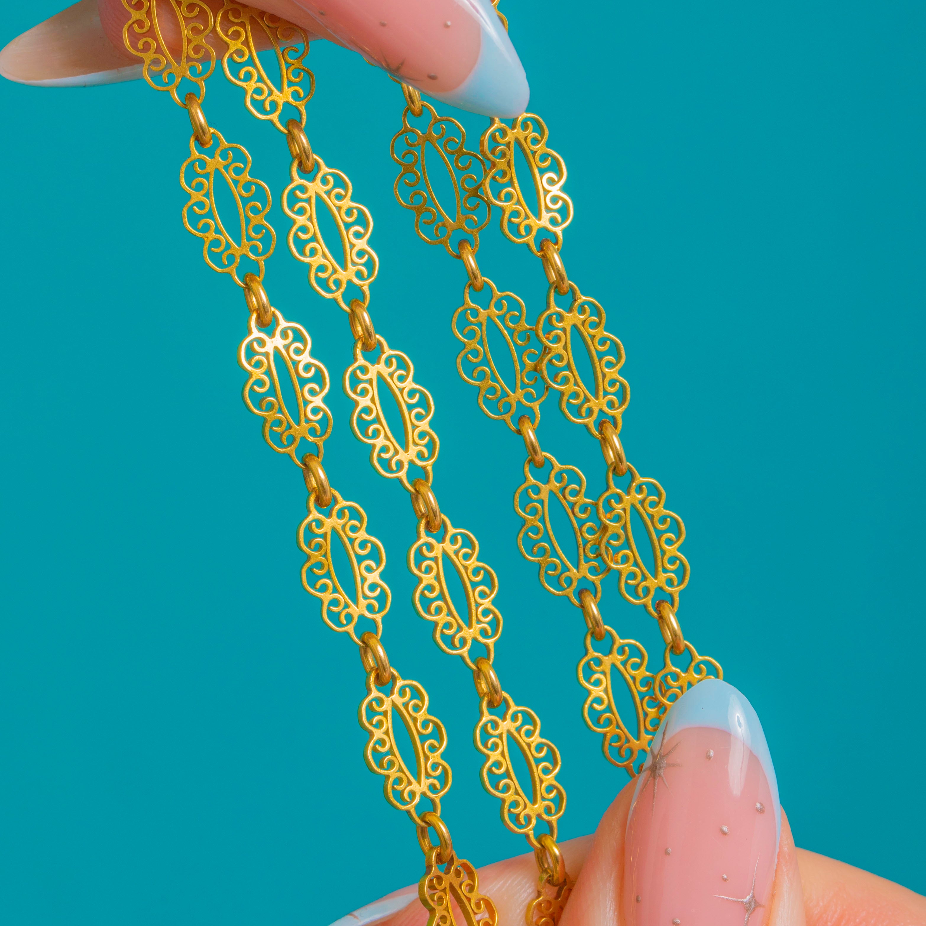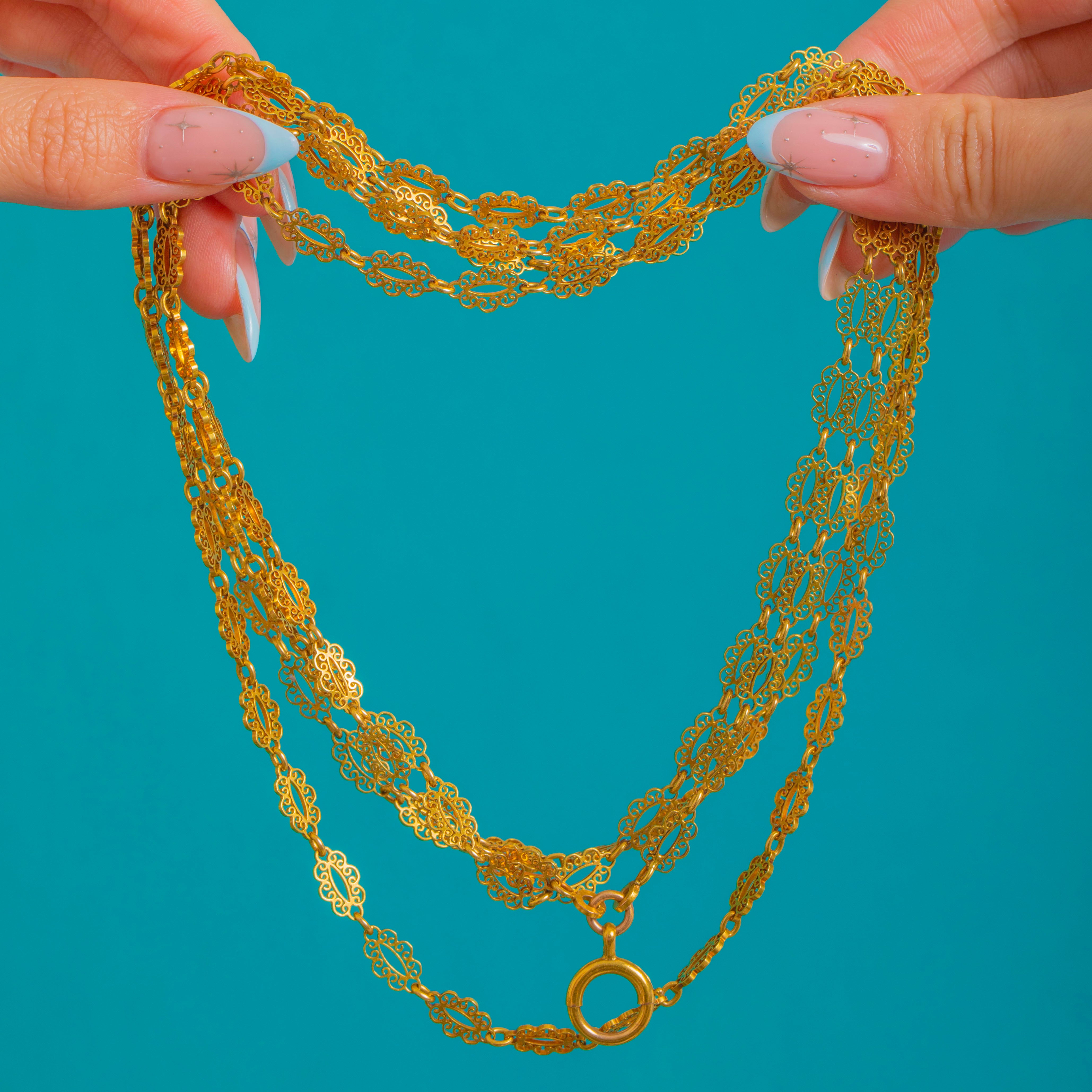 精緻なVictorian期フランス製十八金細工のガードチェーン。繊細な透かし細工のプレートが連なり、優美な唐草模様が流れるように配されています。レースのようなリンクが美しく連動し、上品で軽やかなシルエットを描き出し、繊細さと贅沢さを兼ね備えています。