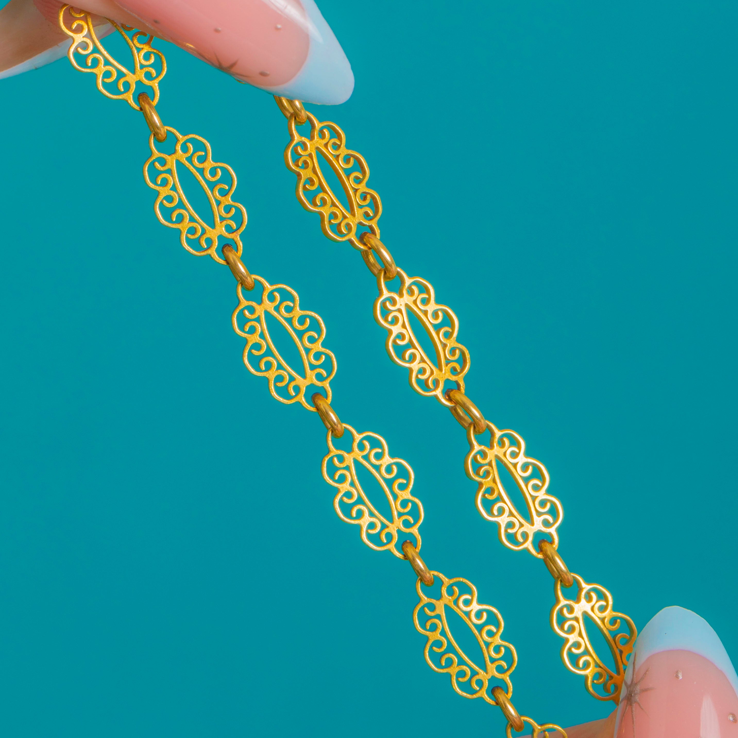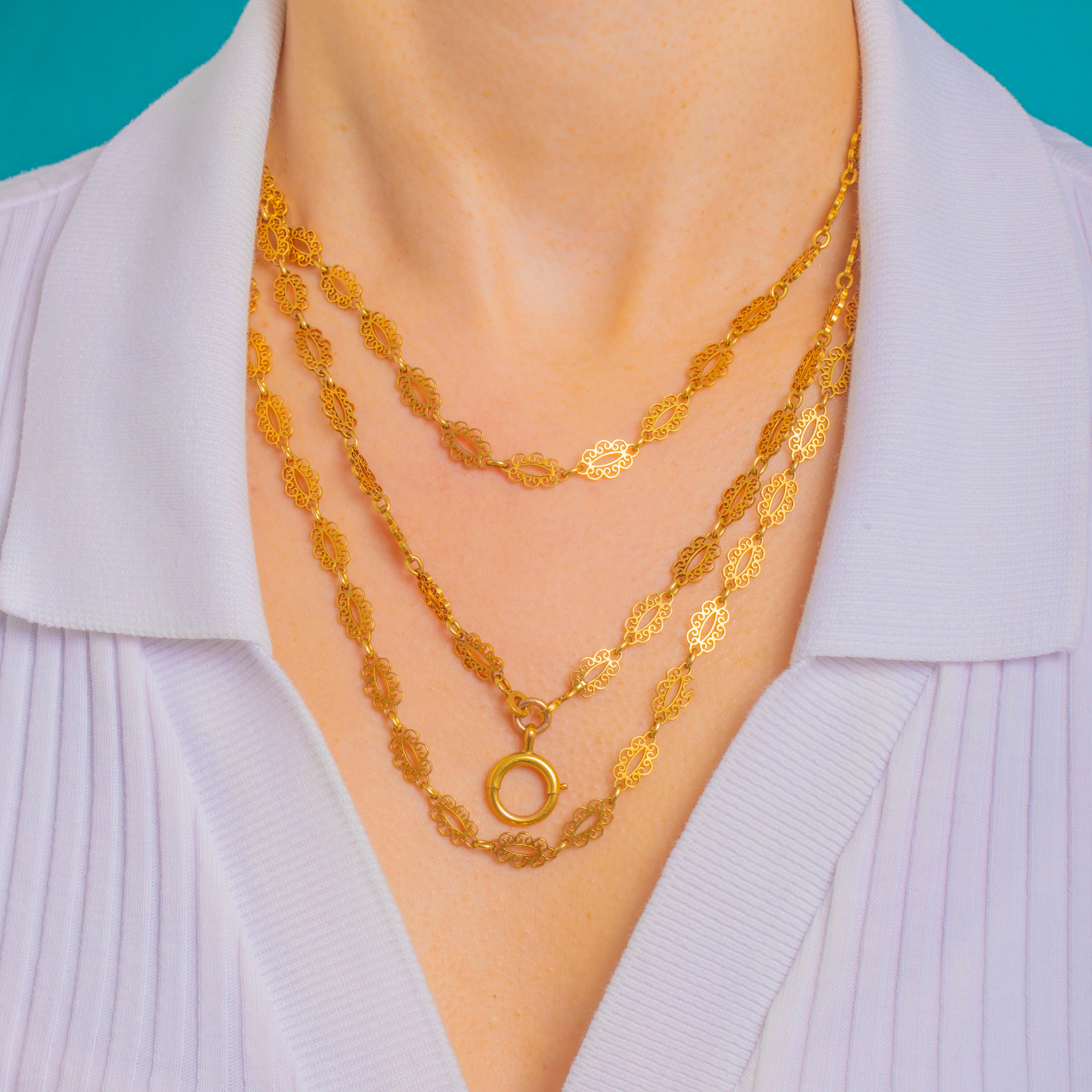 全長60インチ(約152.5cm)のこの存在感あるチェーンは、二重にも三重にも簡単に巻くことができ、中央に大きな円形のボルトリングが配されており、ロケットやペンダント、チャームを美しく引き立てます。重さは40.8gと堂々たる存在感がありながら、優雅で女性らしい軽やかさを保ち、日常使いにも最適な格別のアンティークジュエリーです。