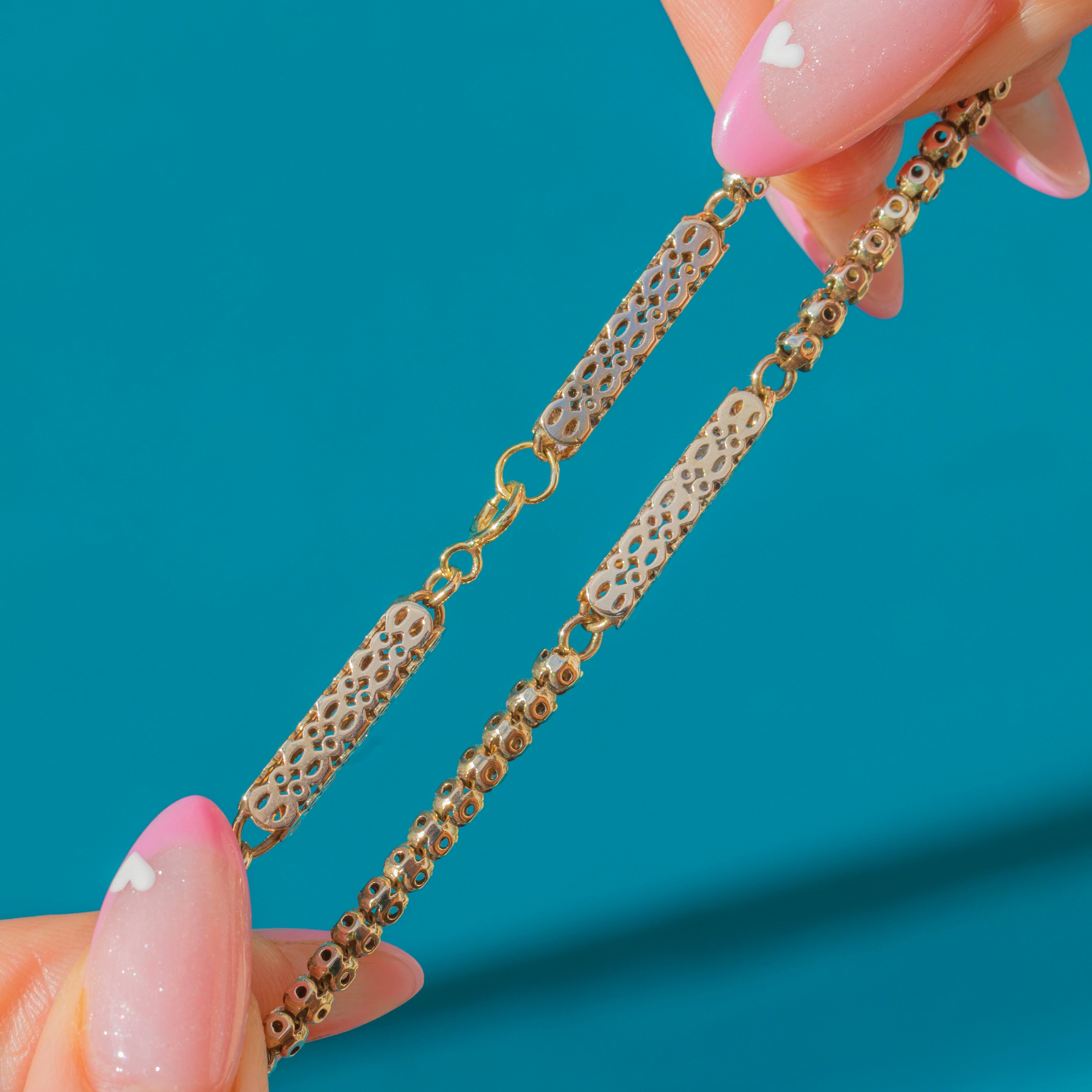 A beautiful Victorian chain bracelet crafted in 9ct Gold, featuring alternating pierced and box-style links. The intricate openwork gives the bracelet a light, lacy feel while maintaining a refined, elegant look characteristic of late 19th-century design.