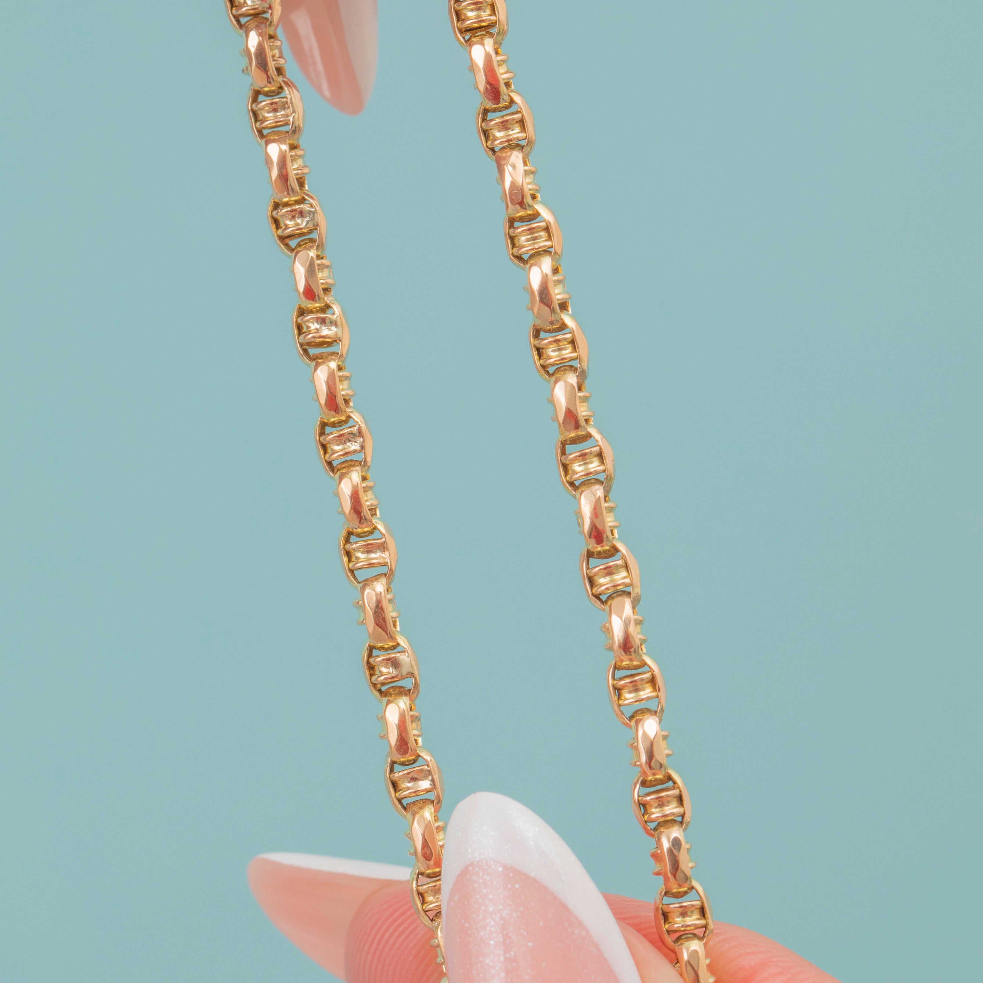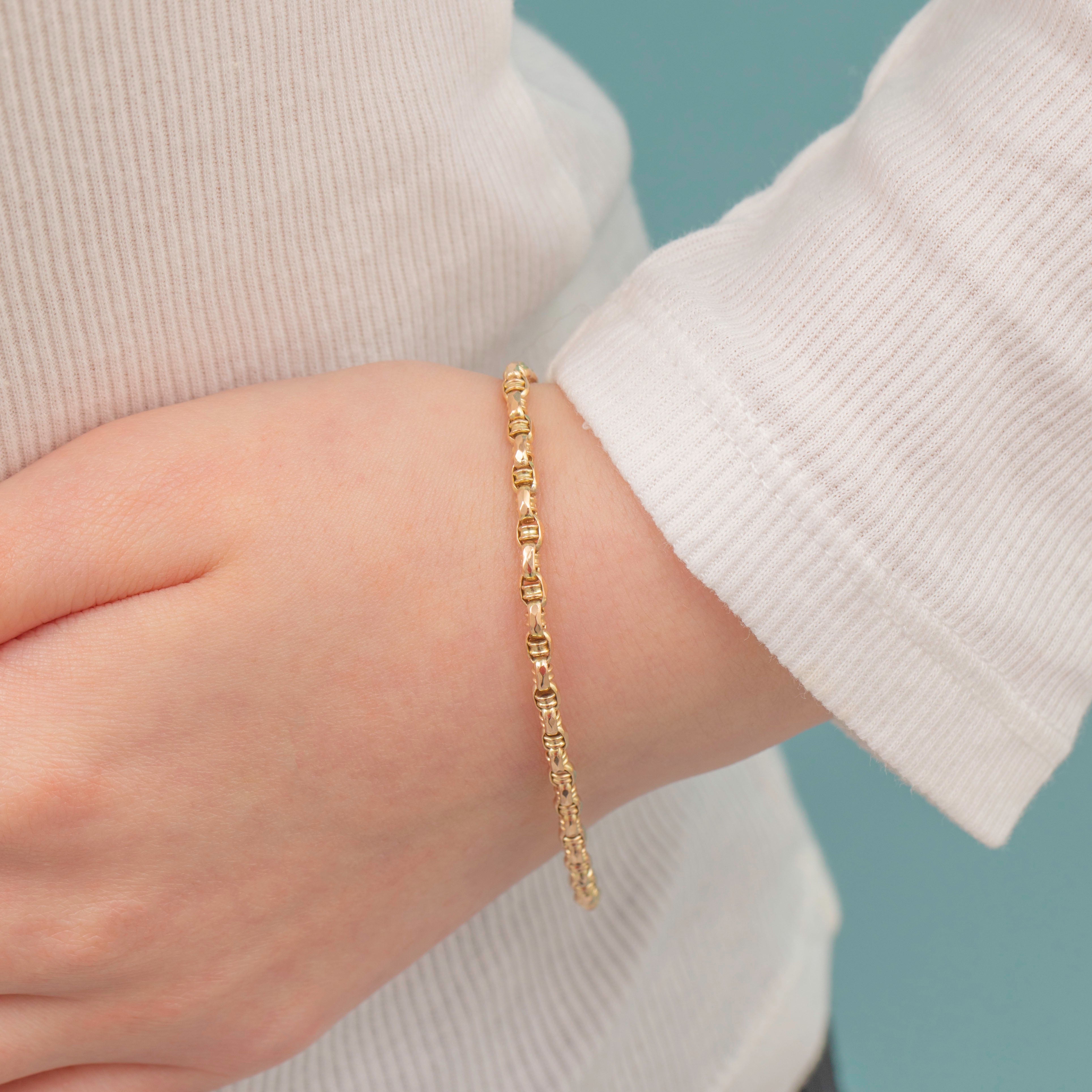 This antique 9ct Gold fancy link bracelet is in high demand! Crafted from glossy 9ct Gold, this Victorian bracelet features softly faceted belcher links with intricate links inside, providing a unique texture to this chain.
