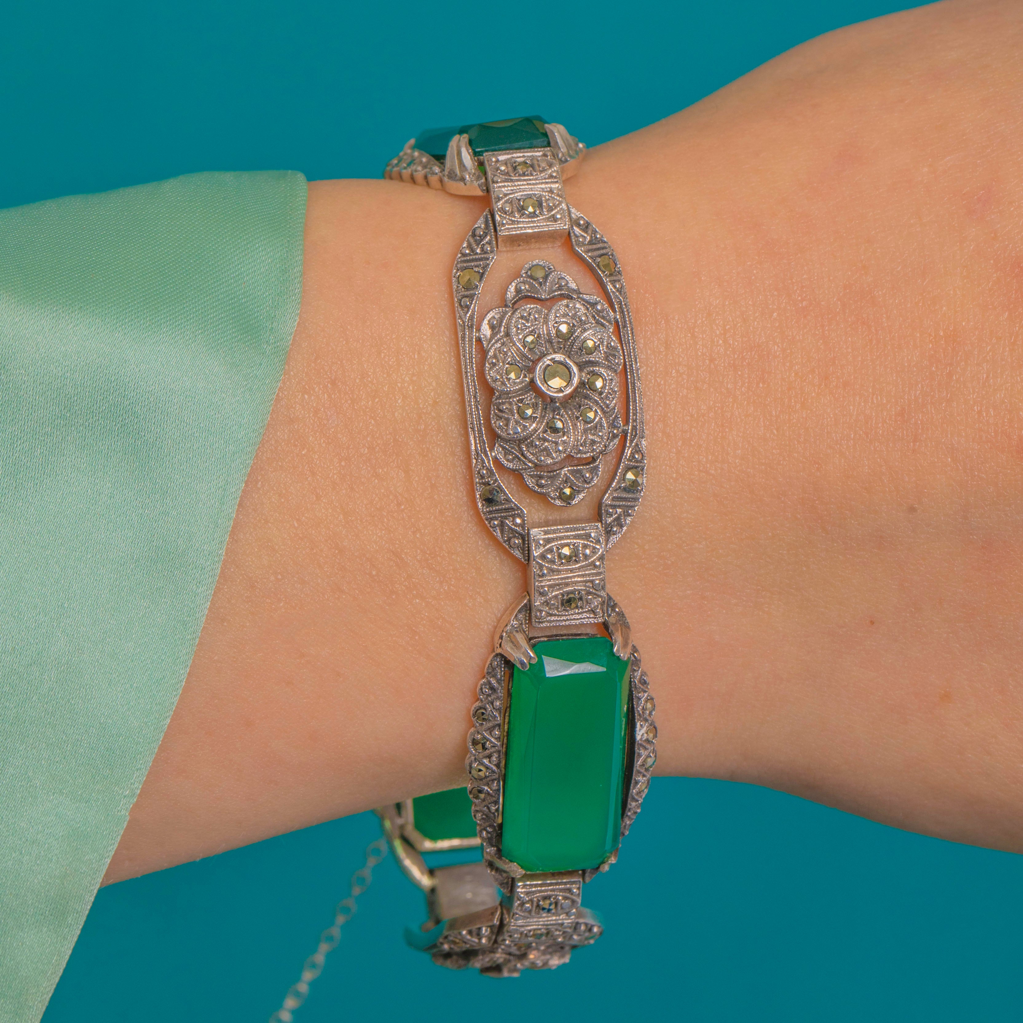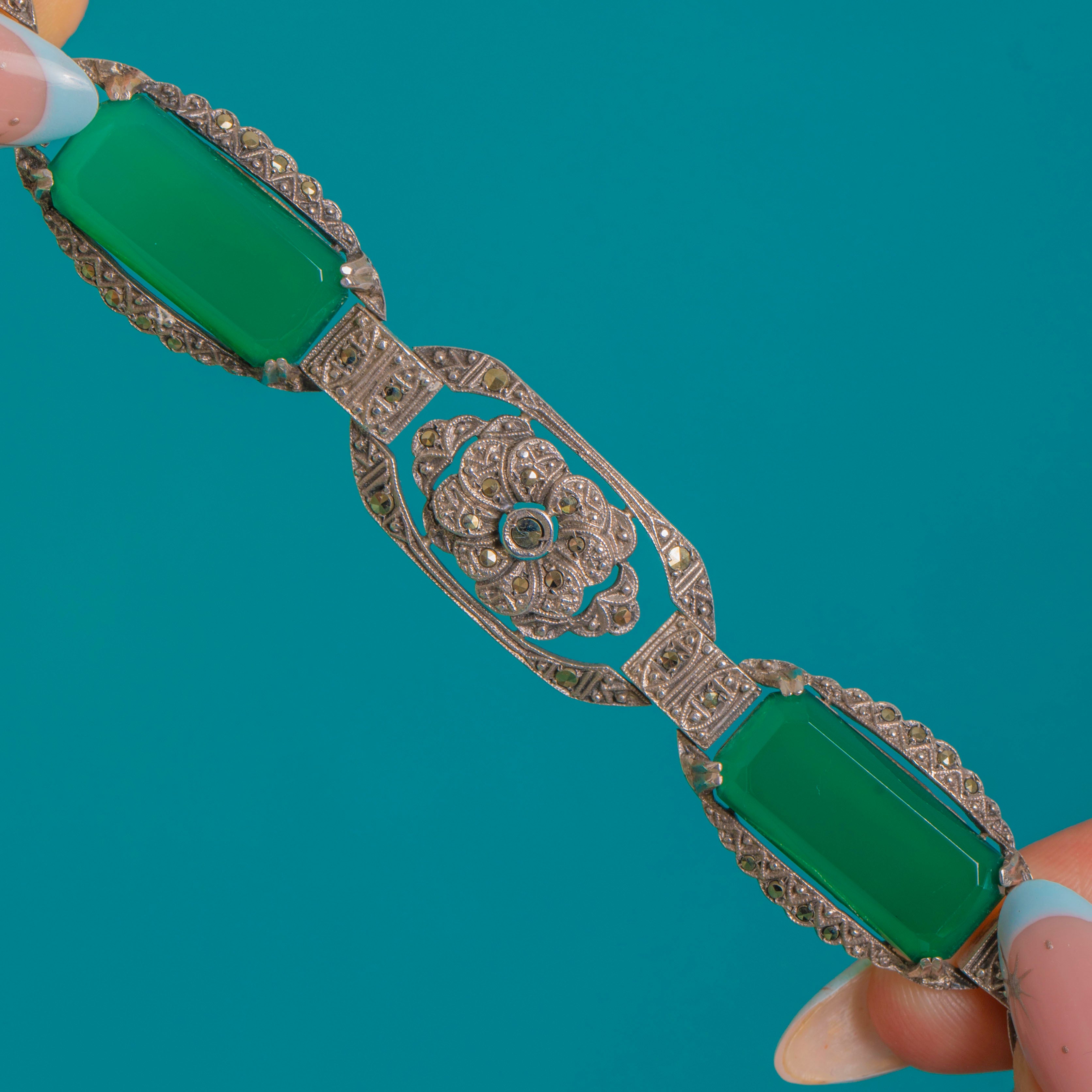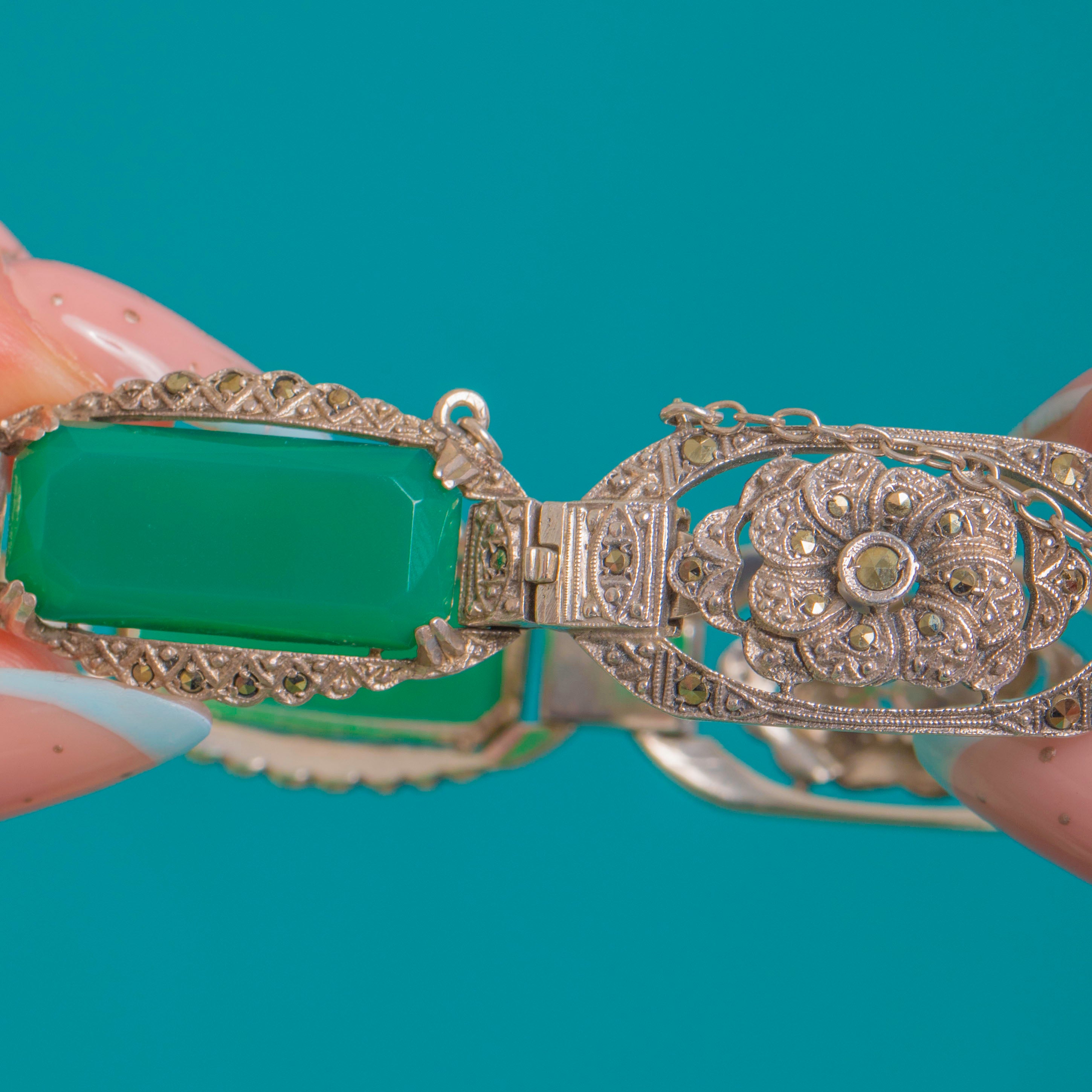7" Antique Art Deco Green Chrysoprase Marcasite Flowers Bracelet
