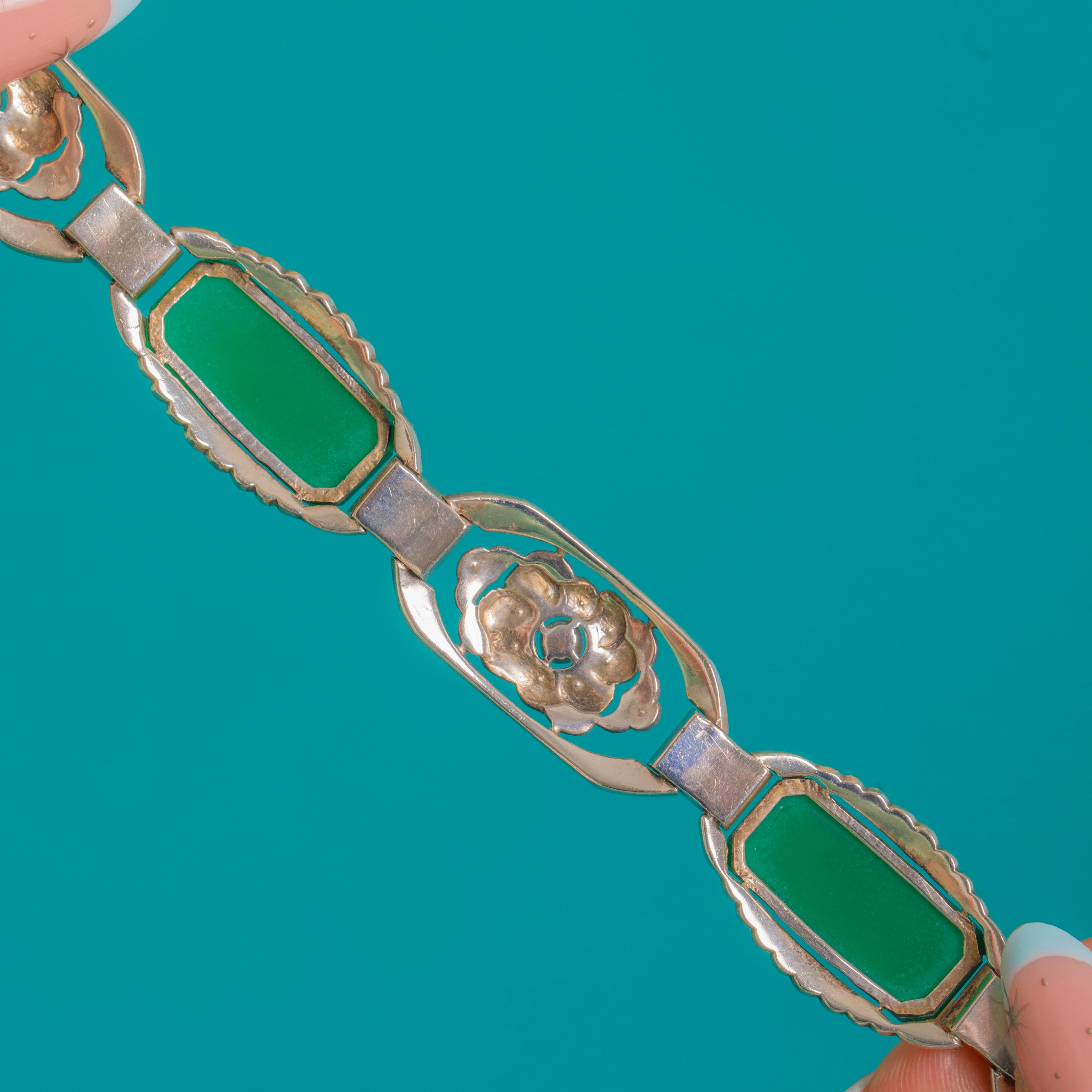A quintessential Art Deco bracelet, this articulated panel design pairs vivid Green Chrysoprase tablets with ornate openwork plaques for a look that’s both geometric and romantic. The rectangular Chrysoprase panels glow a saturated green, framed by fine milgrain that catches the light with subtle sparkle. Stylised floral rosettes soften the clean lines, giving a chic, feminine finish.