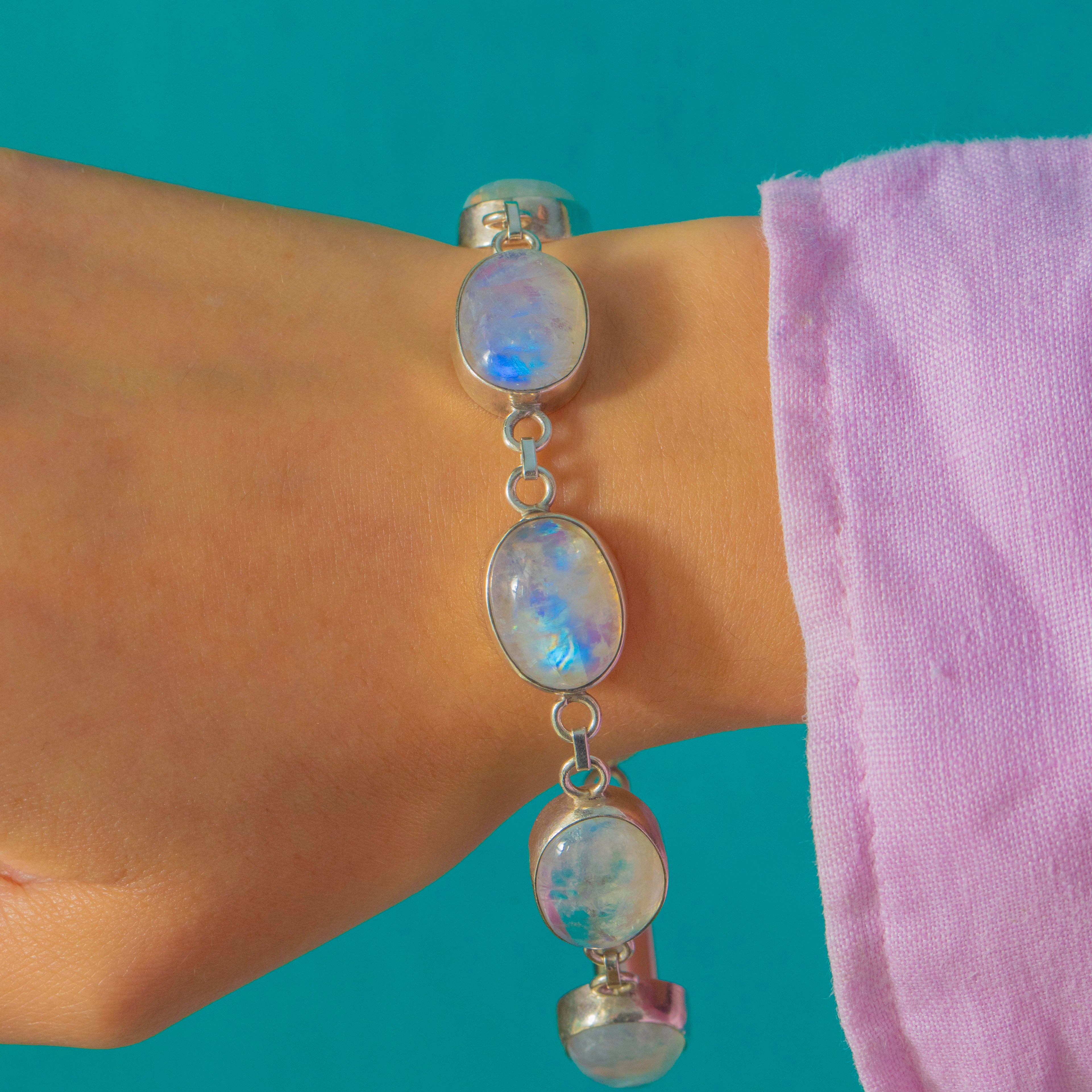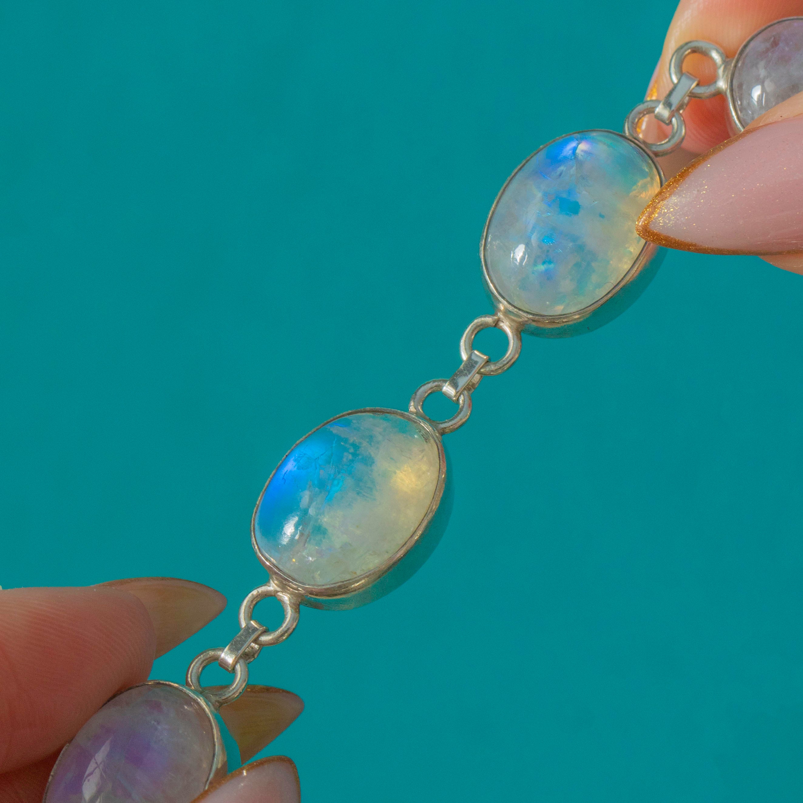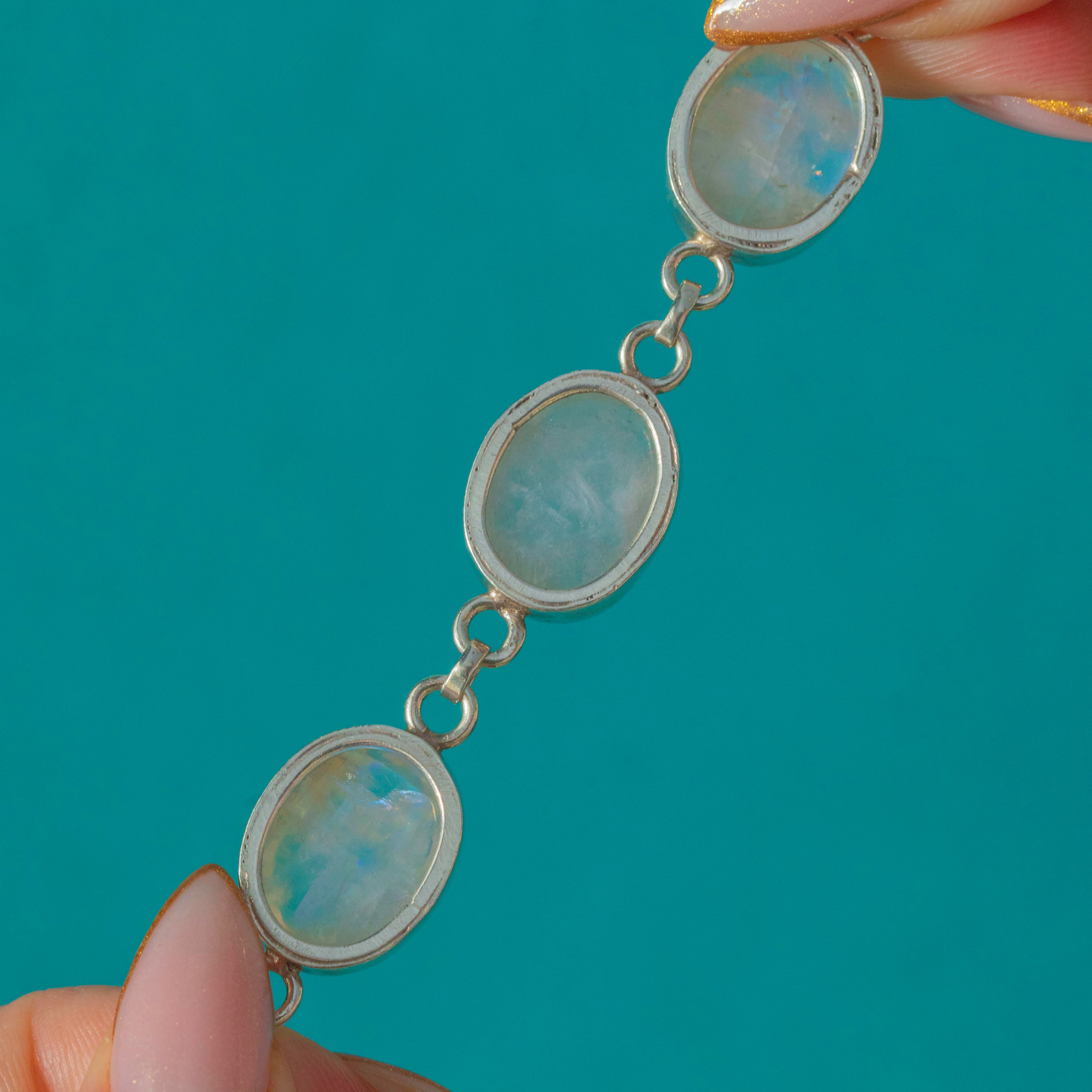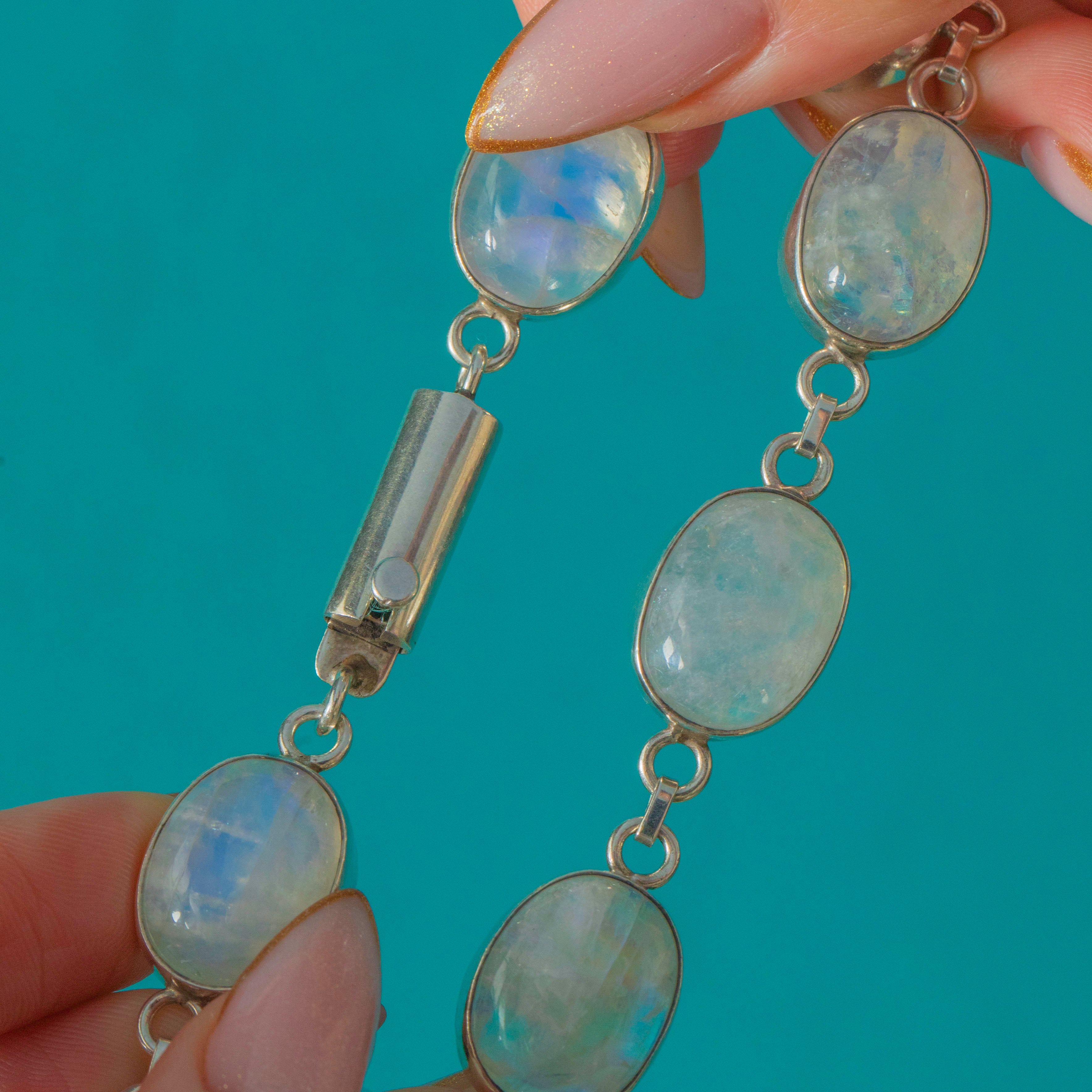 This vintage Silver Labradorite bracelet is full of moody, shifting colour. Each oval cabochon shows beautiful flashes of blue, green and gold as it moves, giving the bracelet an almost mystical glow on the wrist.