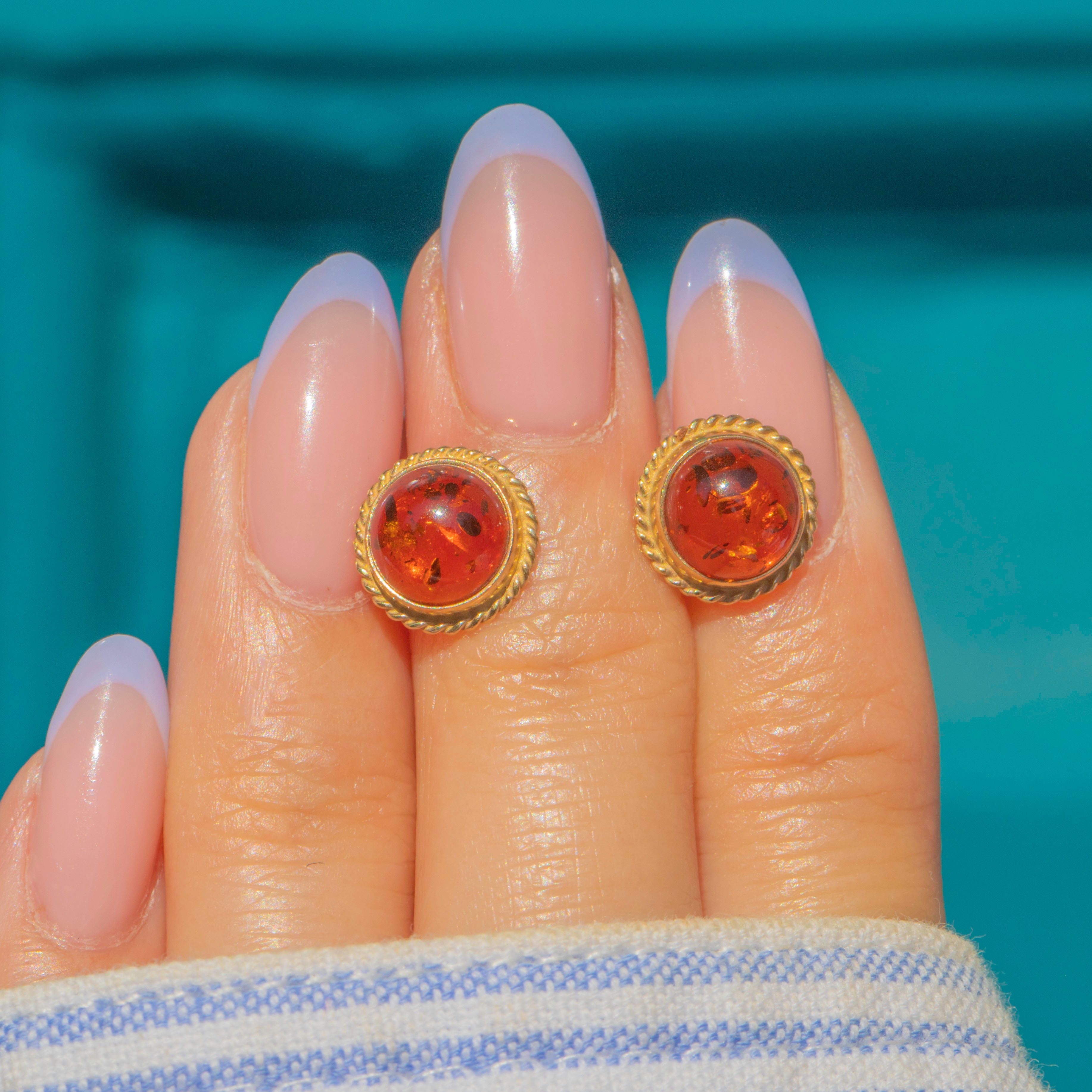 These 9ct Gold Amber round stud earrings are akin to pools of marmalade! Smooth Amber cabochons flaunting tangy tangerine hues sit snug within 9ct Gold bezel settings, boasting beautiful natural inclusions at their core.