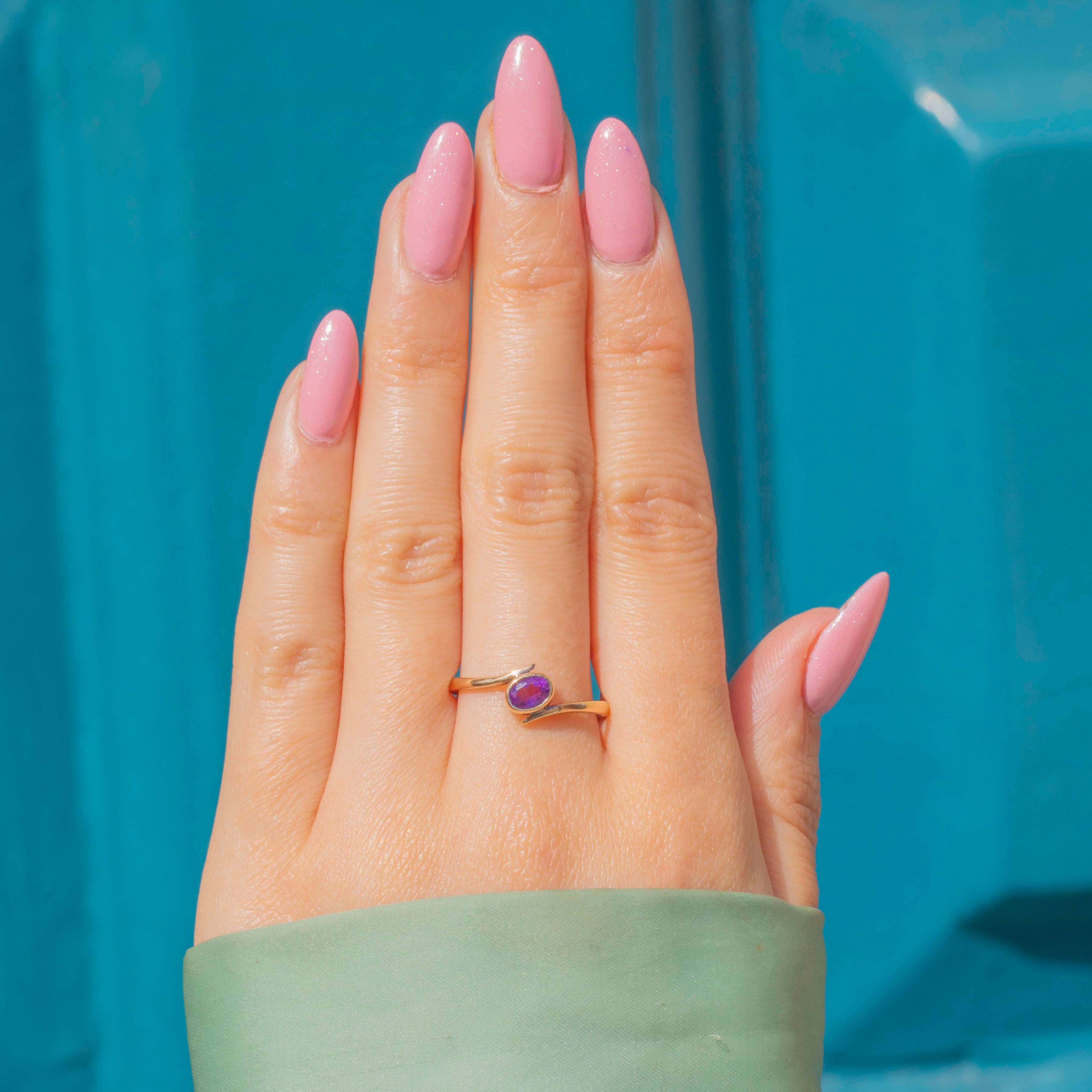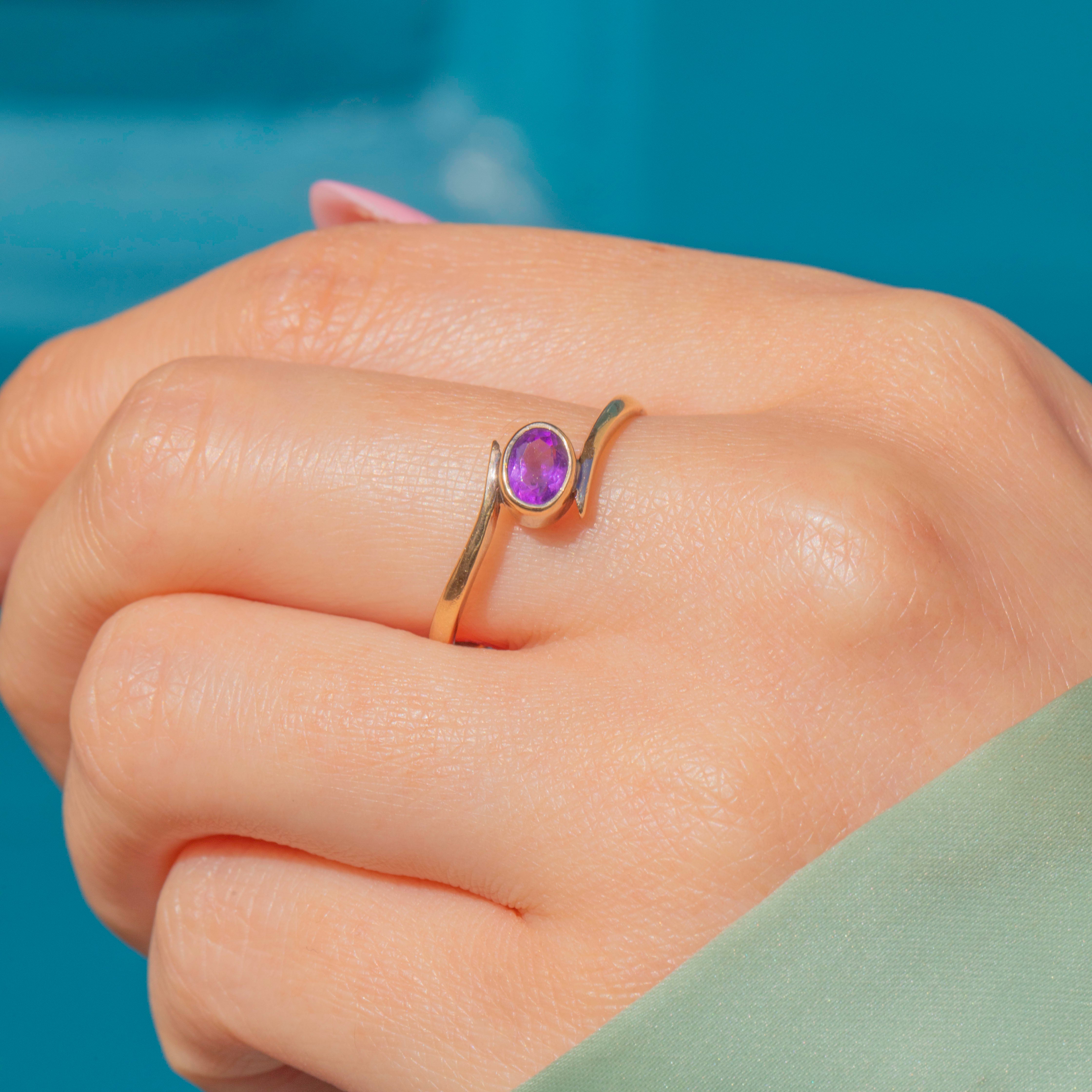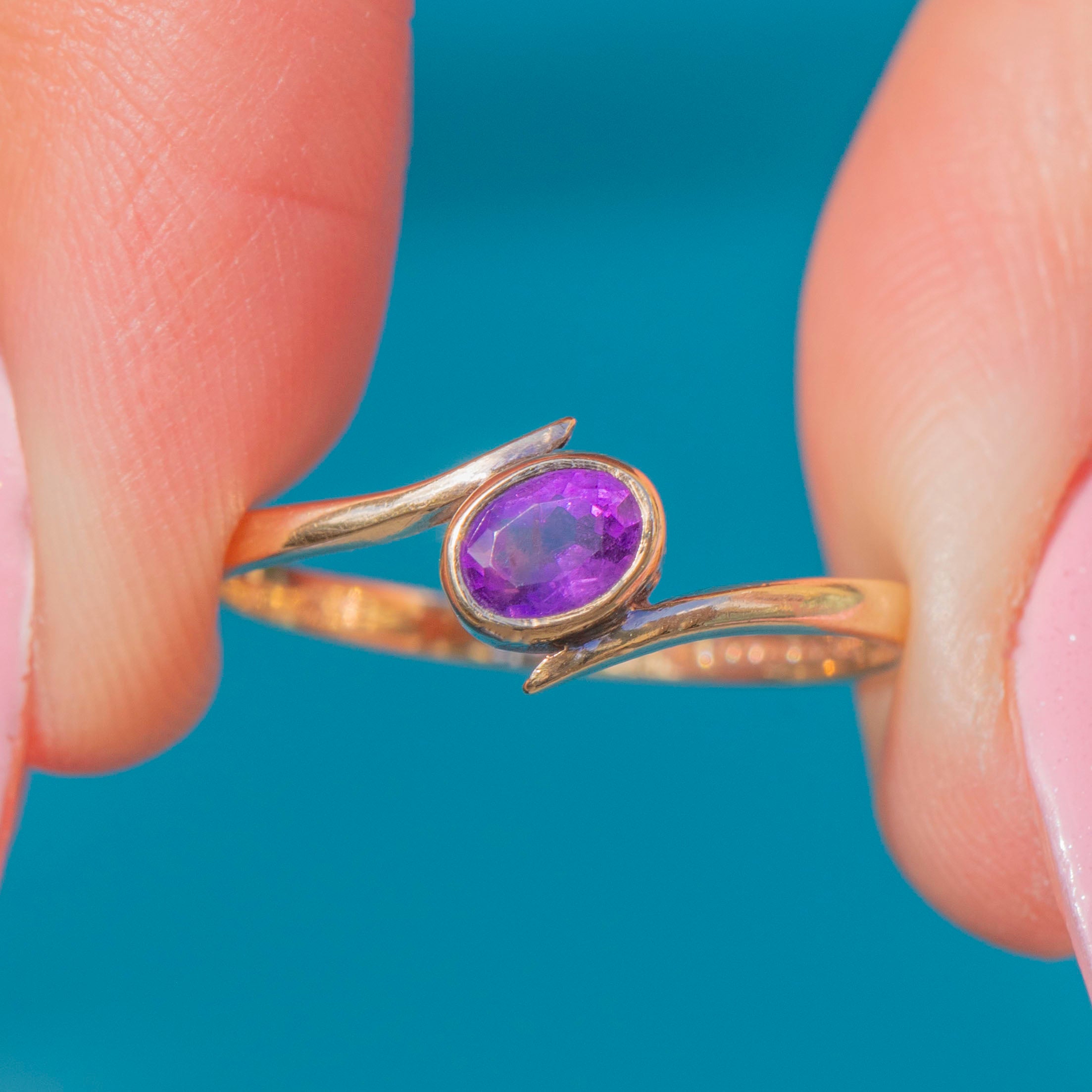 The Gold band curves around the oval-cut Amethyst in a classic bypass design, its asymmetrical form looking striking adorning your hand. Bypass rings traditionally symbolise two people coming together as one, making this vintage Amethyst ring a lovely choice to gift as a token of love!