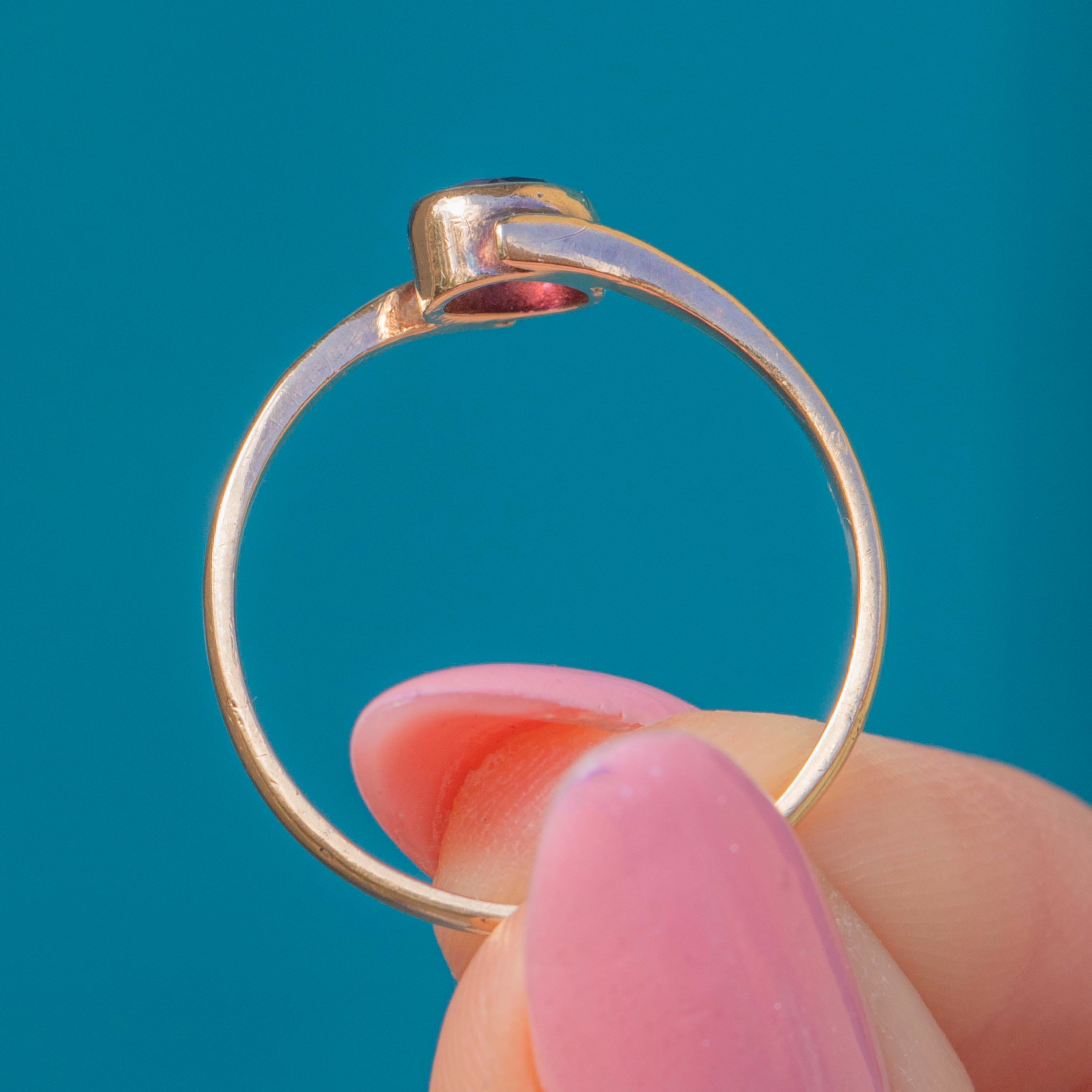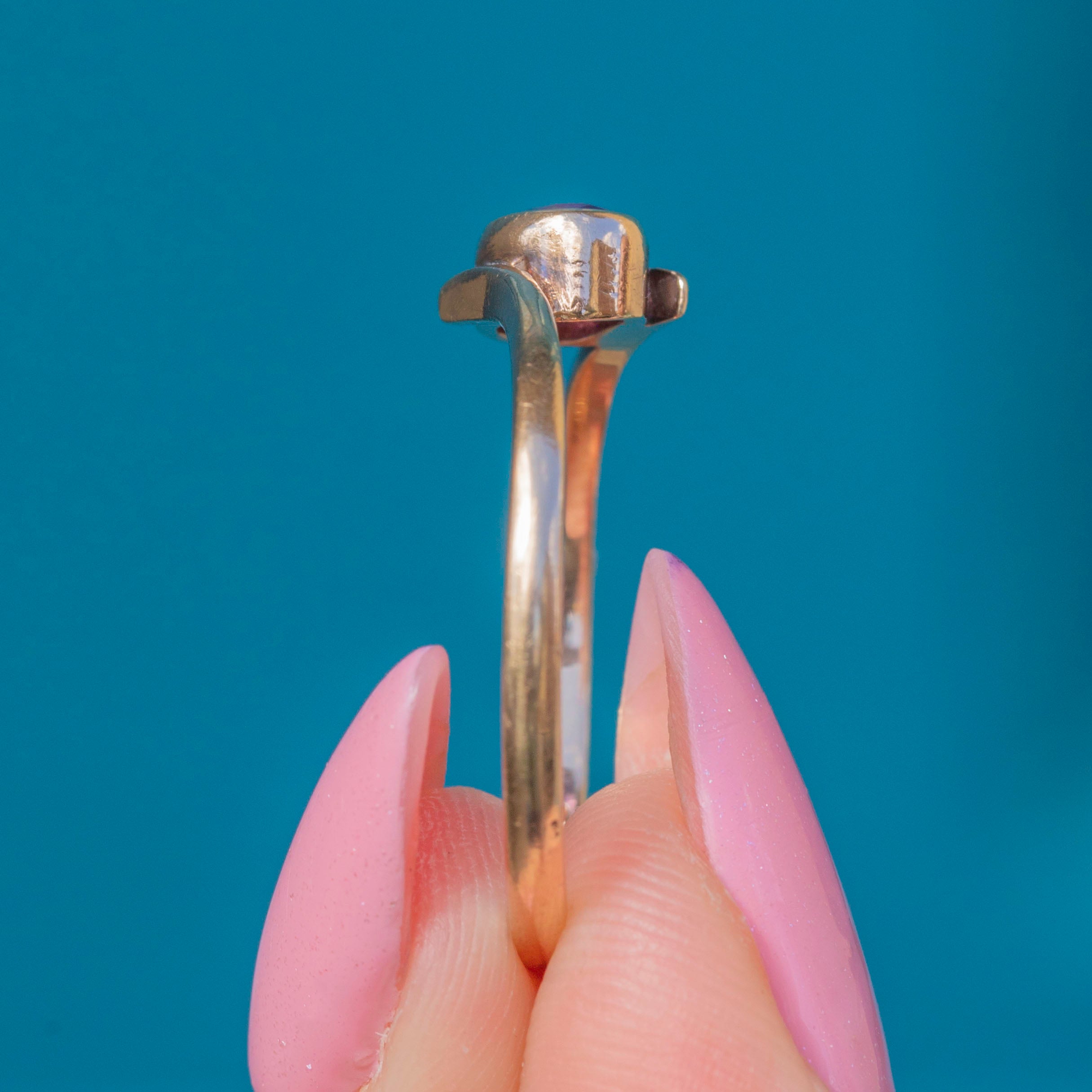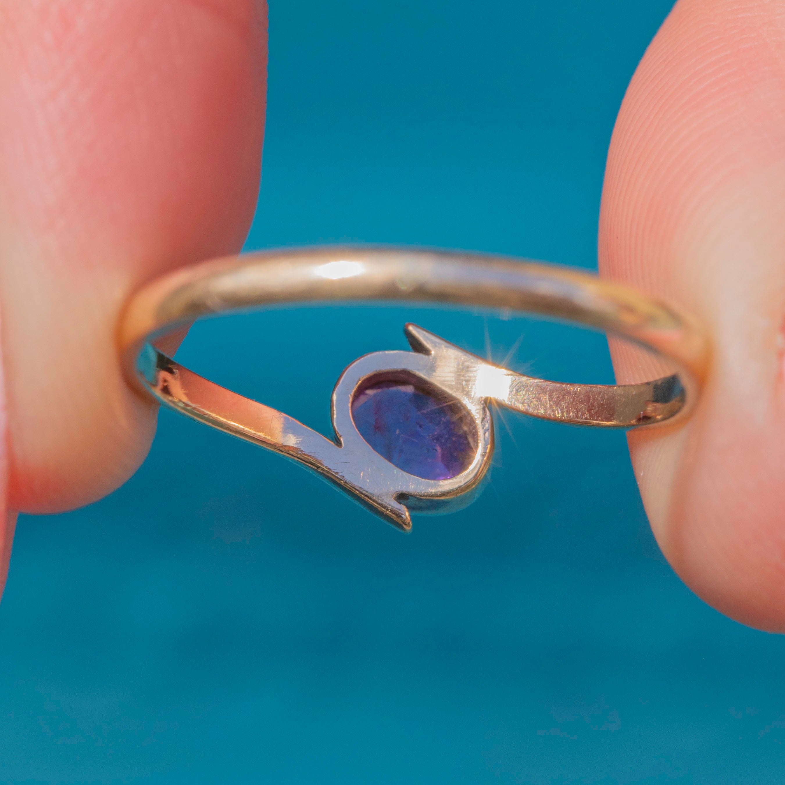 The Gold band curves around the oval-cut Amethyst in a classic bypass design, its asymmetrical form looking striking adorning your hand. Bypass rings traditionally symbolise two people coming together as one, making this vintage Amethyst ring a lovely choice to gift as a token of love!