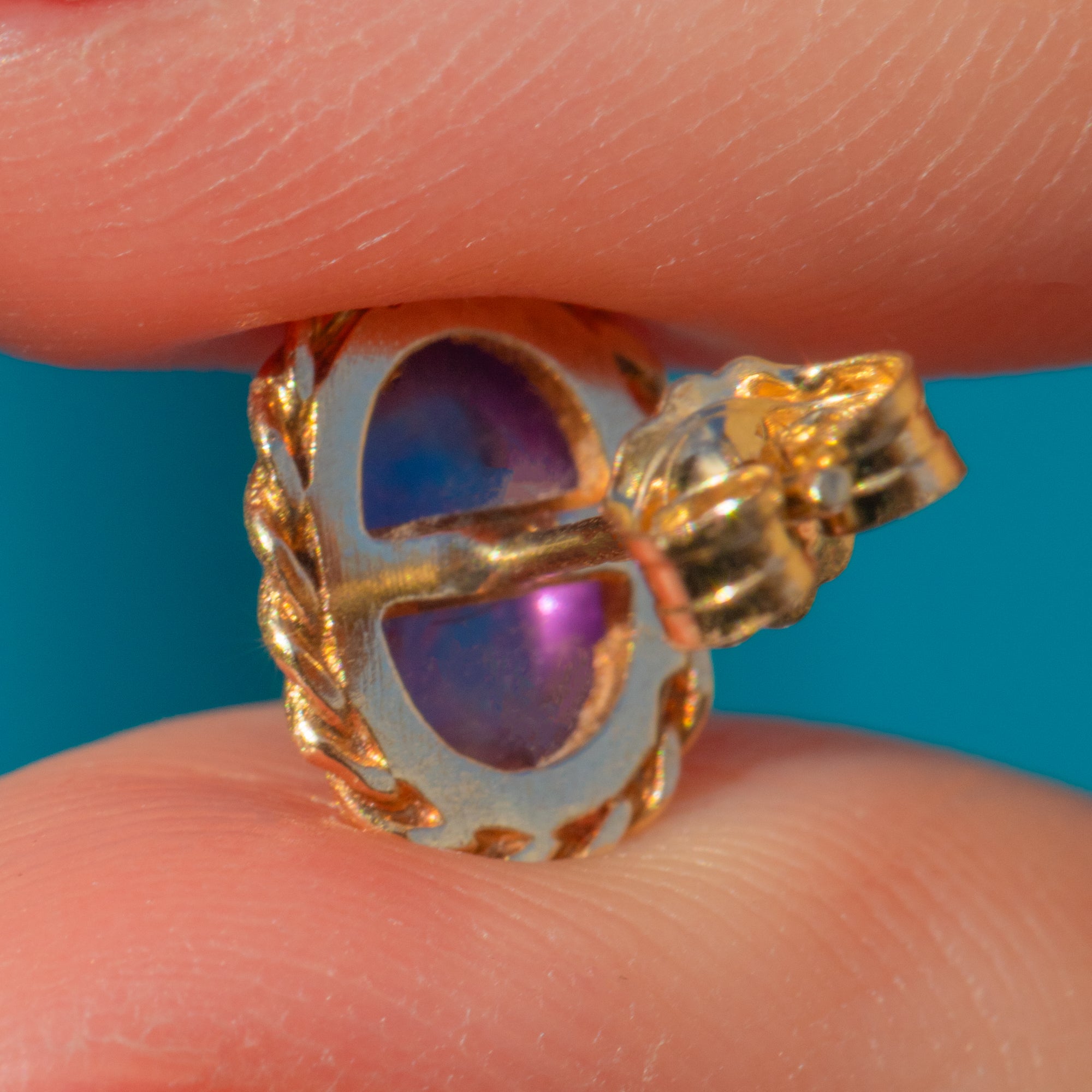 Add a pop of colour to your lobes with these gorgeous 9ct Gold Amethyst cabochon stud earrings! Rich in hues of lavender and lilac, these vintage stud earrings capture the light beautifully, exuding sophistication and charm.