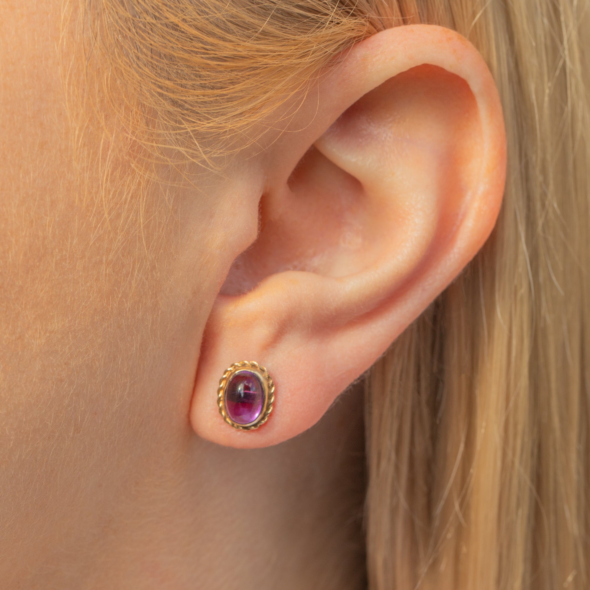VERY GOOD. These 9ct Gold Amethyst cabochon stud earrings are in great condition. The Amethyst cabochons capture the light wonderfully, sitting securely within their intricate bezel settings, and are free from any scratches or nibbles. There are some minor signs of wear to the Gold bezels, however this is unnoticeable when wearing and does not detract from the beauty of these vintage earrings. These vintage Amethyst earrings are a must-have!