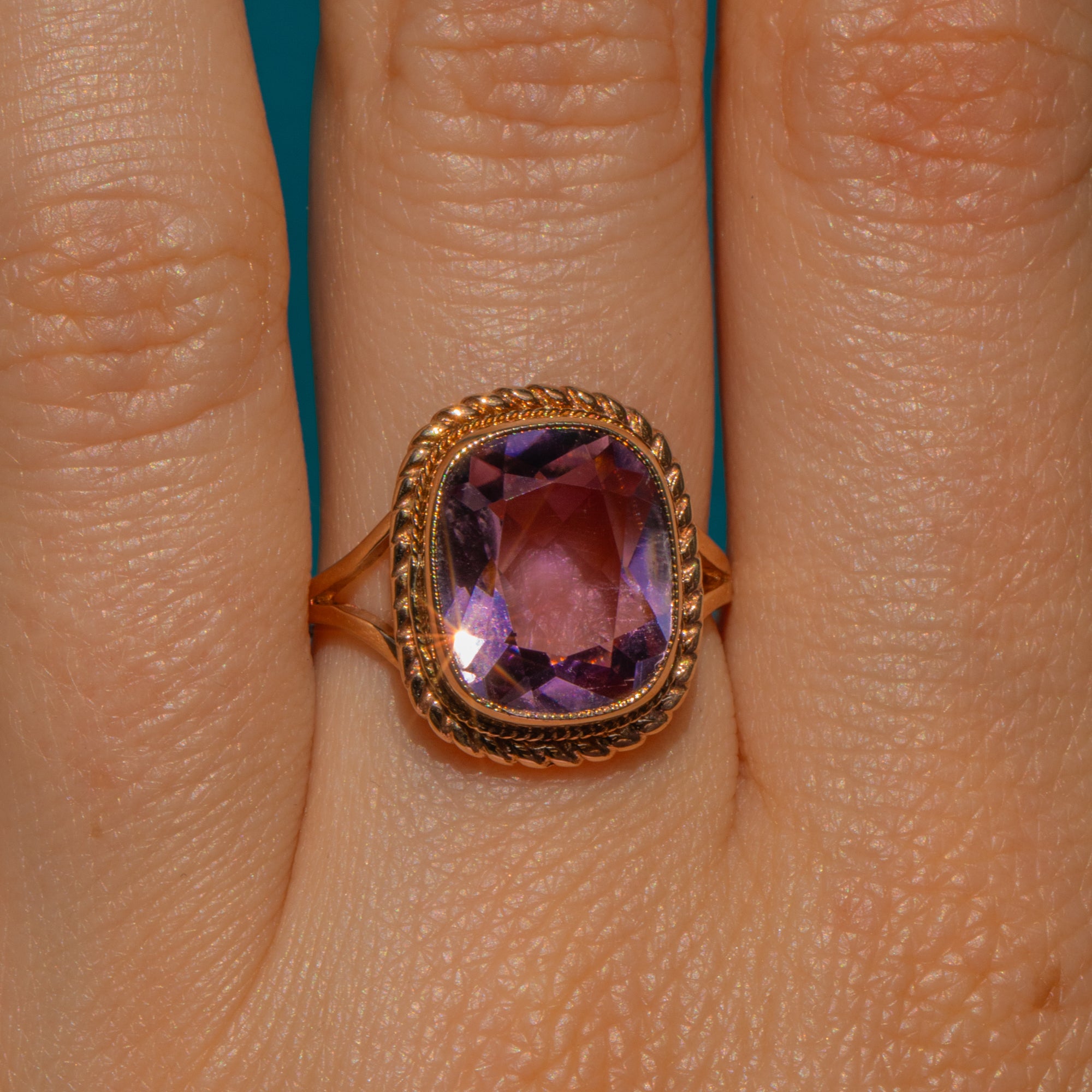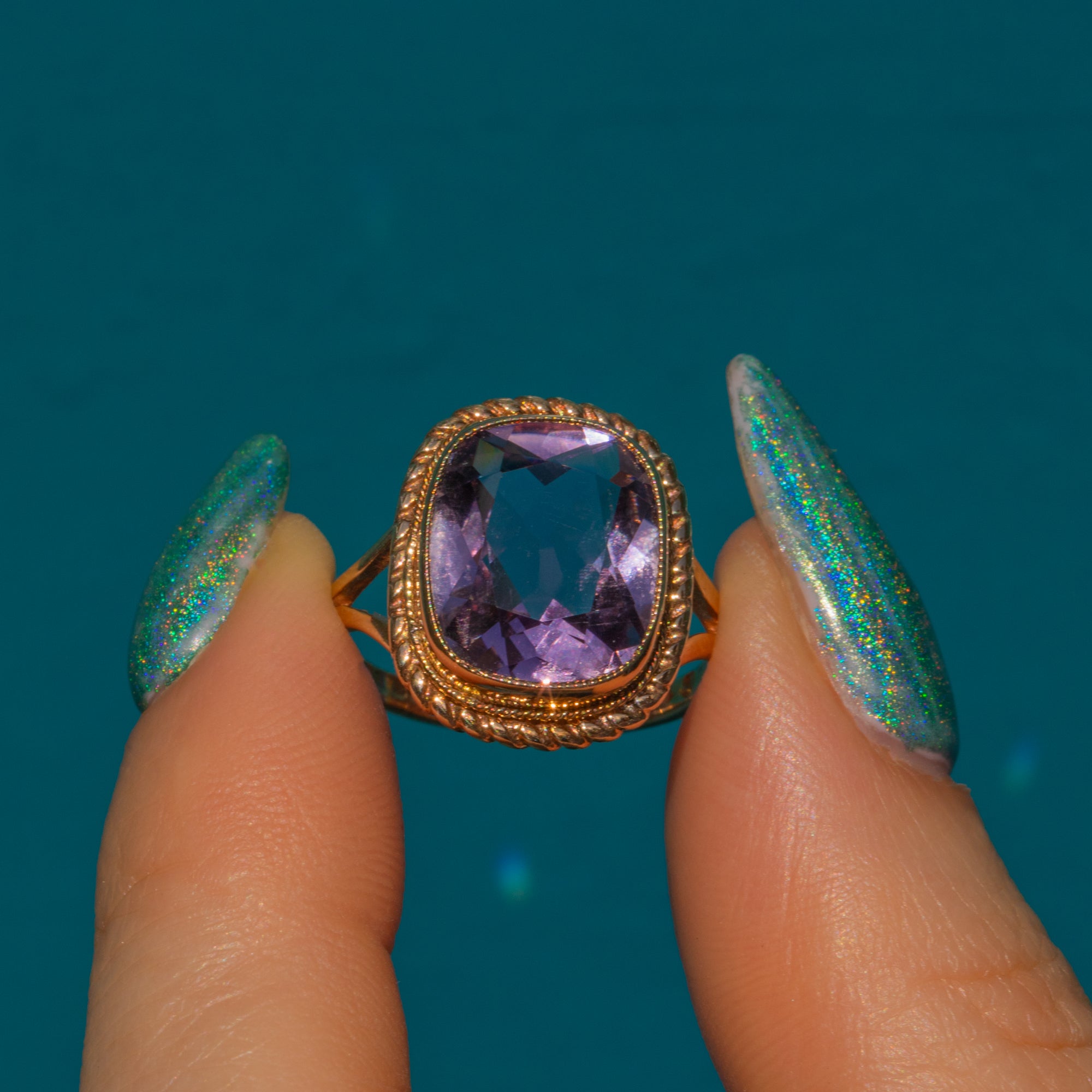 EXCELLENT. This 9ct Gold Amethyst cocktail ring is offered in excellent condition! The Amethyst is pristine with no chips or abrasions and securely held within its bezel setting. The Gold is buttery and the band has retained its form well with a full set of hallmarks still visible on the inside.