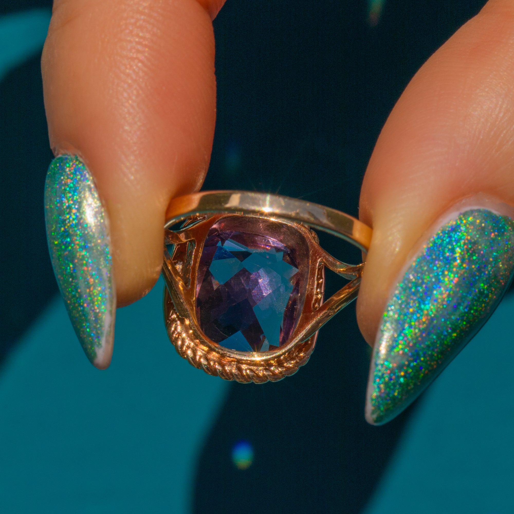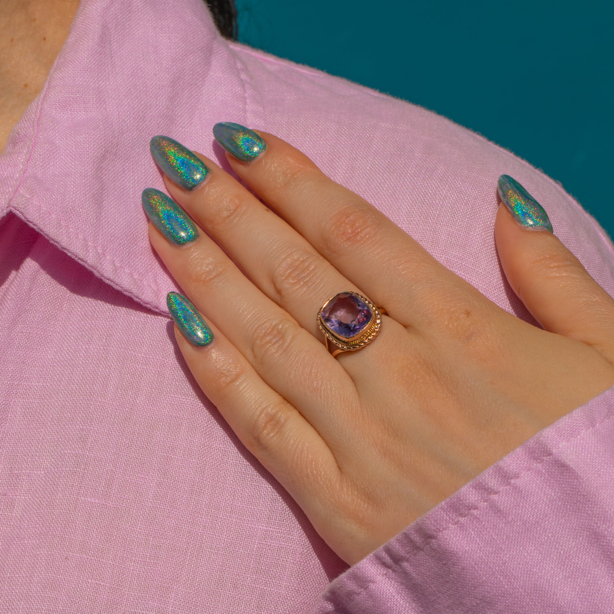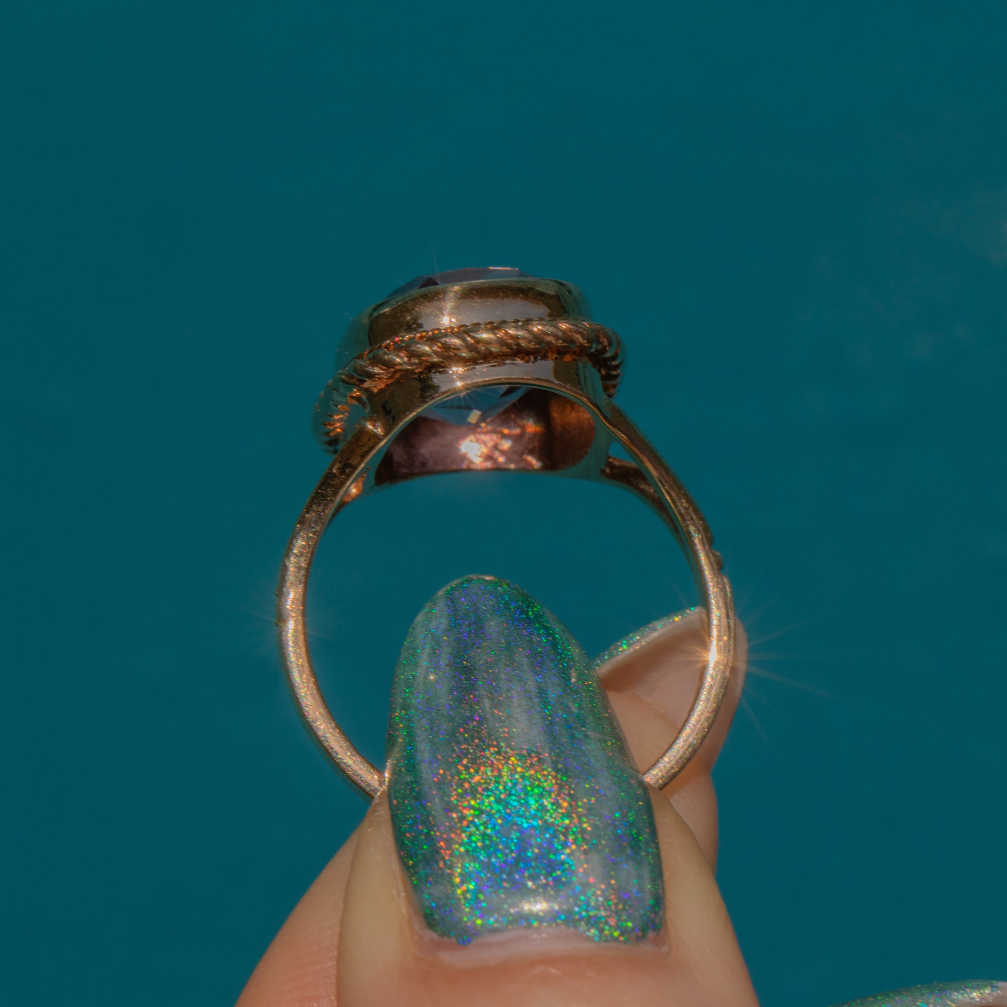 This 9ct Gold Amethyst cocktail ring will make a statement wherever she goes! Displayed within solid 9ct Gold, the 7.93ct Amethyst sends lilac shimmers cascading across your finger as her crisp cut facets catch the light, instantly grabbing the attention of any onlooker.