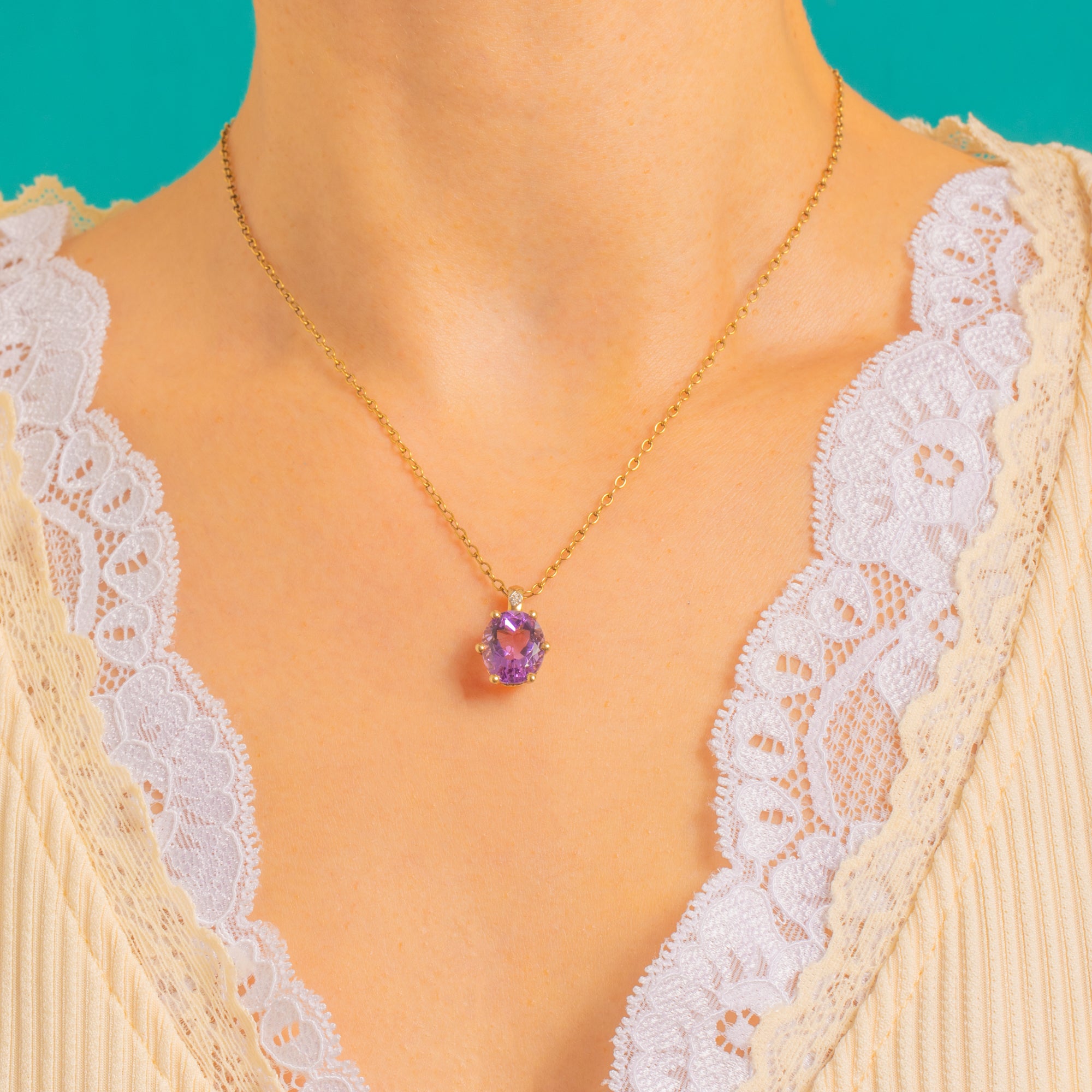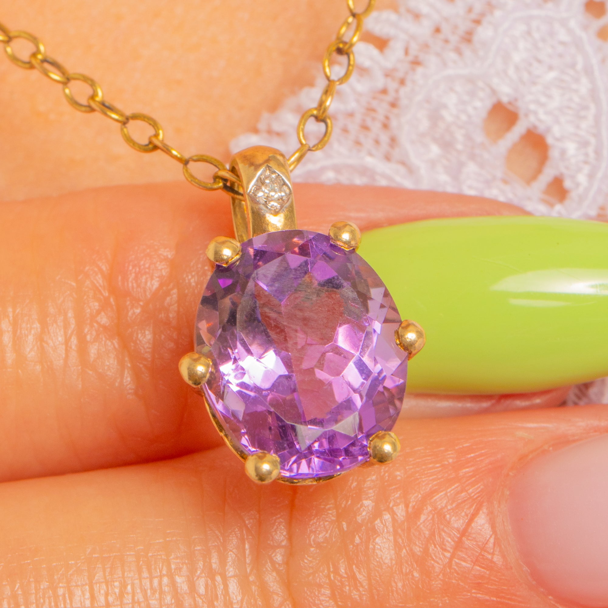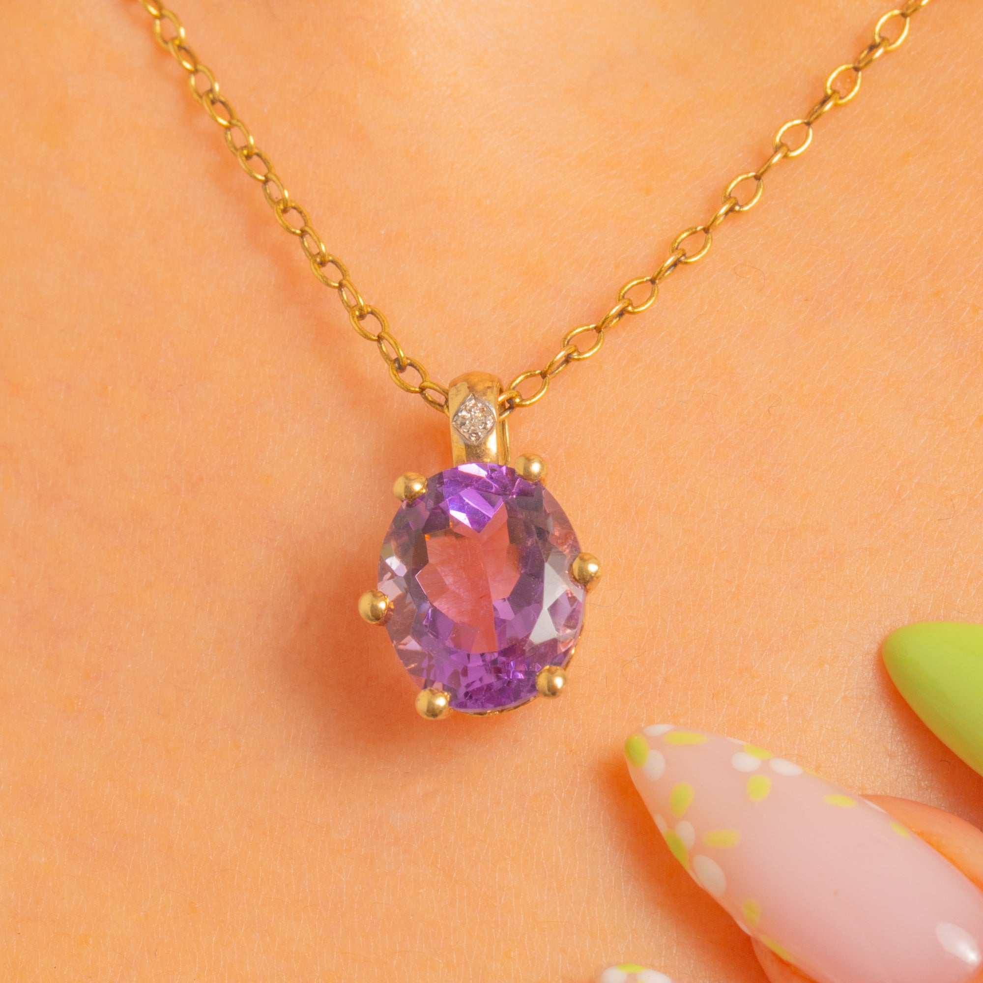 豊かな9ctゴールドで仕立てられた、時代を超えて愛されるヴィンテージペンダント。艶やかなオーバルカットのアメシストが、繊細なダイヤモンドの輝きに彩られています。深くベルベットのような紫色が生き生きとした煌めきを放ち、美しいボールチップ付きの爪でしっかりと留められ、洗練されたフェミニンなシルエットを描きます。