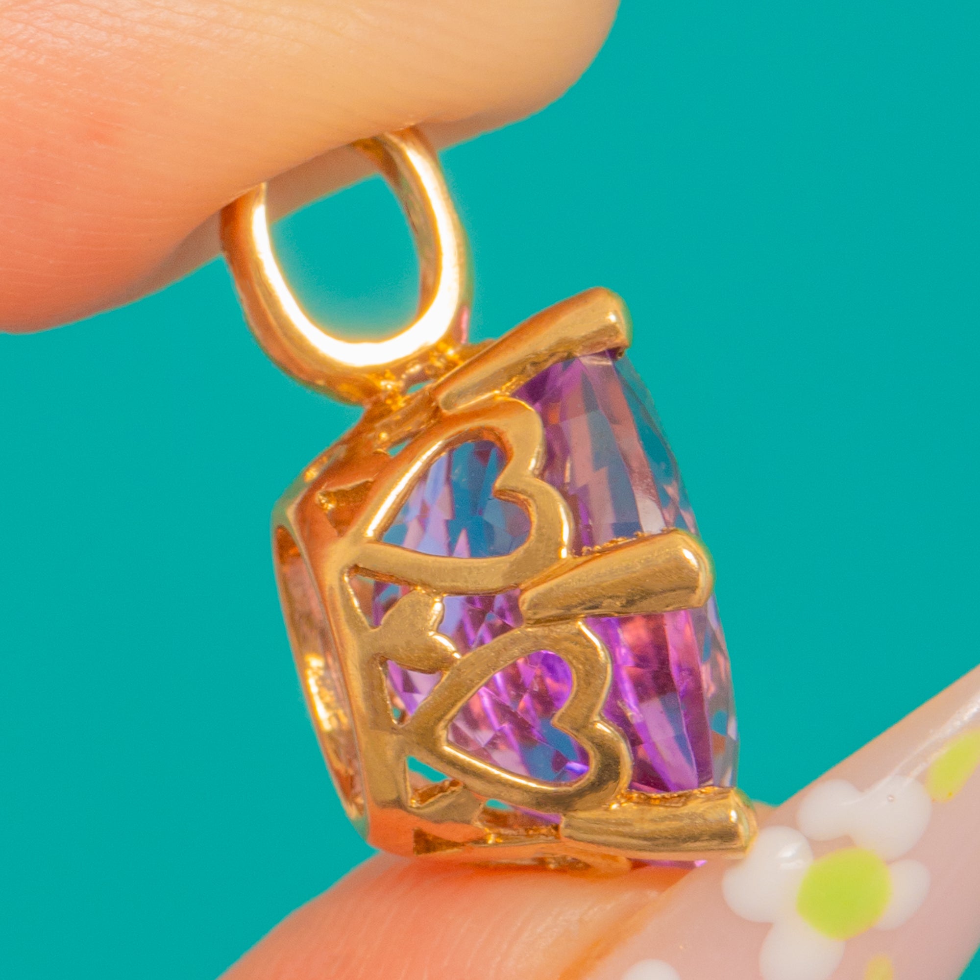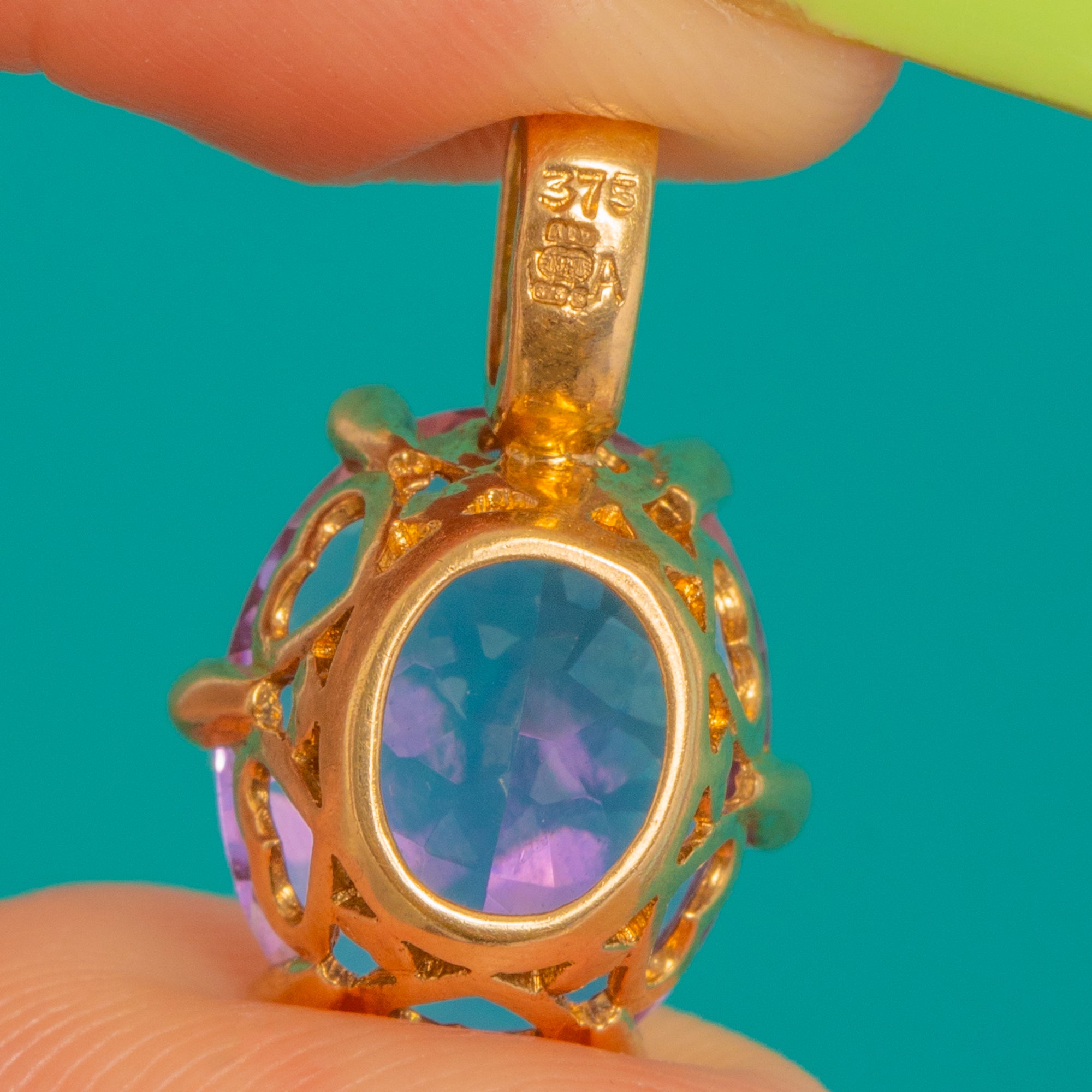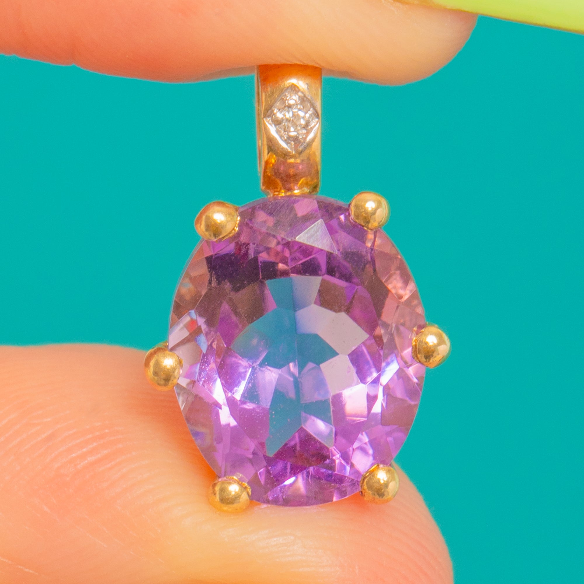 豊かな9ctゴールドで仕立てられた、時代を超えて愛されるヴィンテージペンダント。艶やかなオーバルカットのアメシストが、繊細なダイヤモンドの輝きに彩られています。深くベルベットのような紫色が生き生きとした煌めきを放ち、美しいボールチップ付きの爪でしっかりと留められ、洗練されたフェミニンなシルエットを描きます。