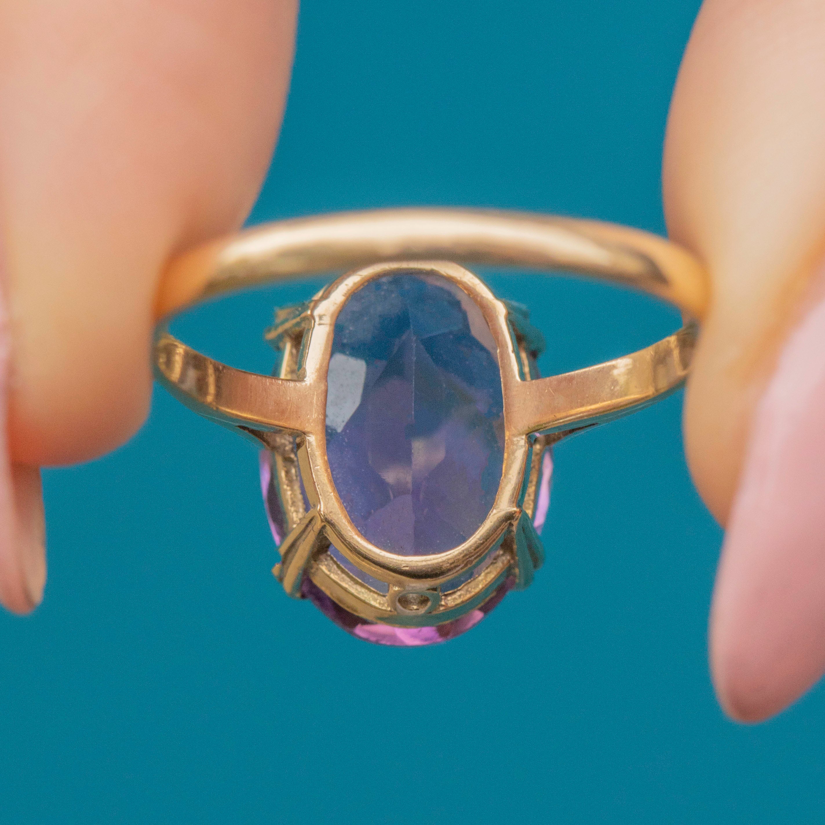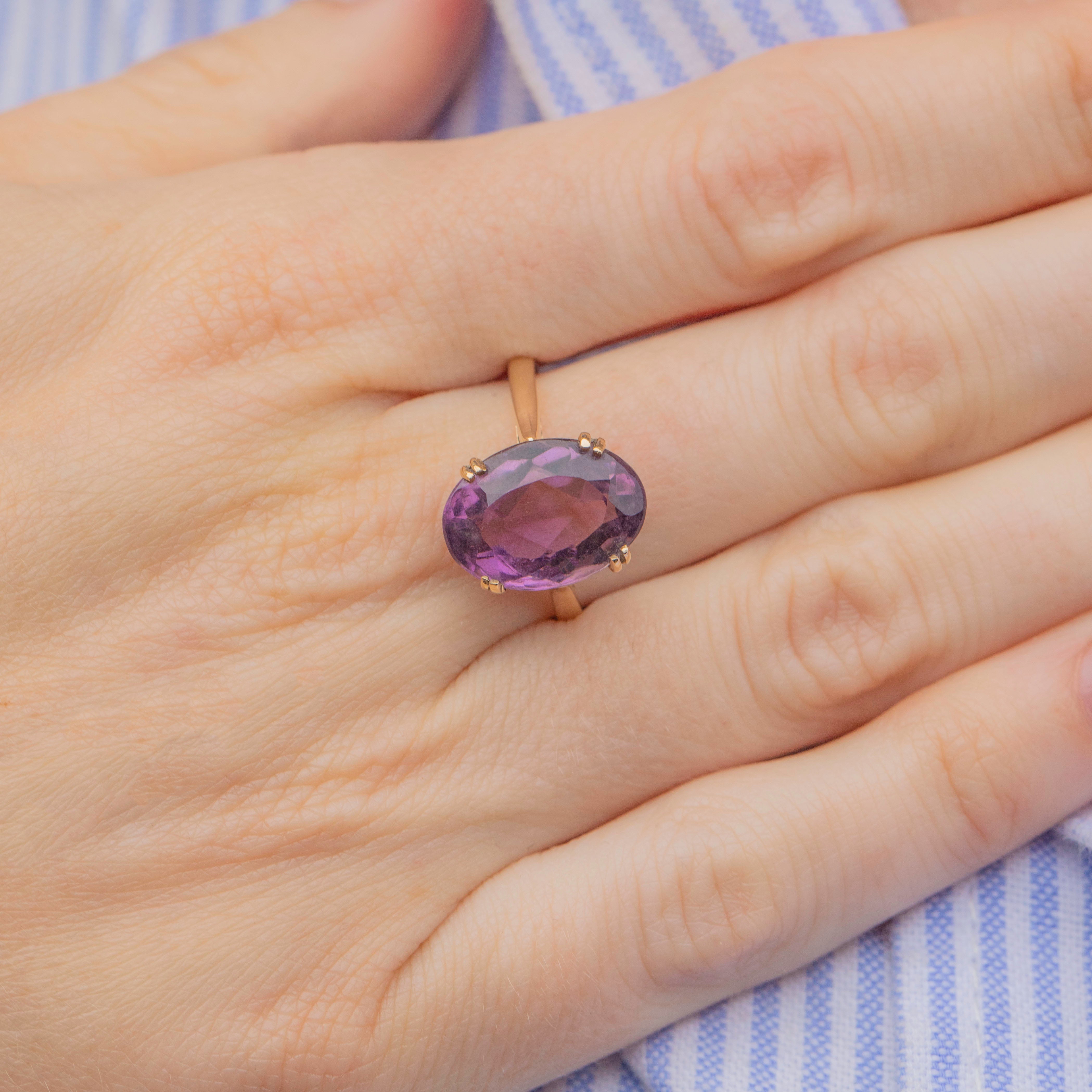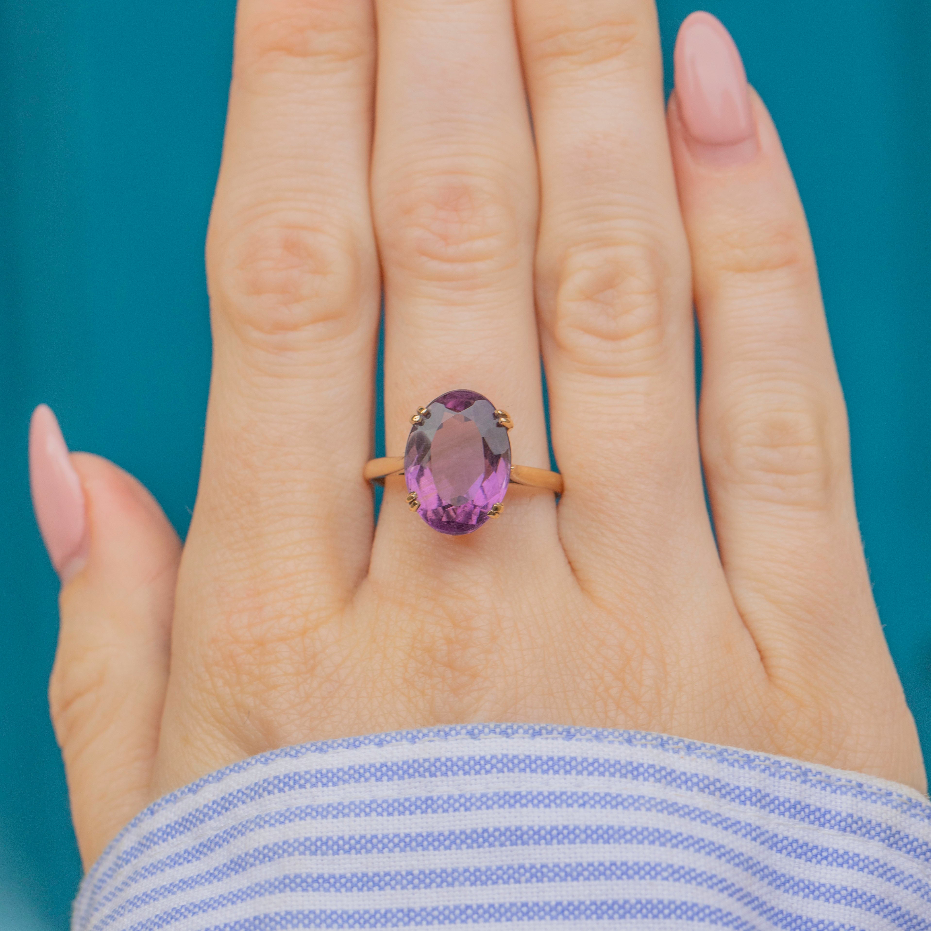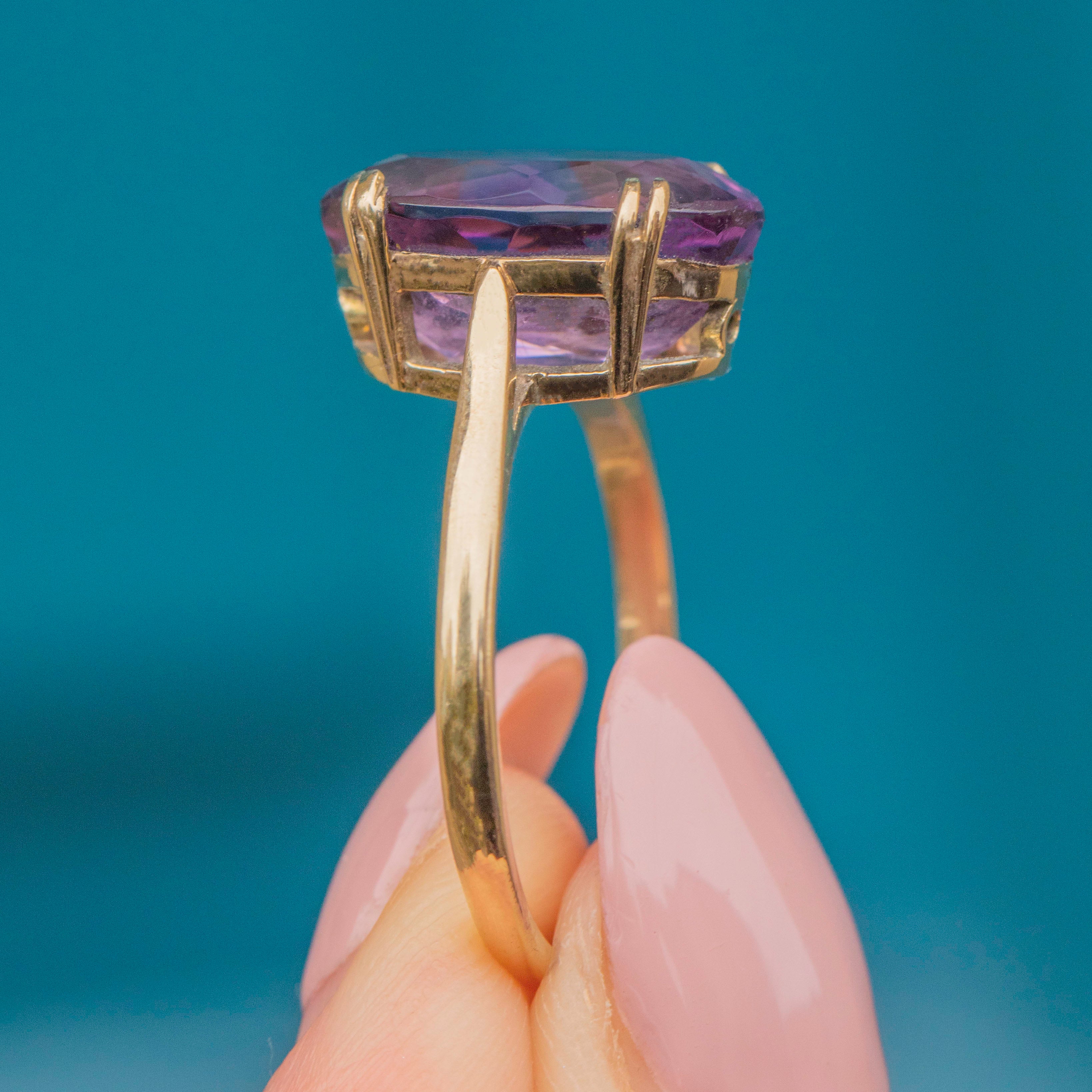 EXCELLENT. This 9ct Gold Amethyst dress ring is in sublime condition. The Amethyst is held firm within her 9ct Gold claw setting, with no signs of wear. Her 9ct Gold shank is brightly saturated and free from any scuffs or dings. All in all, she's a delight!
