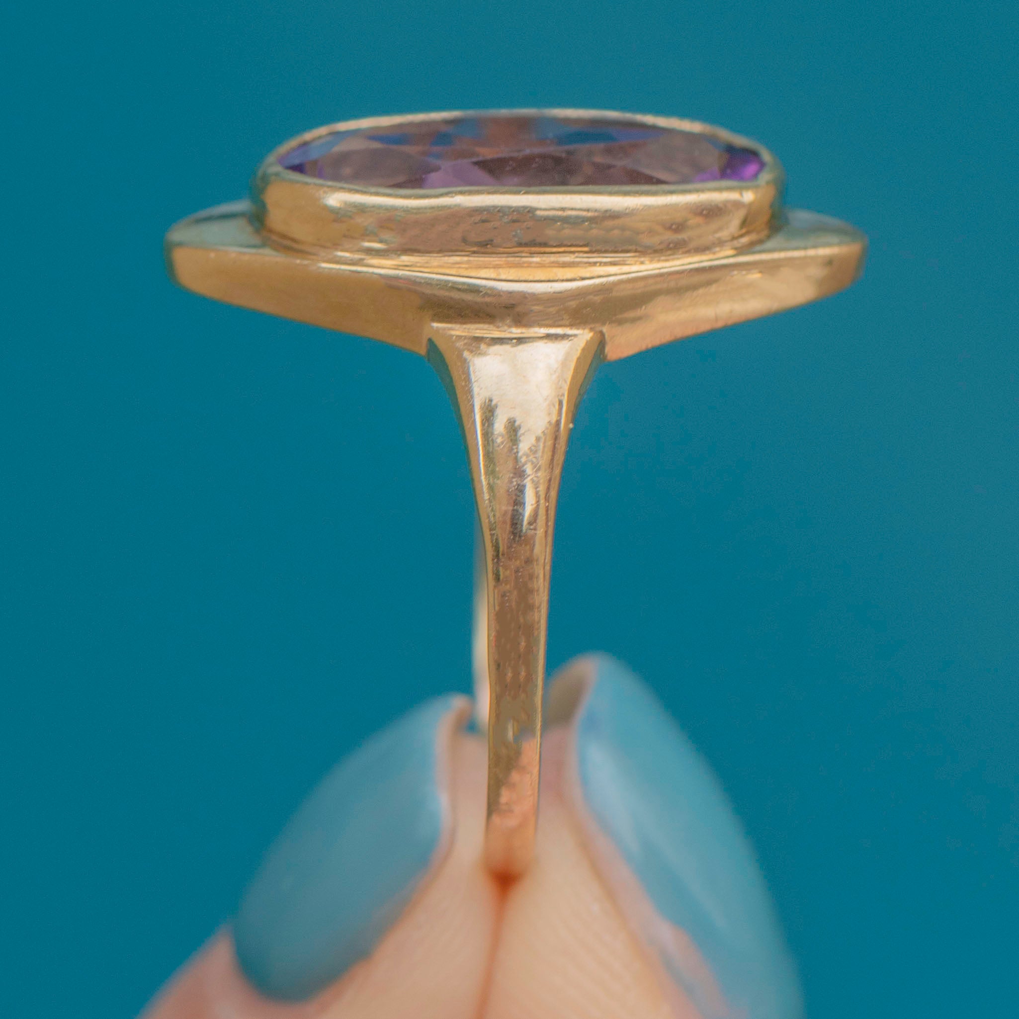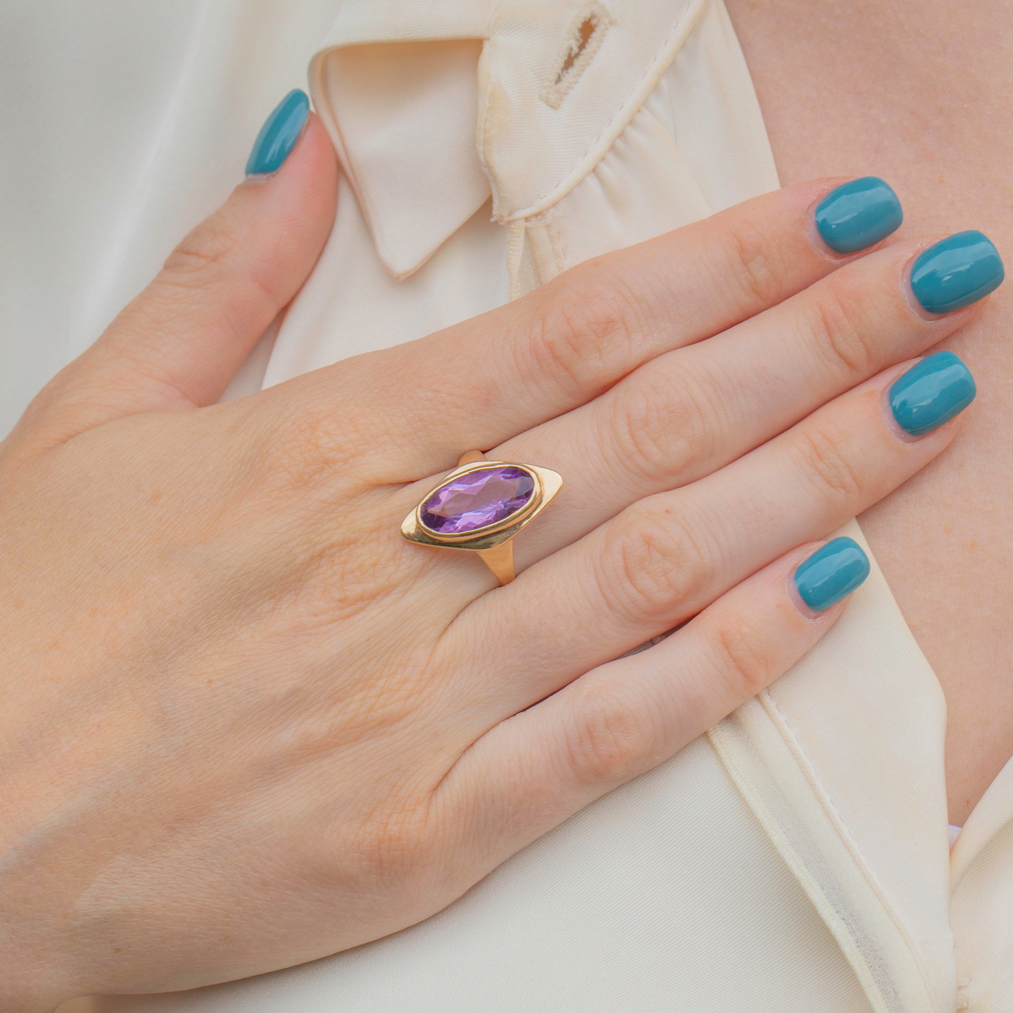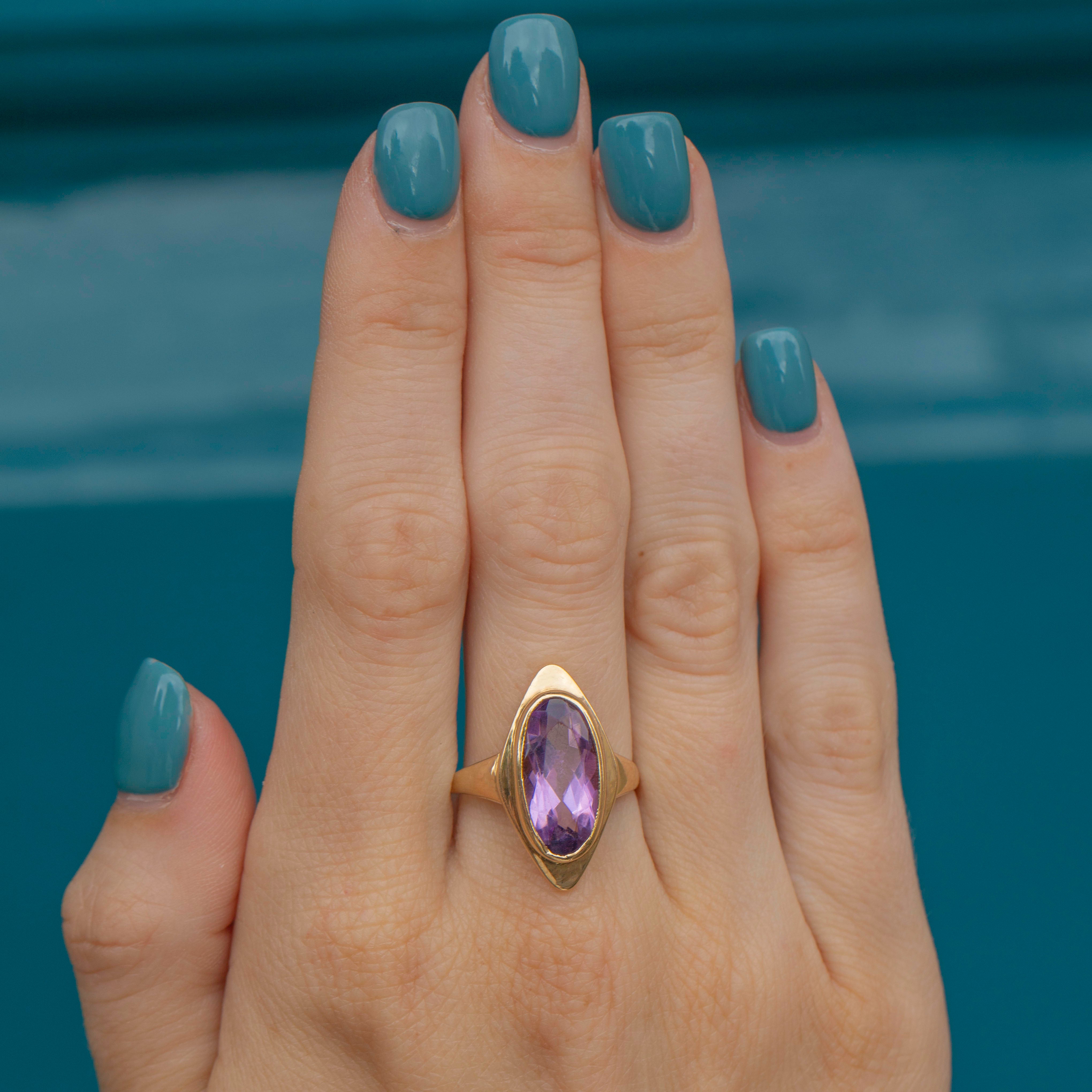At 3.00ct her plush purple Amethyst enhanced by her buttery 9ct Gold setting, a royal delight! This ring is a perfect example of Mid-Century Vintage style, sure to make a bold and unforgettable statement!