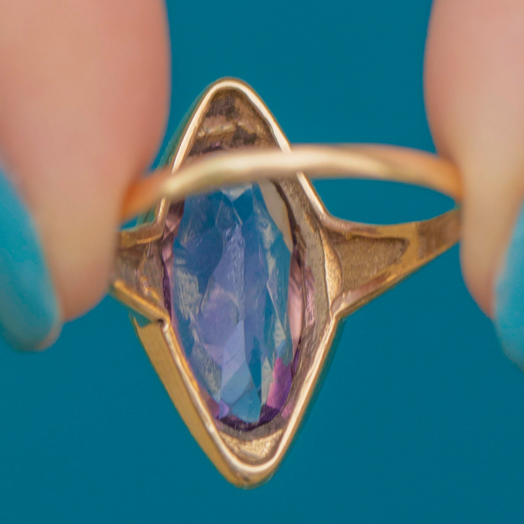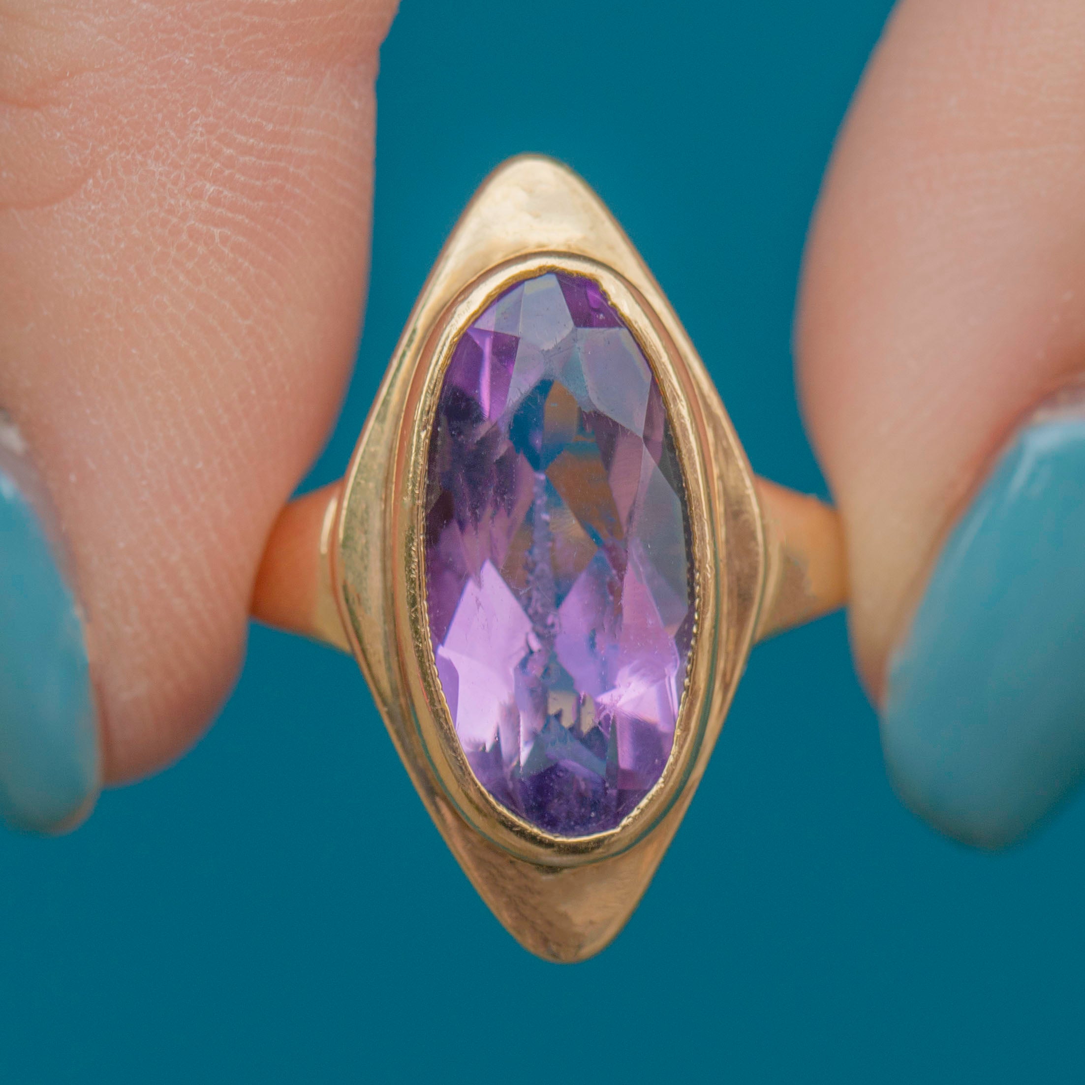 VERY GOOD This 9ct Gold Amethyst Lozenge Ring is in a very good condition. Her lavish Amethyst is beautifully faceted and although she has a small scuff on her underside, this is only visible under close inspection. Her Gold band has aged wonderfully over the years and is free from any dinks or dents. She is fit for an Empress!