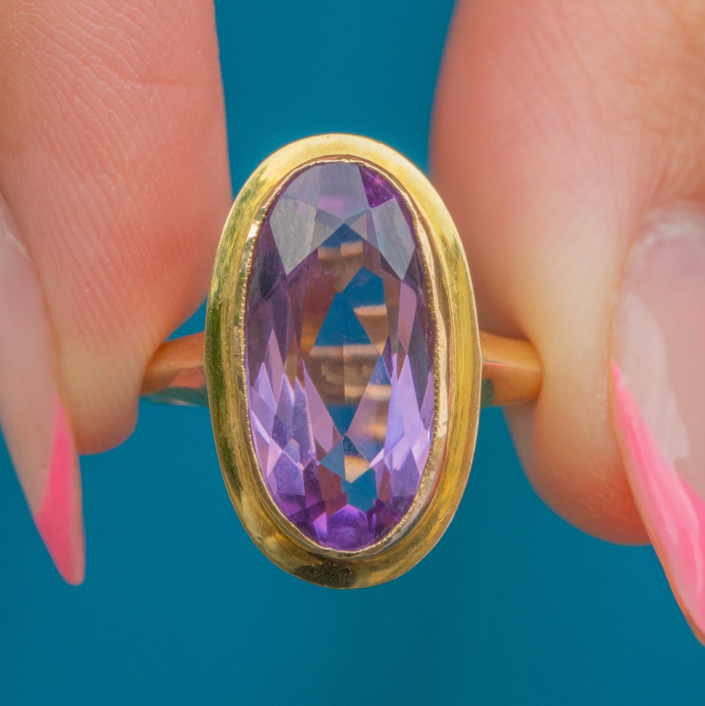 EXCELLENT: This 9ct Gold Amethyst oval solitaire ring is in excellent condition! The Amethyst sits securely within the four-claw setting, with fabulous facets coming to life under the light. The Gold is rich and buttery throughout, with the ring band retaining a well rounded form. This Amethyst solitaire ring is a stunner!
