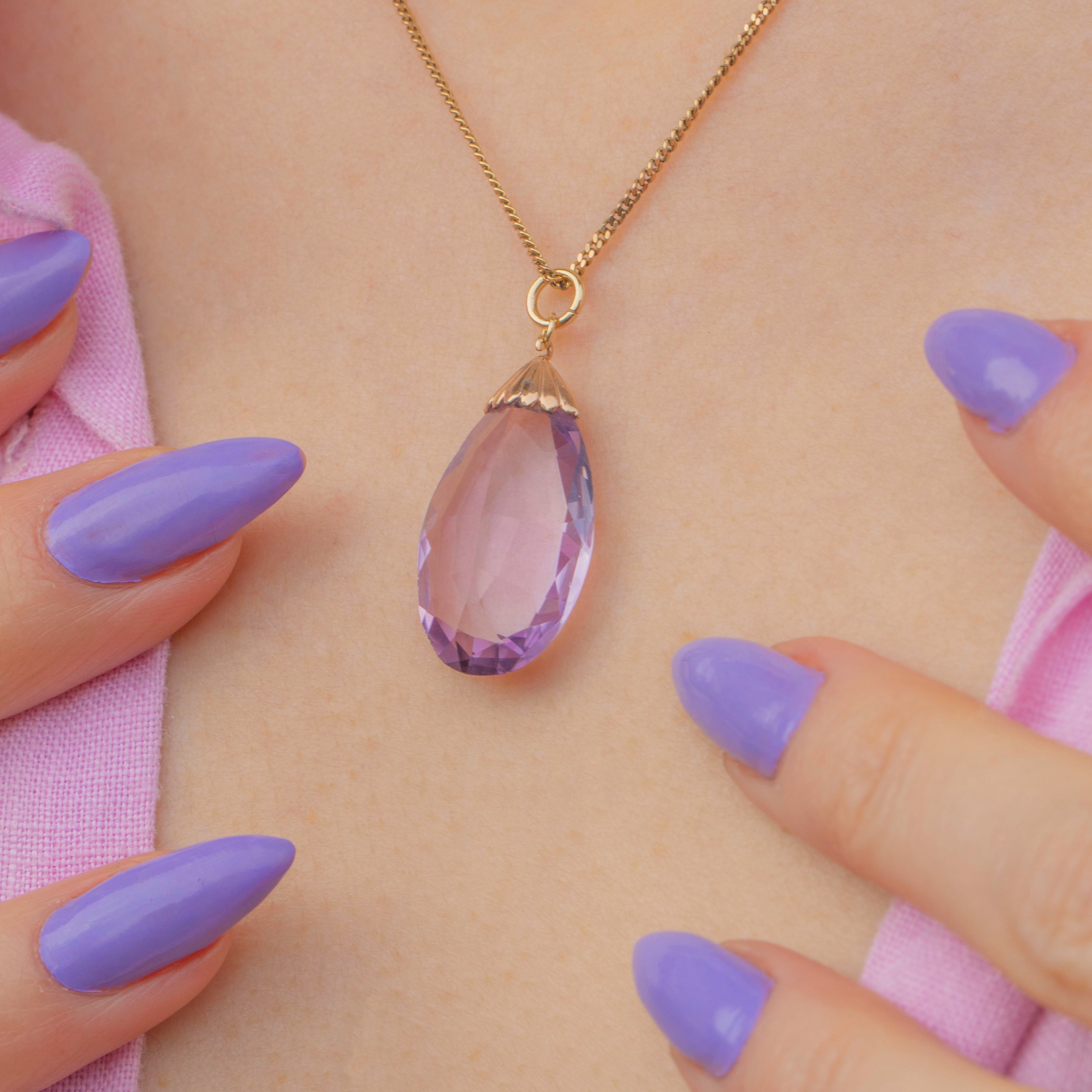 We have fallen head over heels in love with this gorgeous Art Deco 9ct Gold Amethyst pear drop pendant! Exquisitely faceted, this regal purple pear-cut 9.35ct Amethyst glistens magnificently under the light.