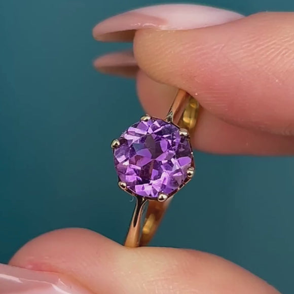 EXCELLENT. This 9ct Gold Amethyst solitaire ring is in excellent condition. The Amethyst has a crisp set of facets and is free from chips or abrasions. The 9ct Gold is buttery throughout and the shank has kept its elegant form well, and each claw is present holding the Amethyst securely in place.