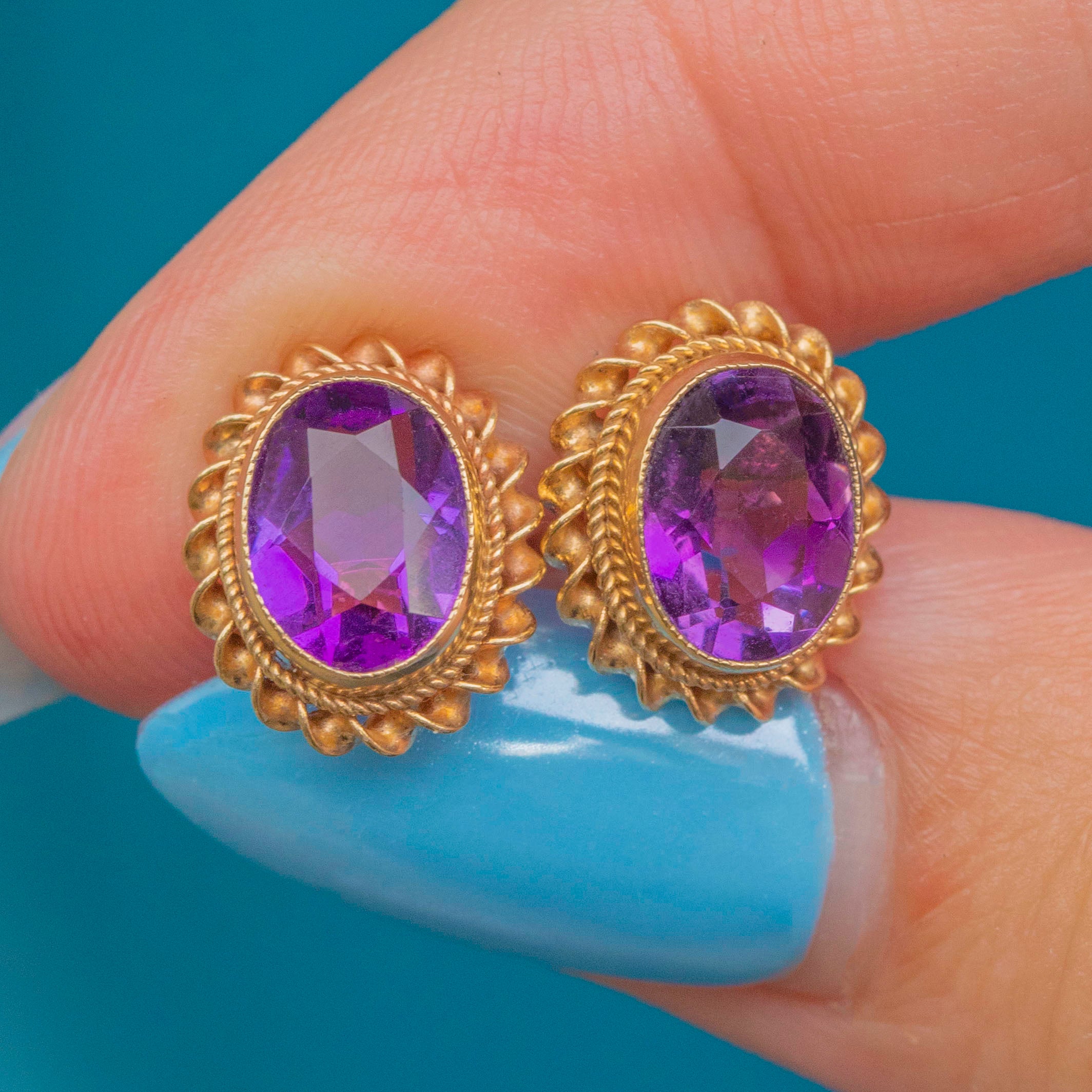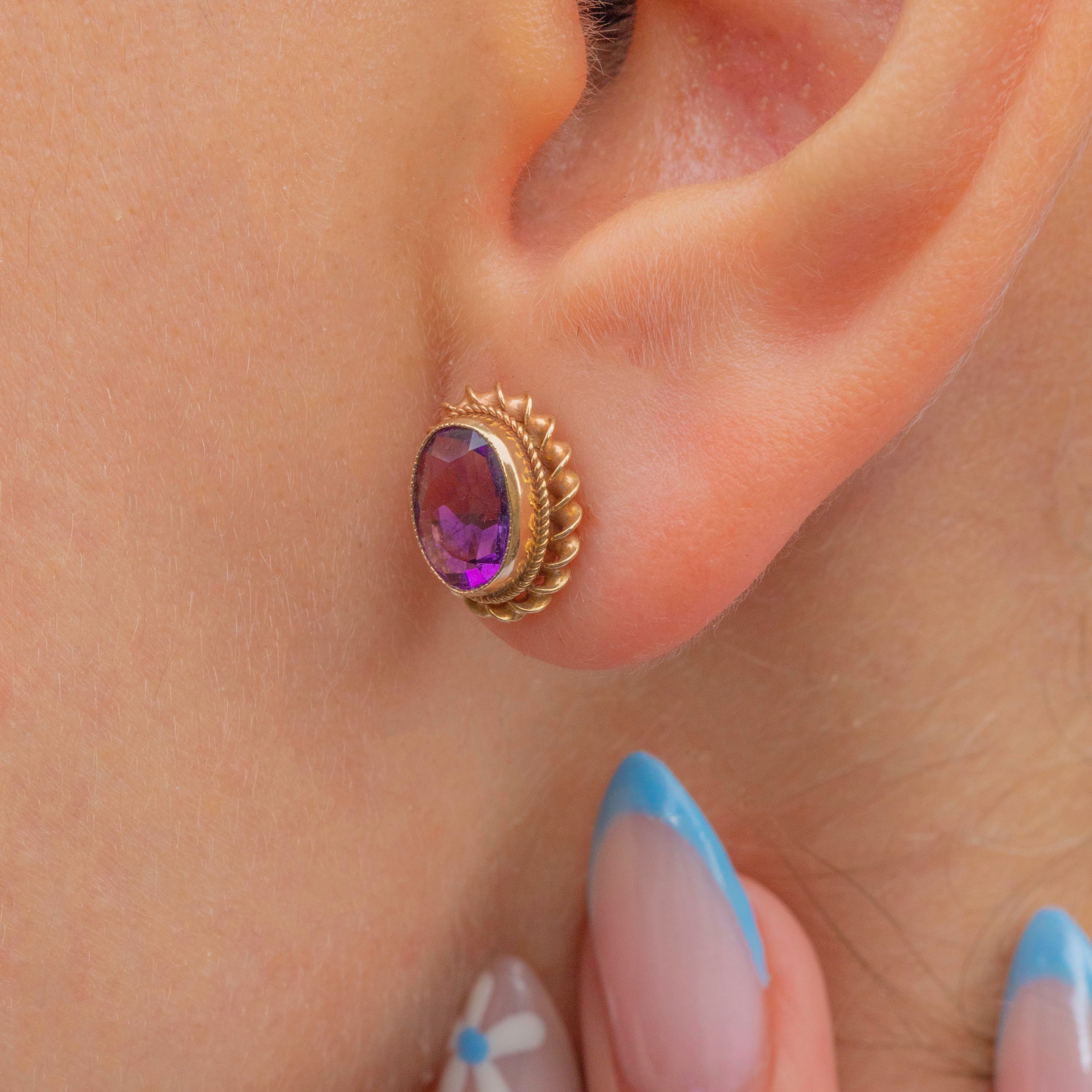 The gemstones are set within glossy 9ct Gold bezels, with an ornately formed twisted rope border providing a striking, decorative finish. Complete with a full set of hallmarks, these mid-century Amethyst studs radiate vintage charm.