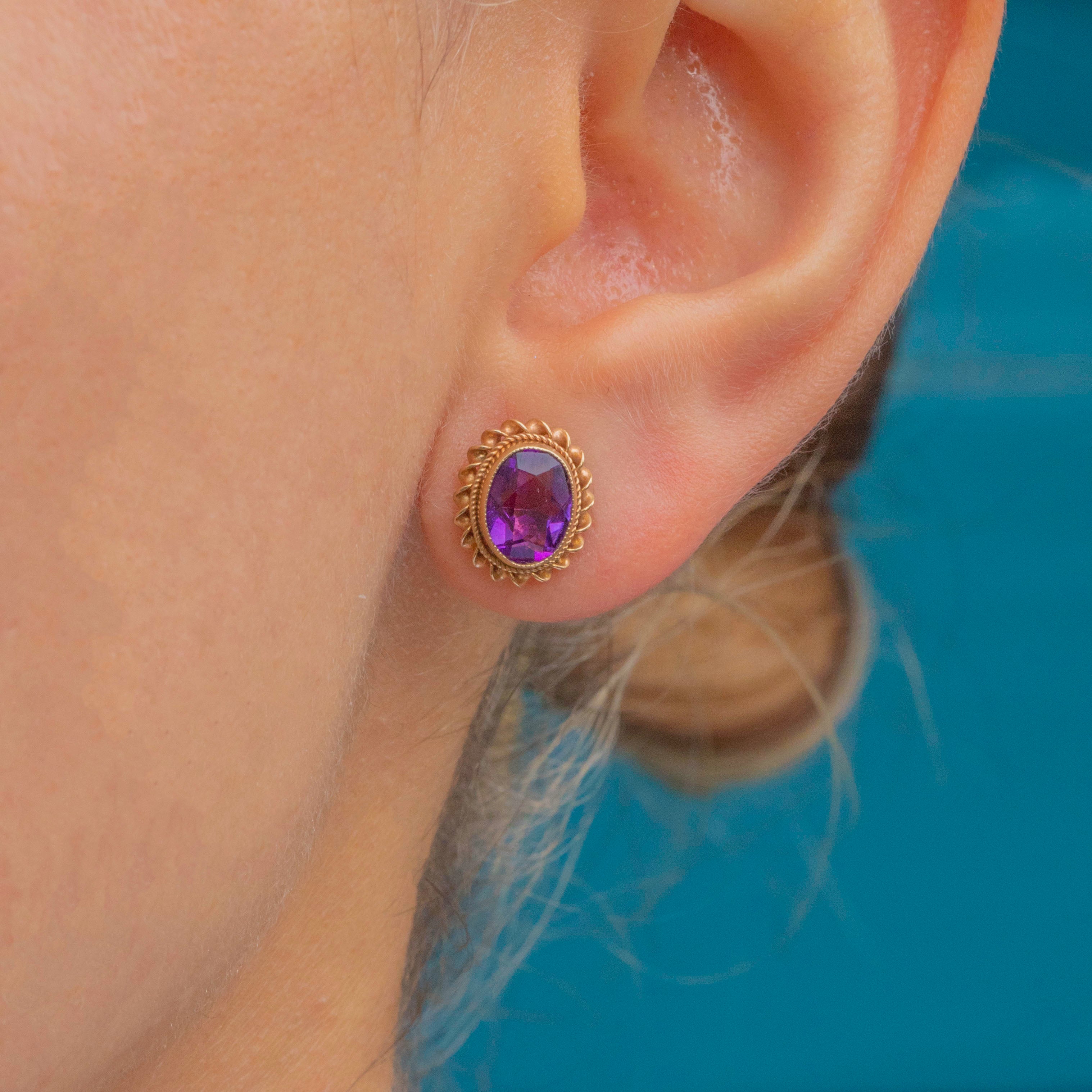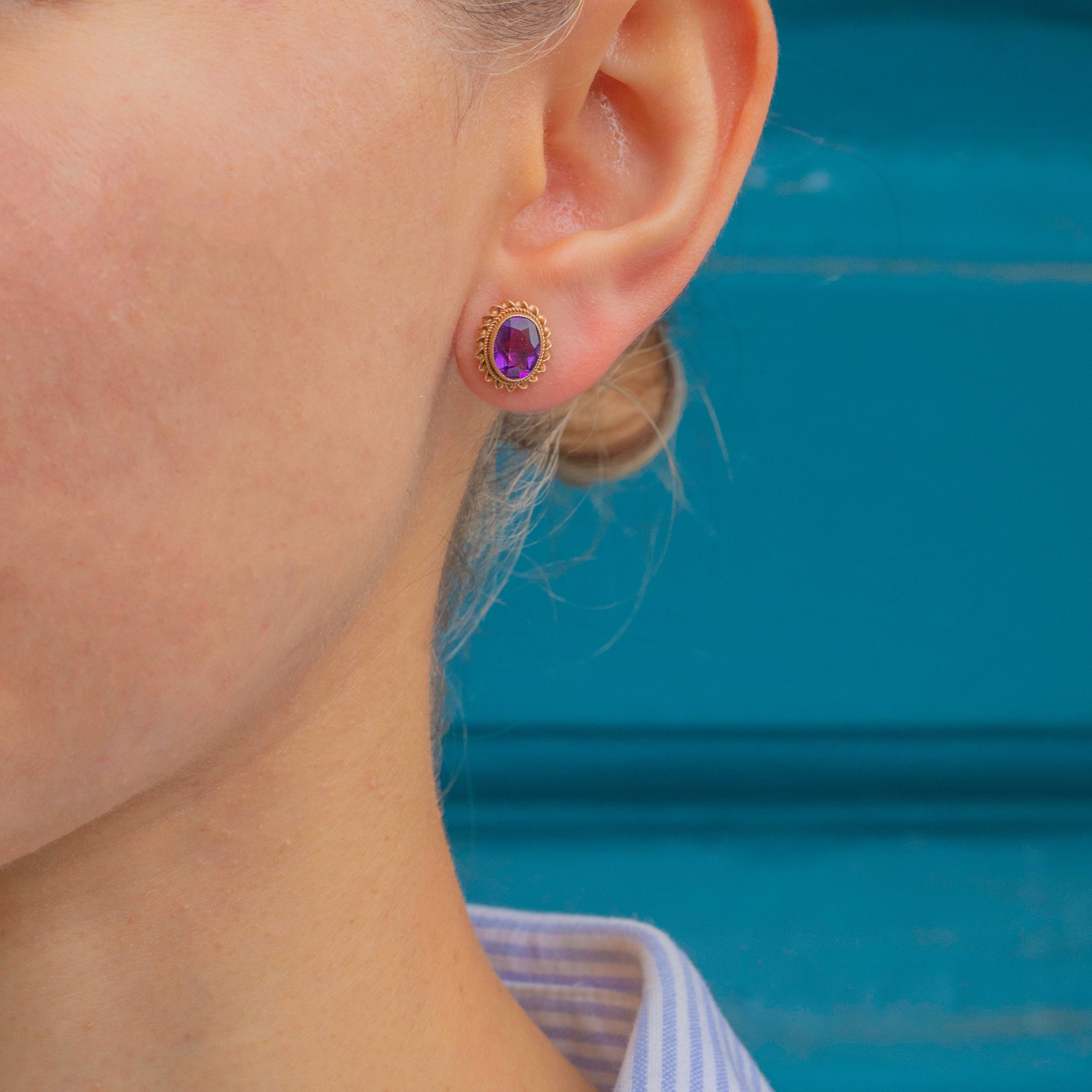 These elegant vintage earrings each display a saturated oval Amethyst, faceted beautifully and revealing deep lavender and lilac hues as they catch the light.