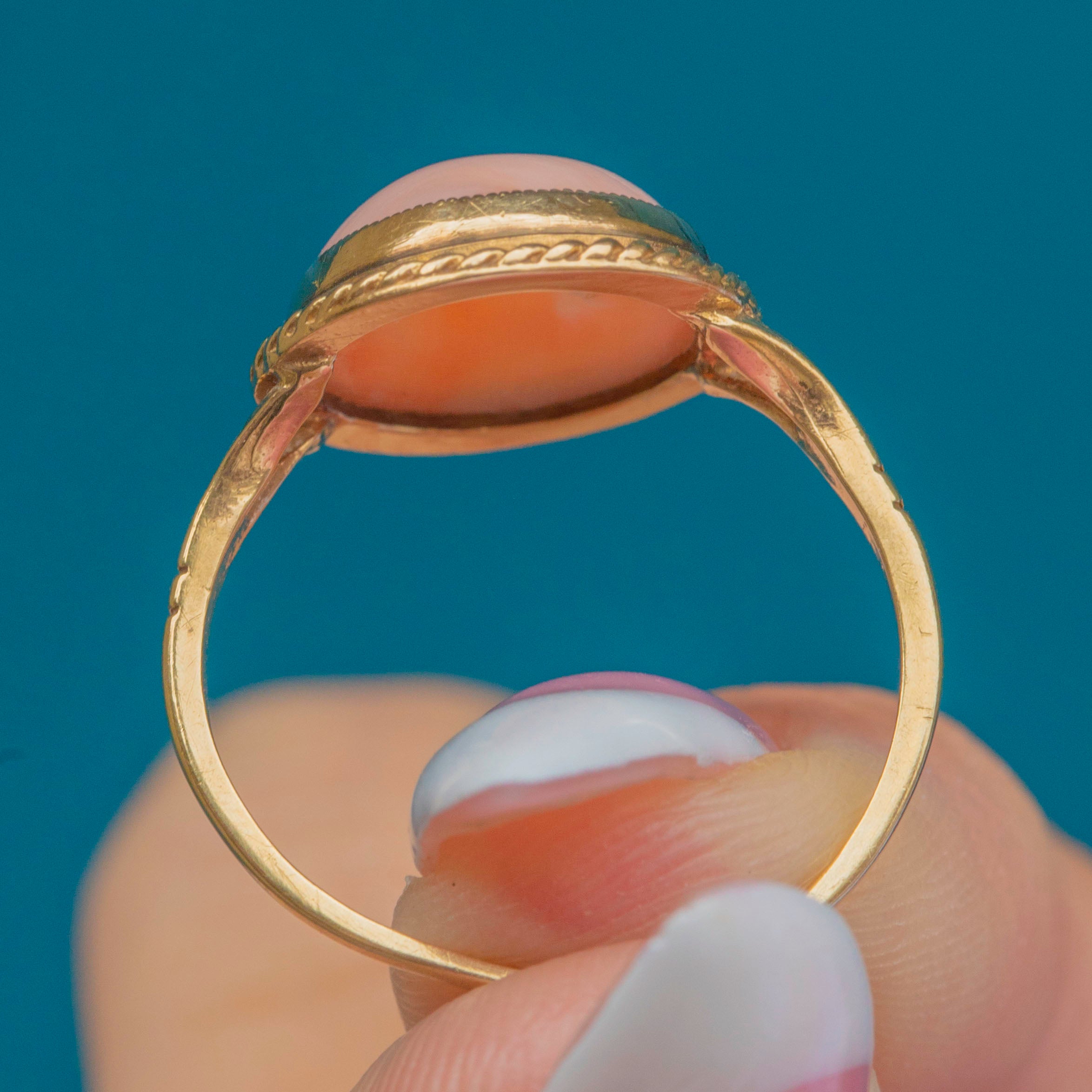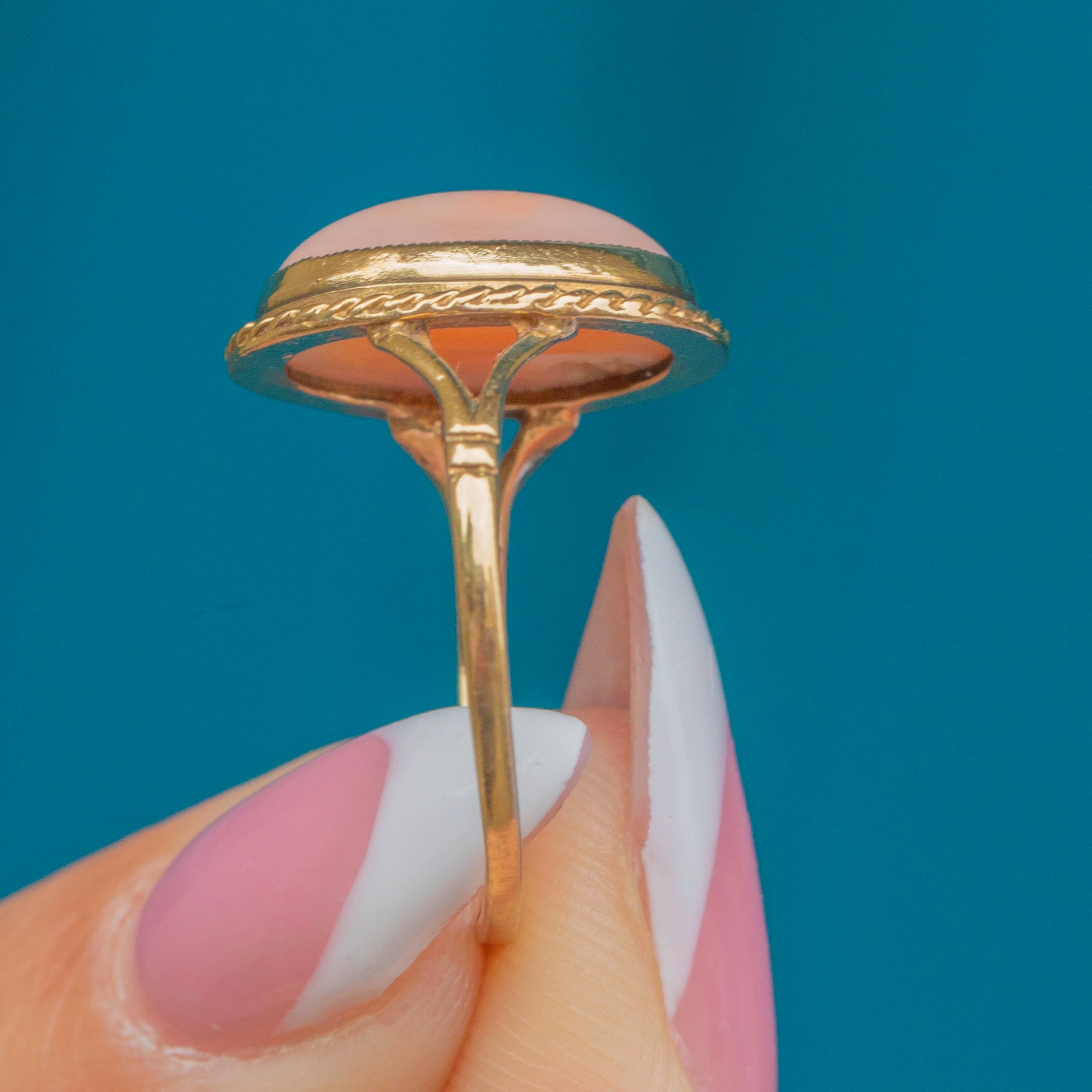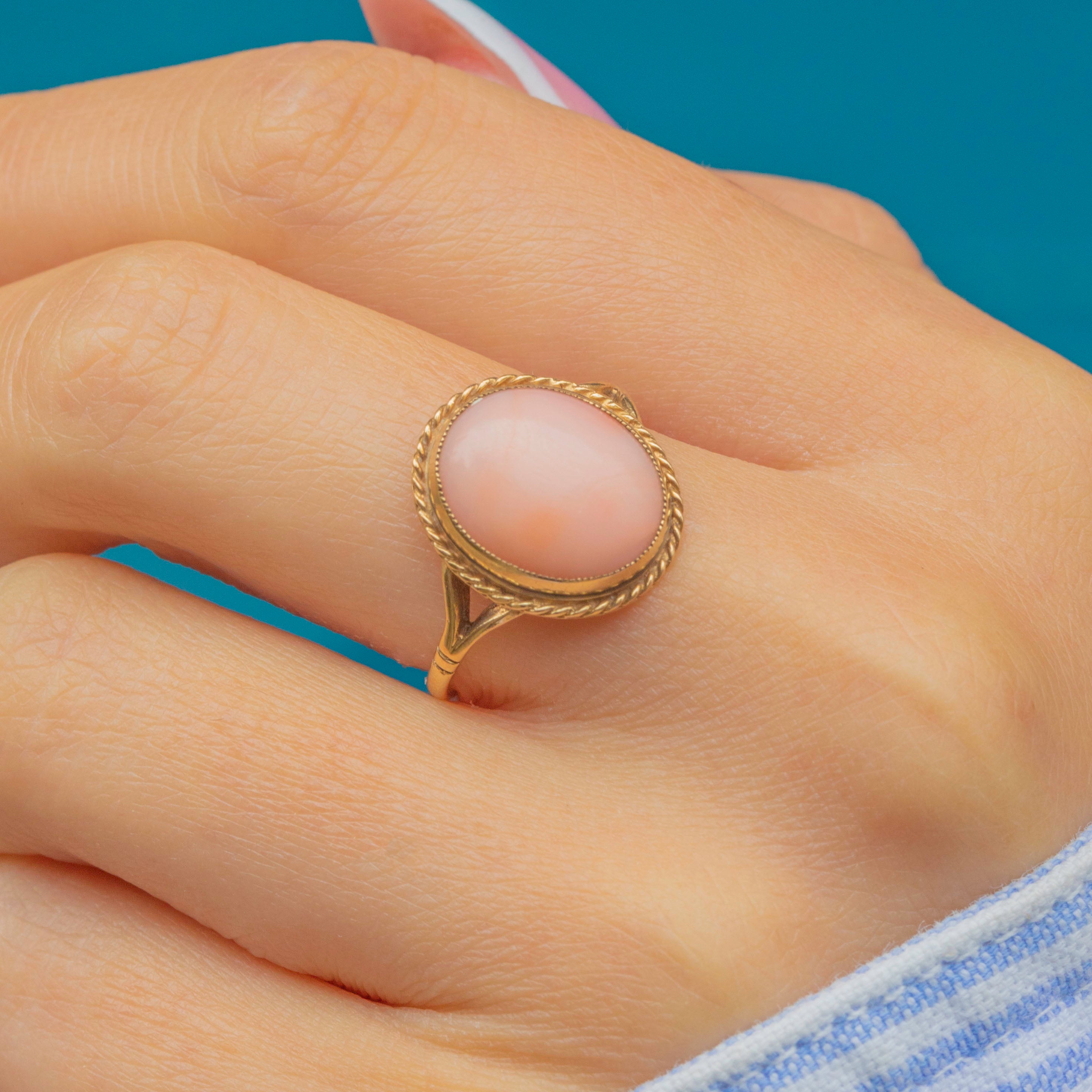 This Vintage 9ct Gold ring showcases a beautiful oval cabochon of Angel Skin Coral, celebrated for its delicate blush-pink hue and smooth, lustrous finish. The Coral is secured in a fine bezel setting with an elegant twisted rope border, adding subtle texture and definition. Tapered shoulders lead to a slender shank, creating a refined silhouette.