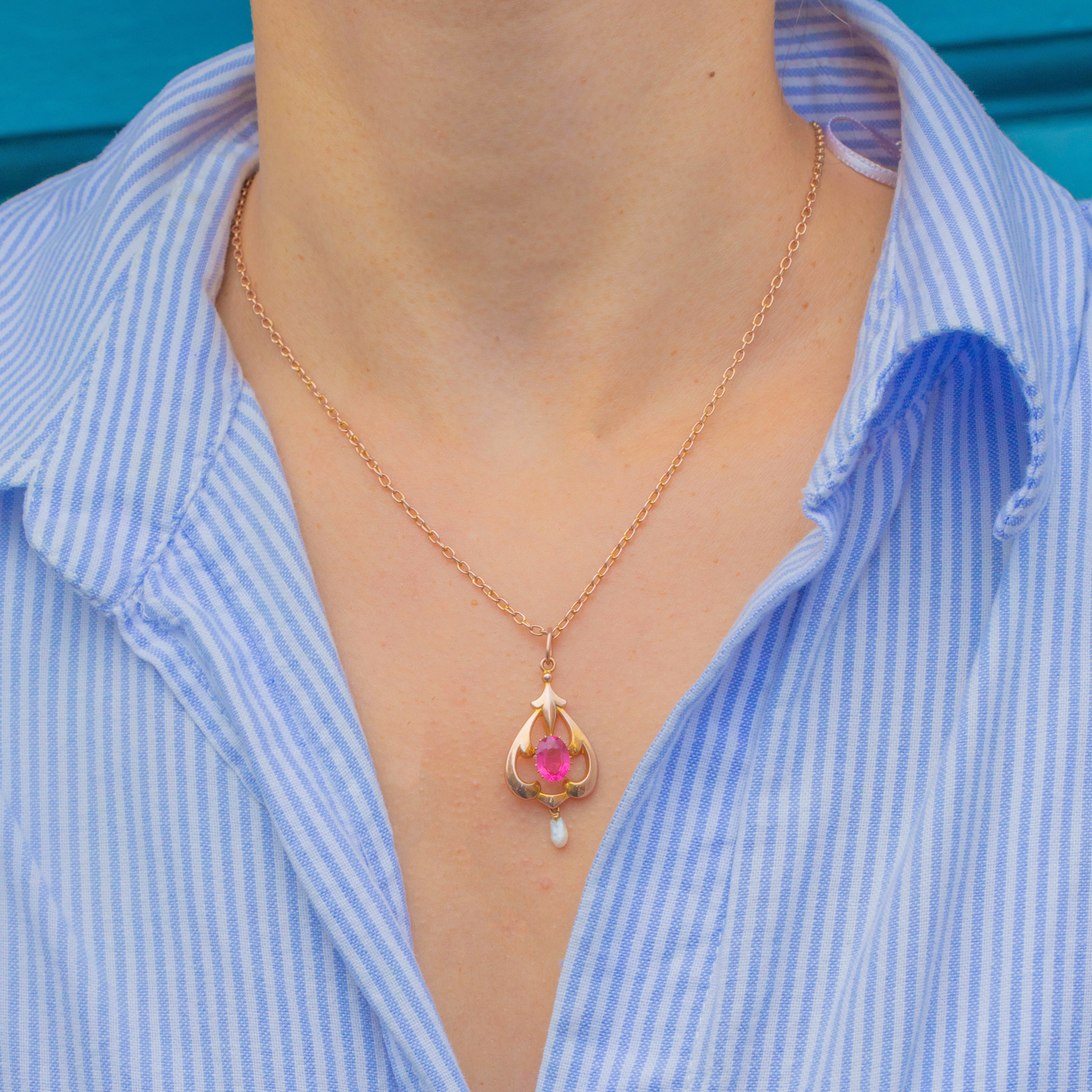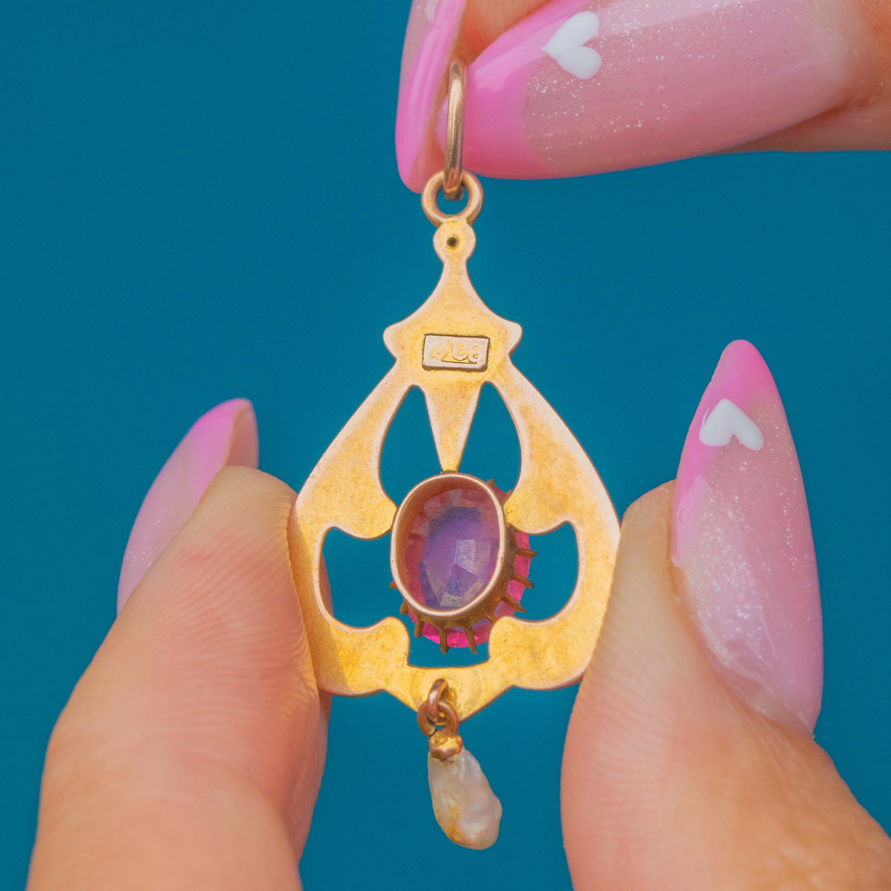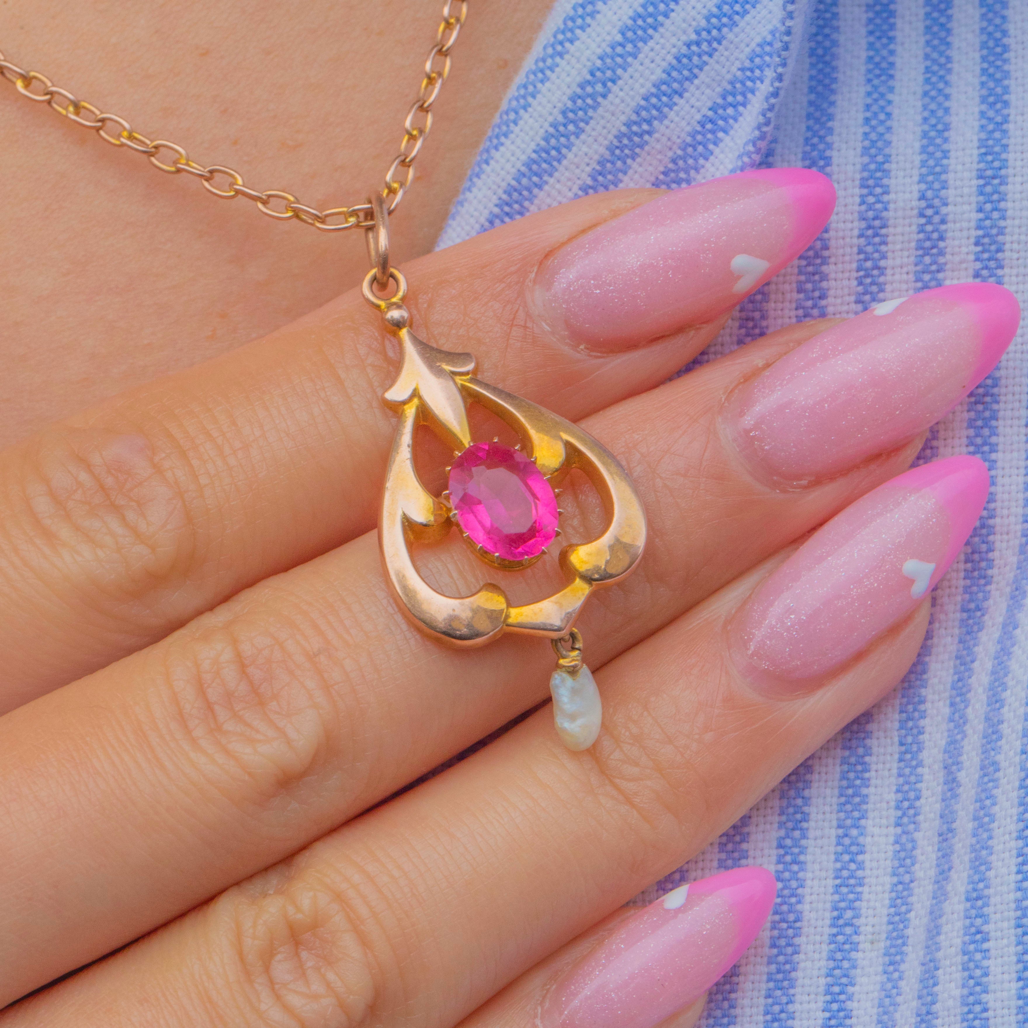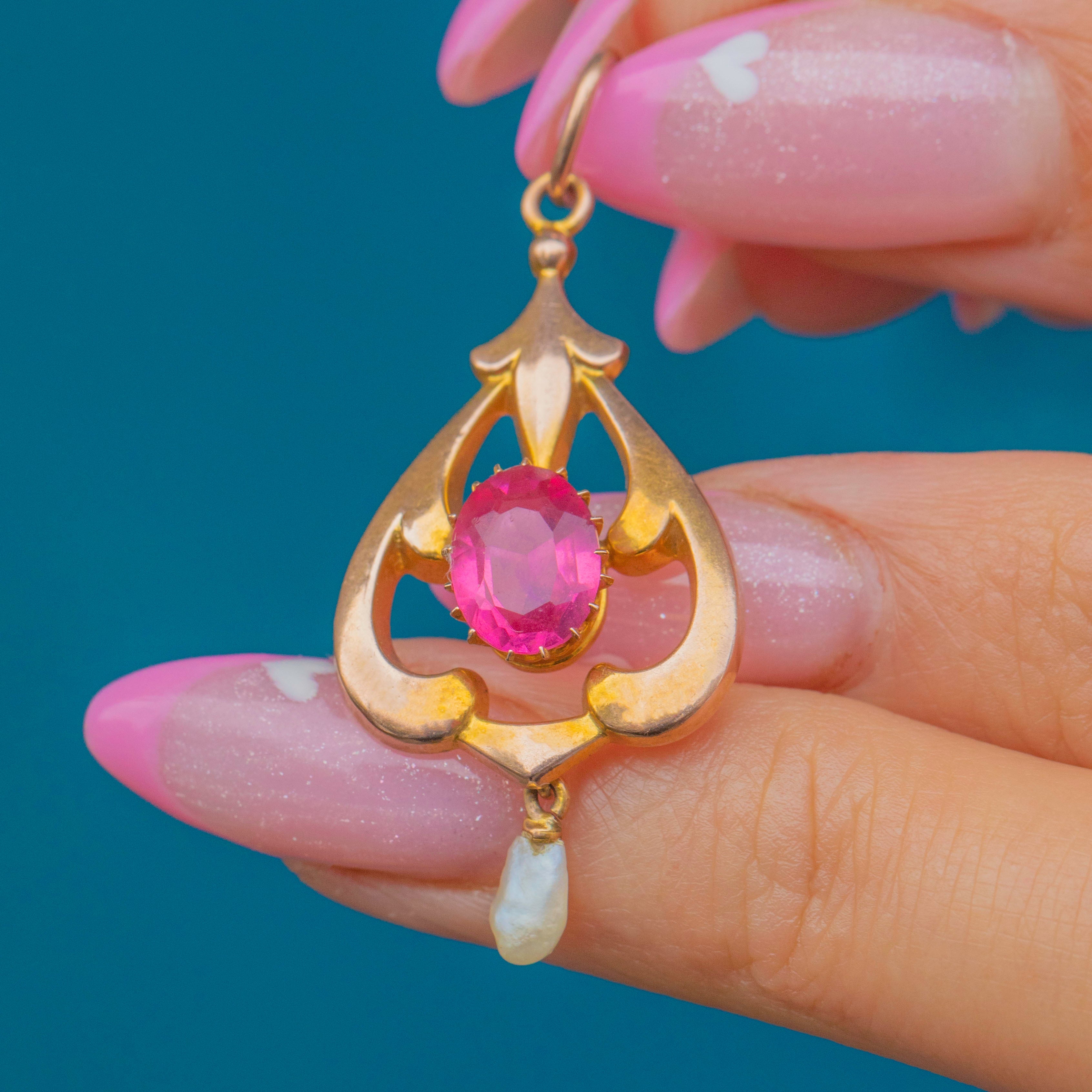 この精緻なArt Nouveauペンダントは、20世紀初頭の優雅さとロマンティシズムを見事に表現しています。9ctゴールドで丁寧に作られ、輝くピンクパーストのセンターストーンを優美な透かし細工のスクロールが囲み、自然なライスパールのドロップが揺れるたびに繊細な動きを添えます。