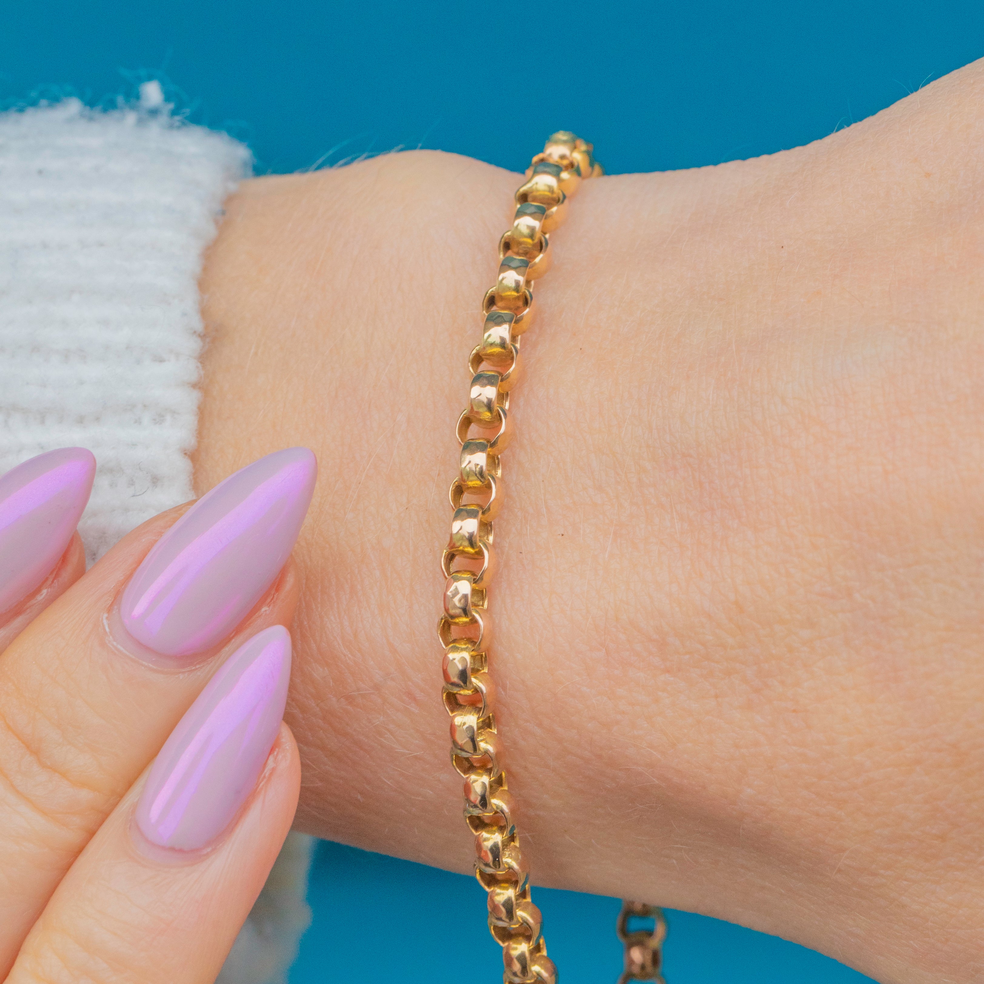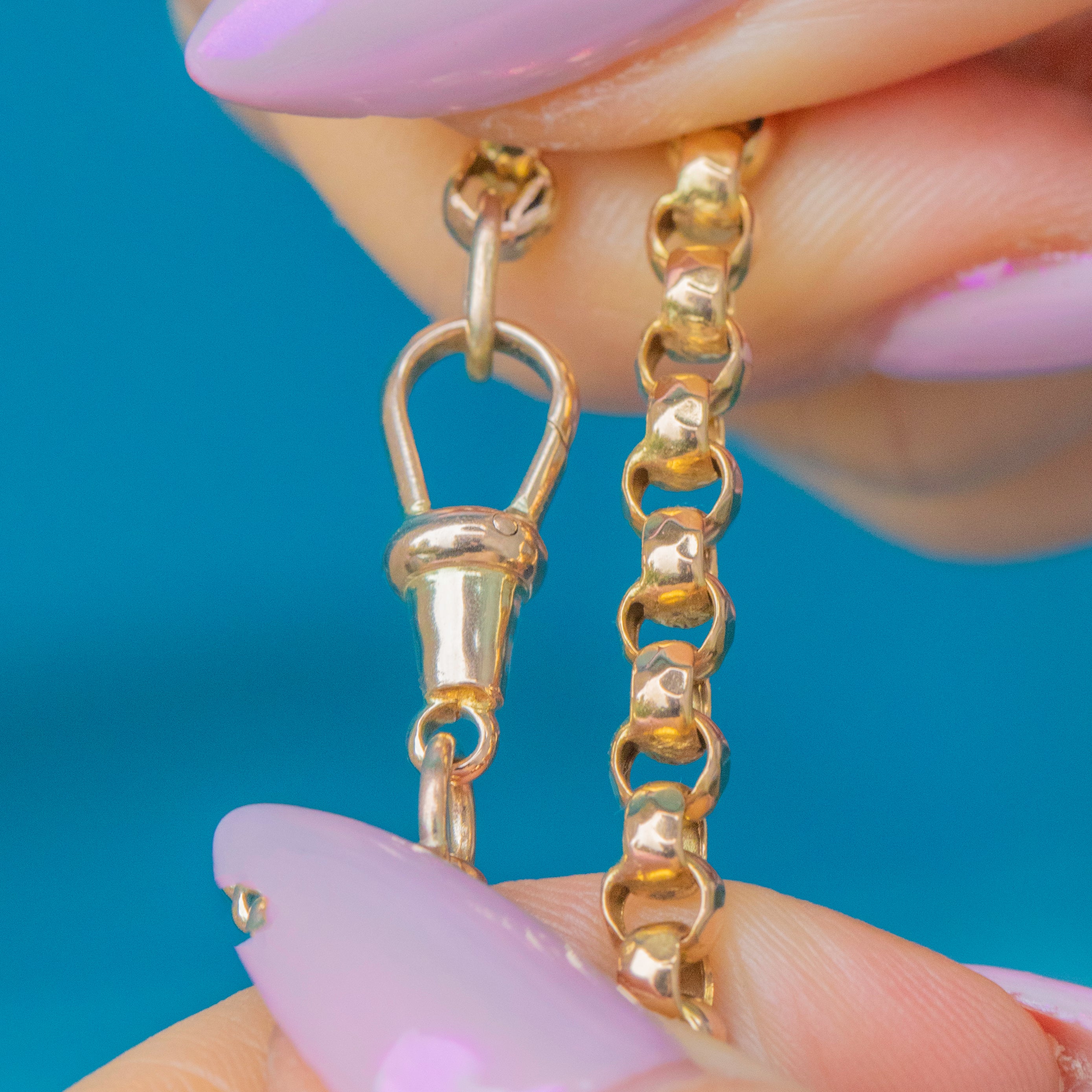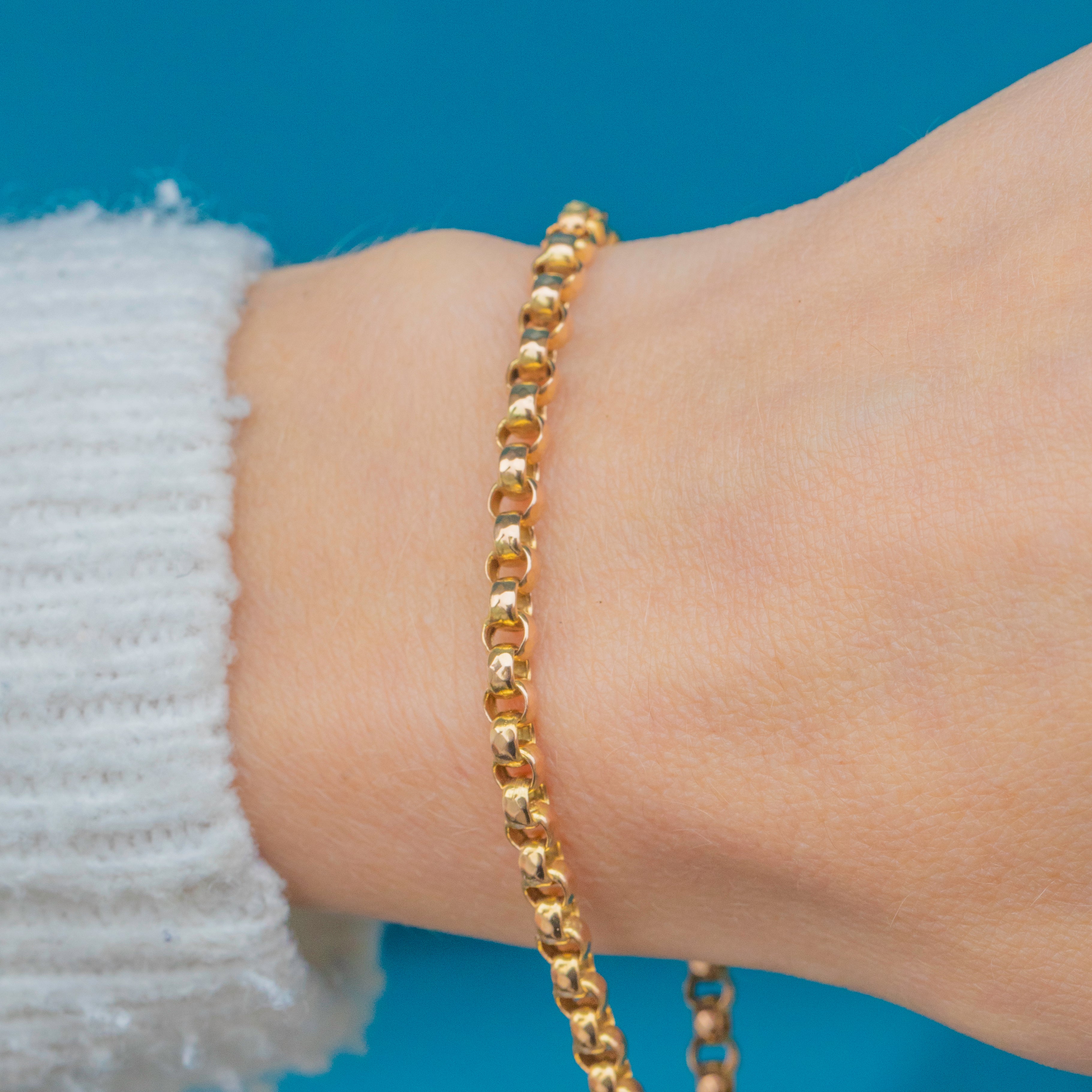A lovely Antique 9ct Gold bracelet featuring classic round links with a bright, polished finish. Measuring 8" long, this versatile piece comes complete with a dog clip to which you could affix a charm for a personal touch.