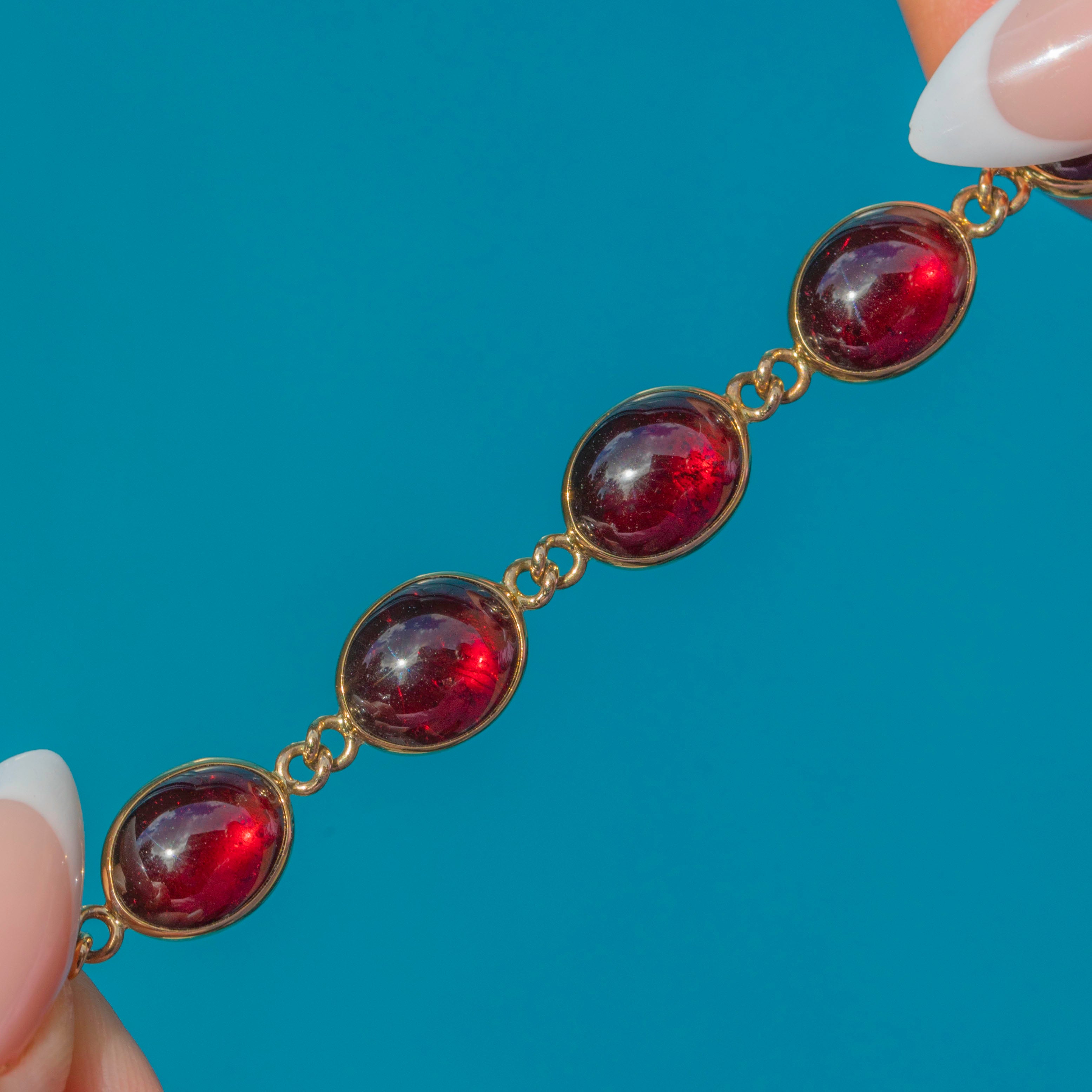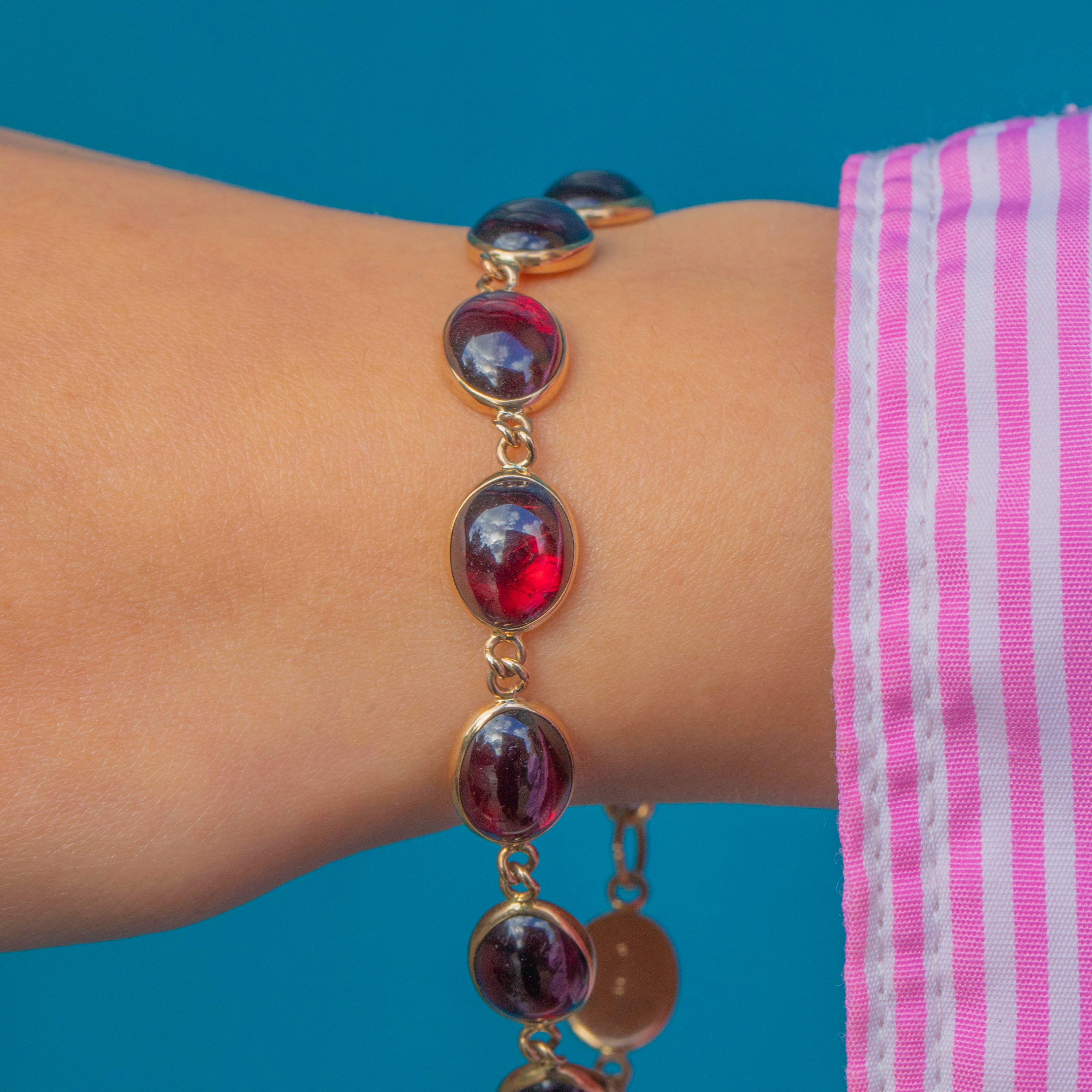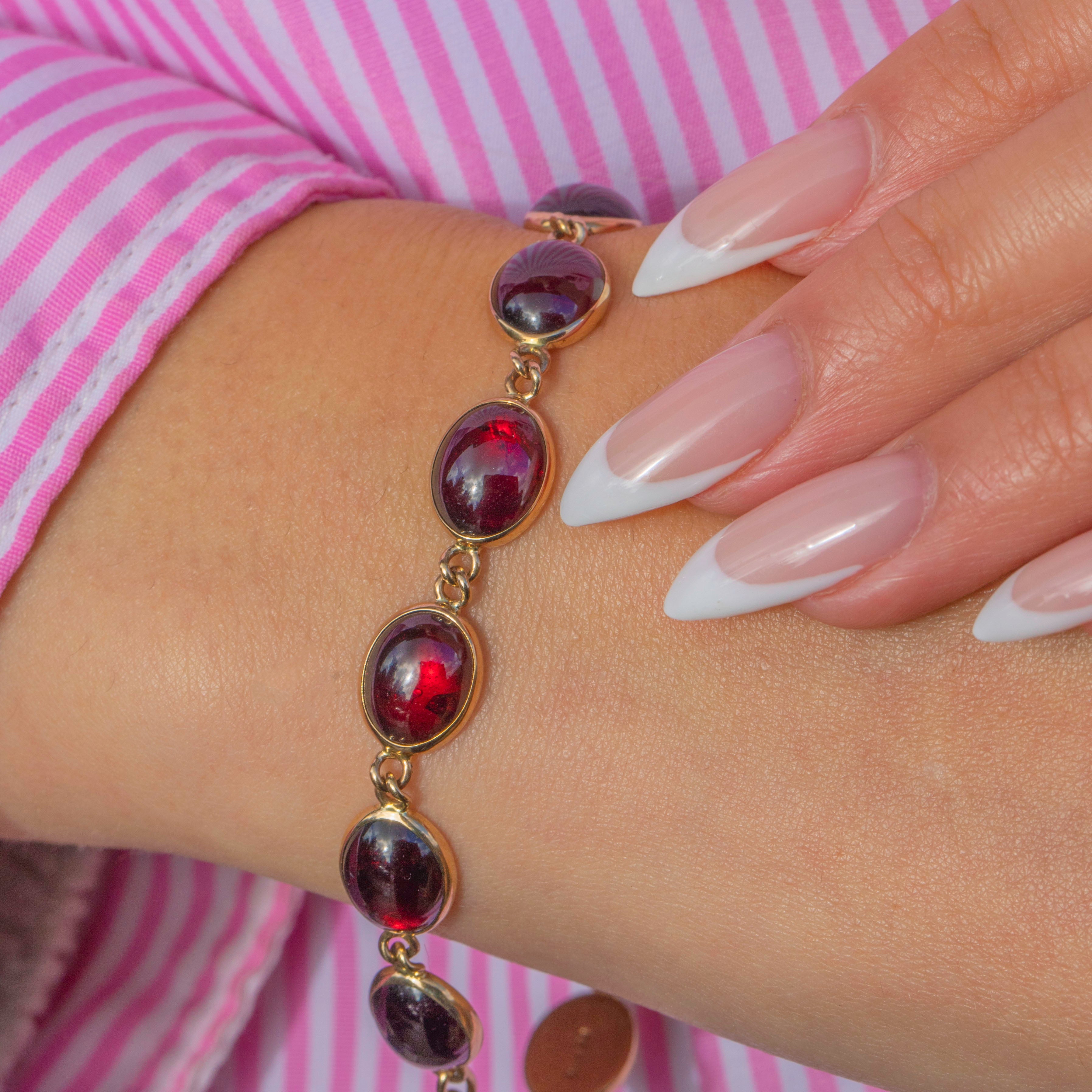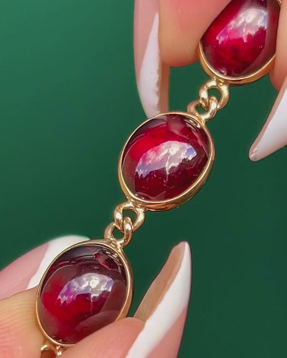 This vintage 9ct Gold bracelet is set with a row of rich, wine-red Garnets in smooth cabochon cuts, boasting 11.40 carats combined. Each oval stone glows beautifully in its bezel setting, displaying the depth and fire for which Garnets are so desired.