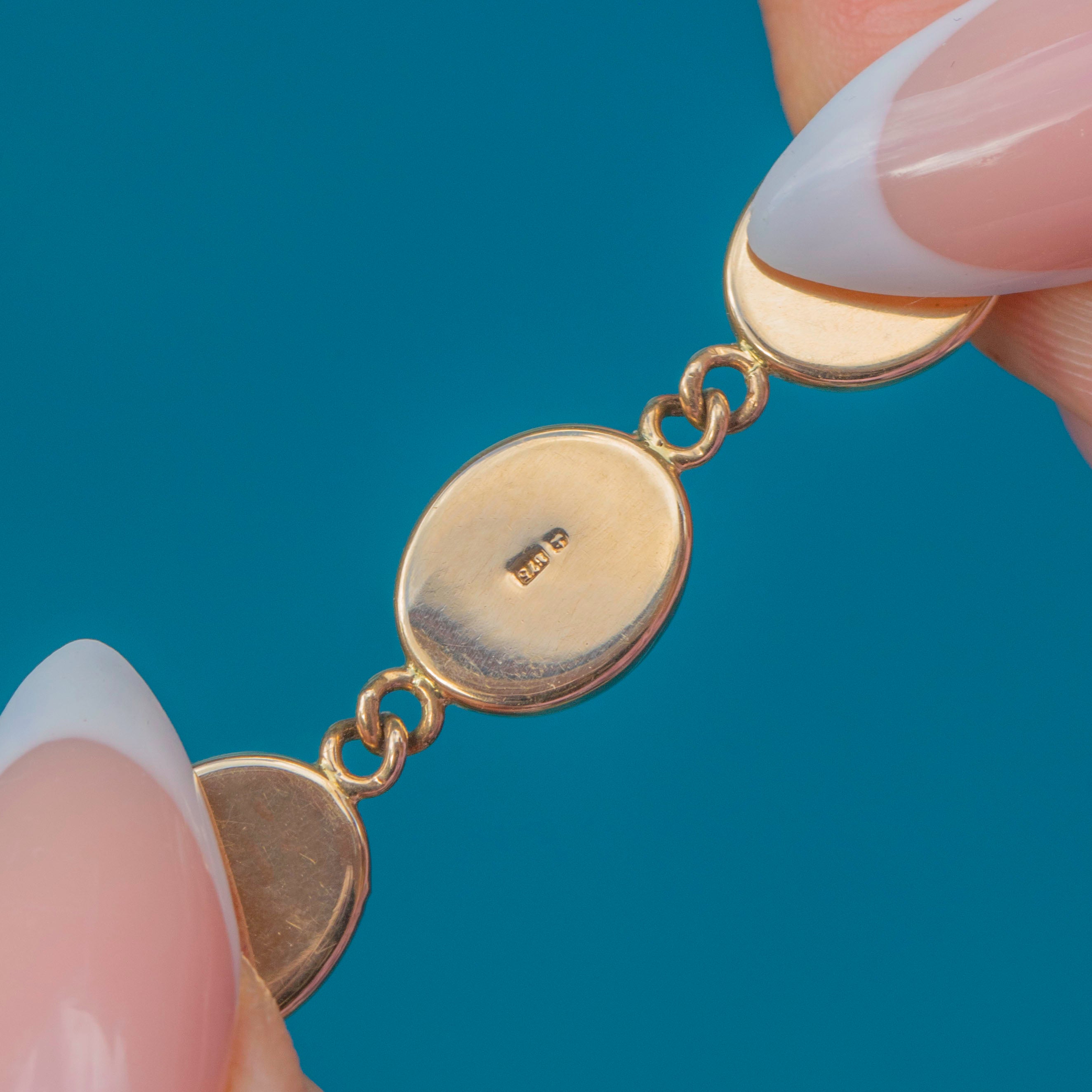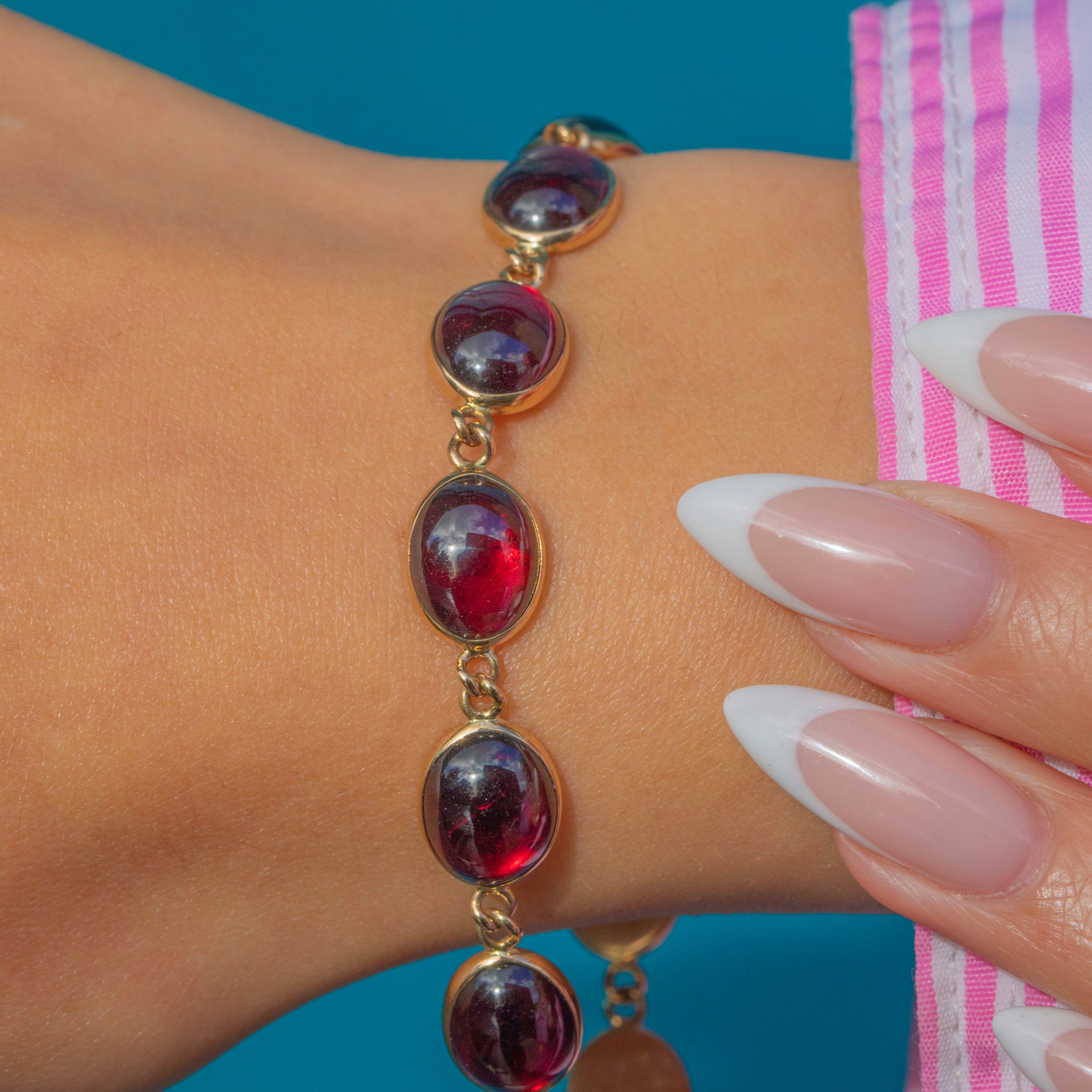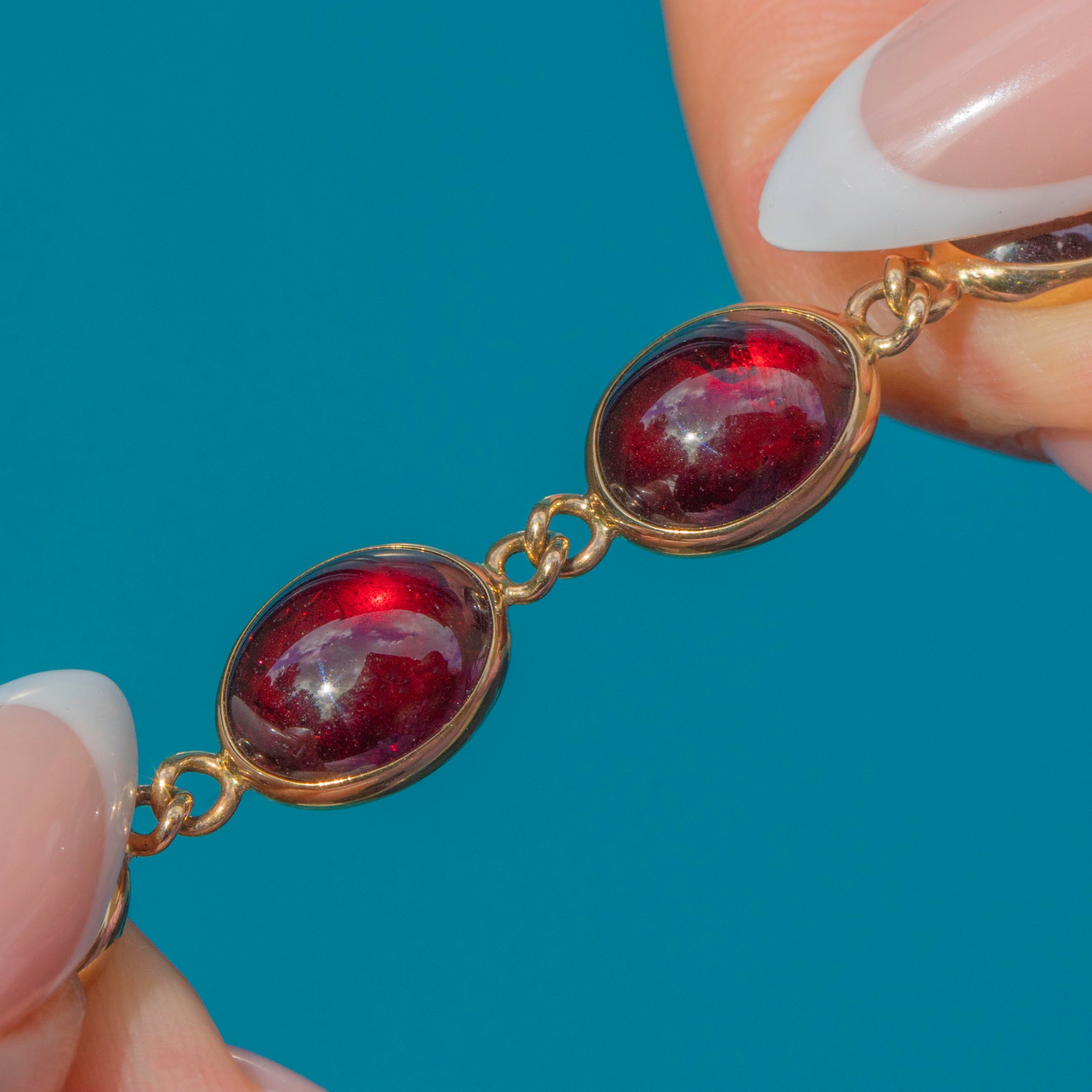This vintage 9ct Gold bracelet is set with a row of rich, wine-red Garnets in smooth cabochon cuts, boasting 11.40 carats combined. Each oval stone glows beautifully in its bezel setting, displaying the depth and fire for which Garnets are so desired.