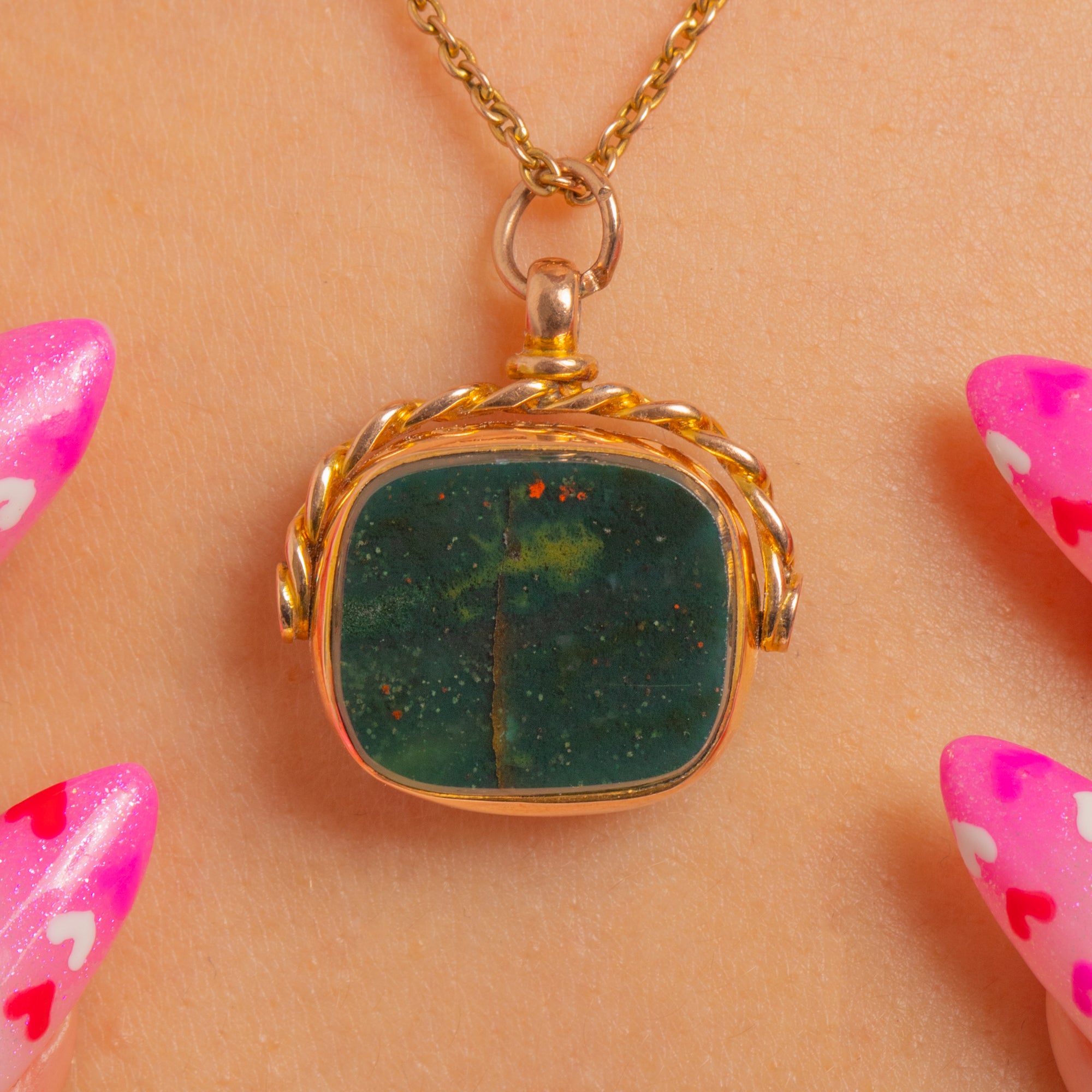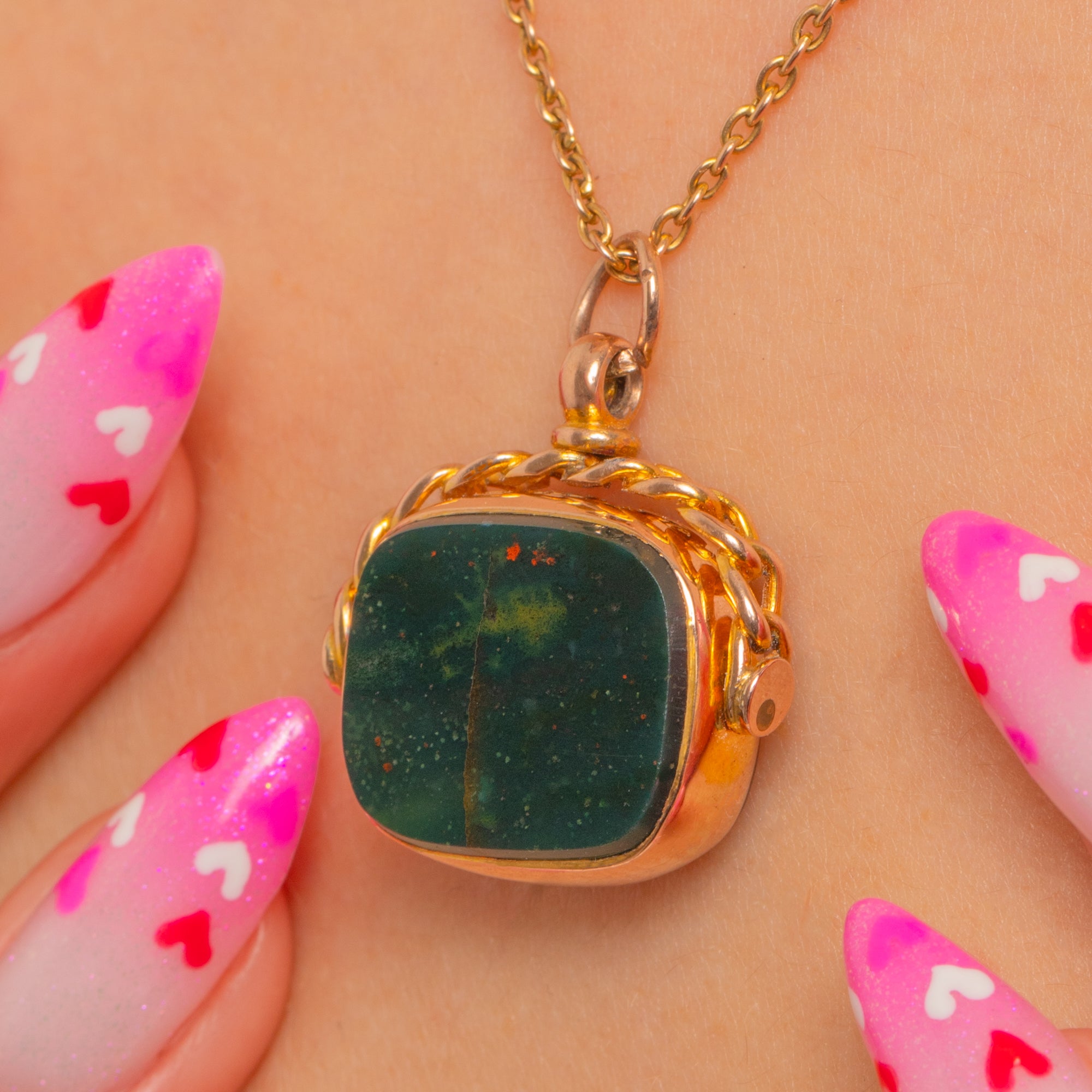A characterful early 20th-century 9ct Gold spinner fob showcasing two timeless gems: deep forest-green Bloodstone with tiny red flecks on one side and glossy, warm orange-red Carnelian on the other. The stones are neatly bezel-set within a compact swivel mount, offering two distinctive looks in one elegant piece.