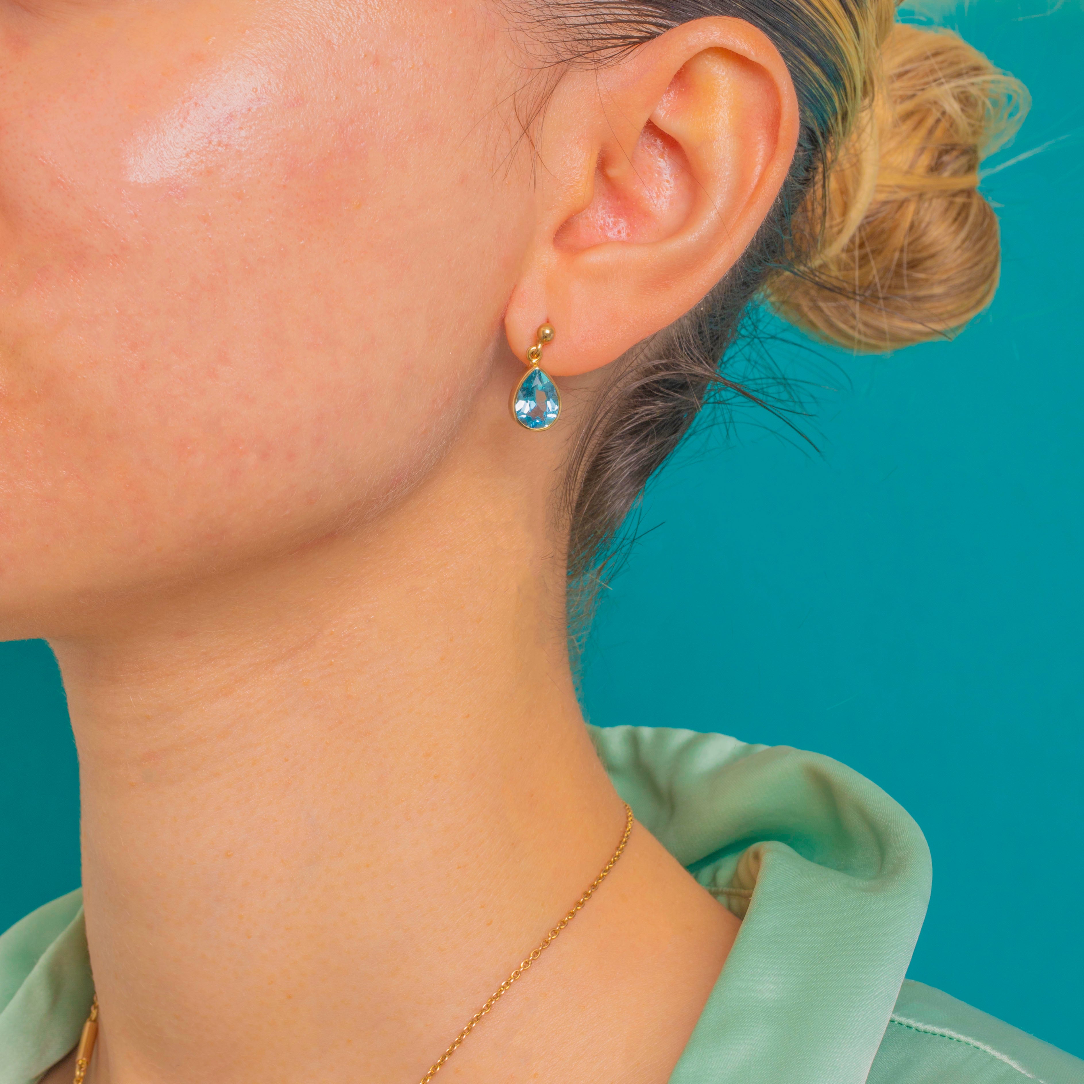 Effortlessly elegant, these Vintage 9ct Gold pear drop earrings showcase luminous Blue Topaz in sleek bezels, articulated beneath polished ball studs for a graceful, light-catching sway. The beautiful sky‑blue hue is crisp and bright, lending a refreshing pop of colour that feels both timeless and modern.