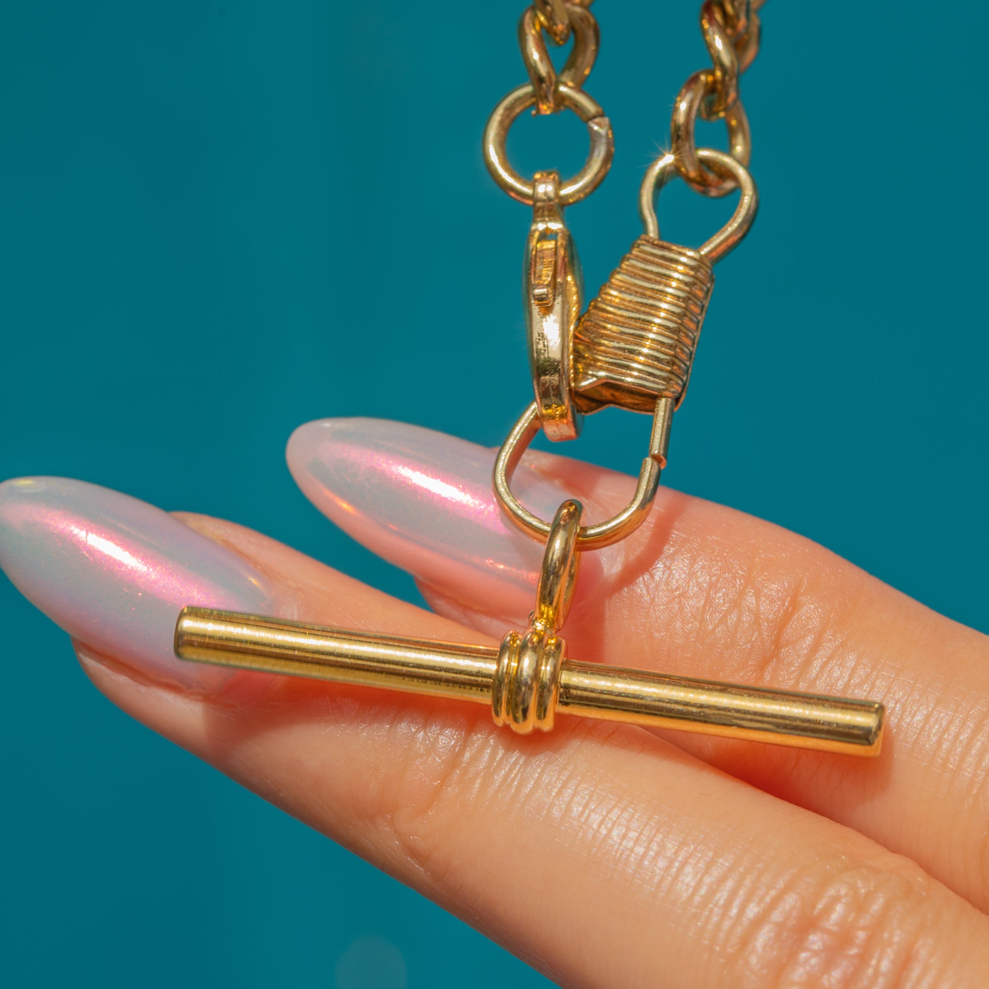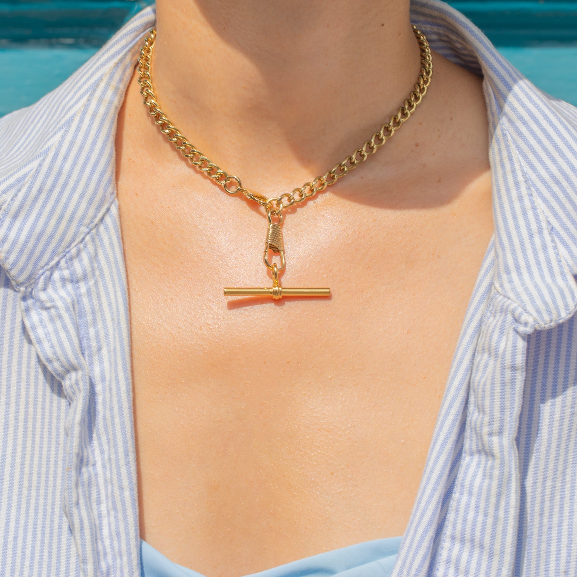 This Albert chain features an adorable dog-clip and is complete with a large t-bar which rests comfortably between your collarbones as it cascades across your décolletage. The t-bar is removable, allowing you to style this chain extender as you wish - what a treat!