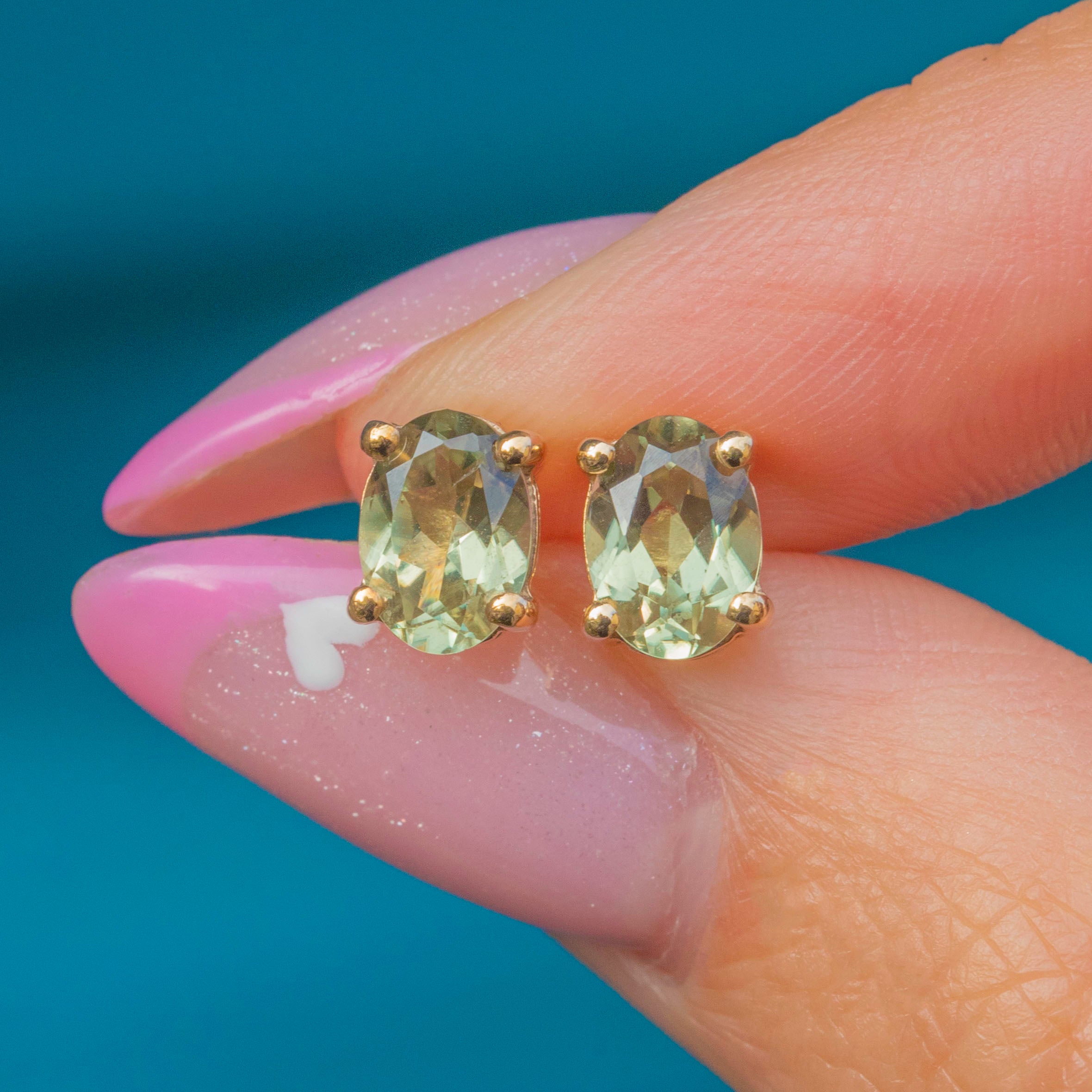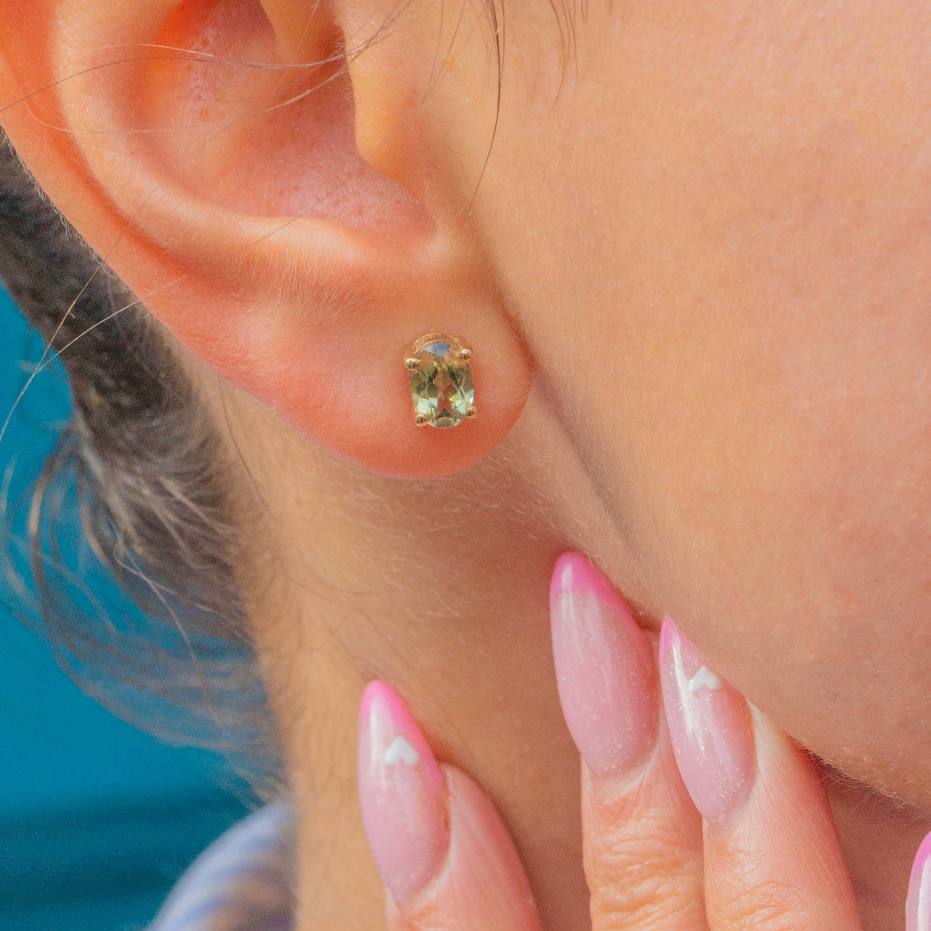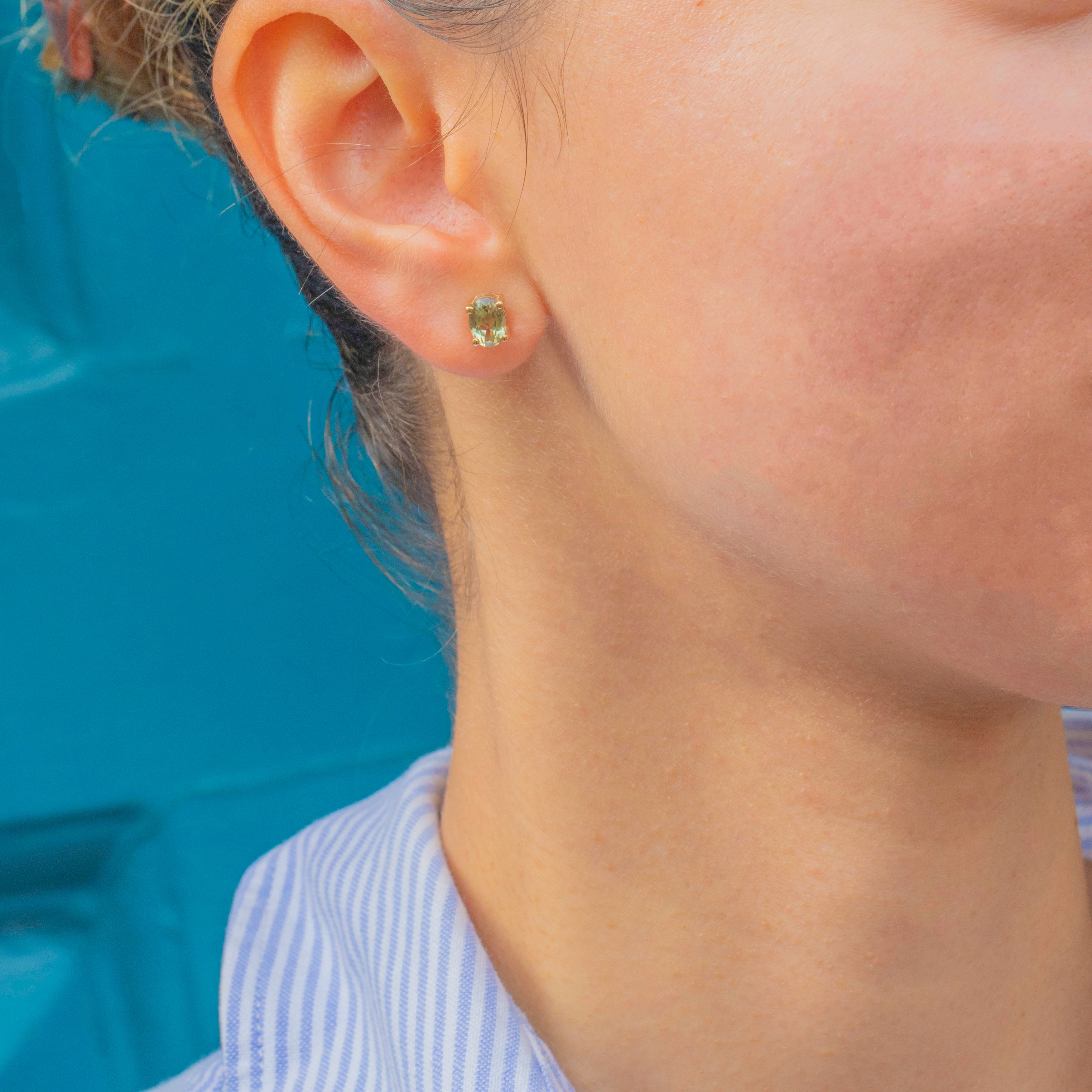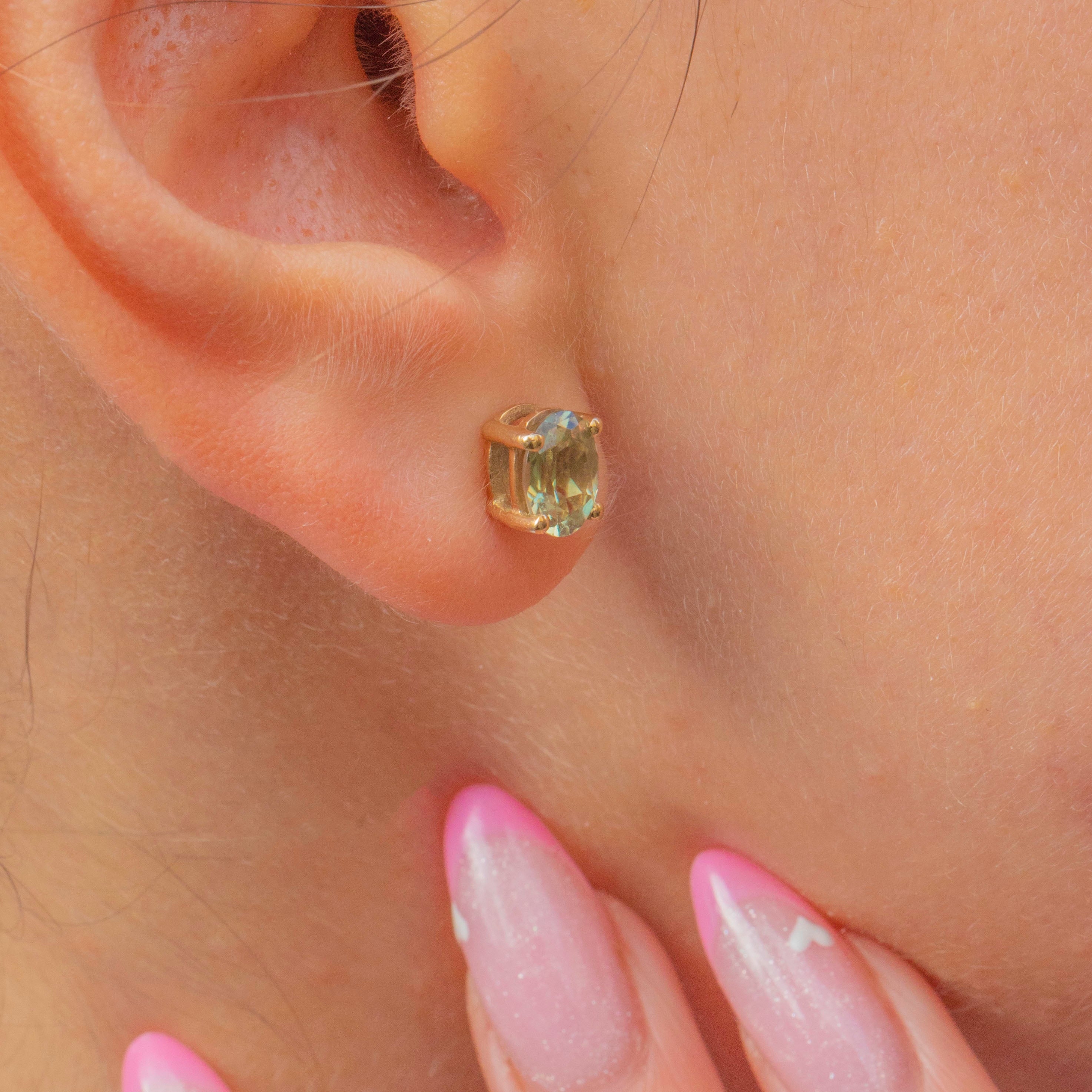 Elegant and timeless, these vintage Chrysoberyl studs shimmer with a gorgeous golden-green hue. Each earring features a lively oval Chrysoberyl securely set in a classic four-claw mount, radiating crisp brilliance from every angle.