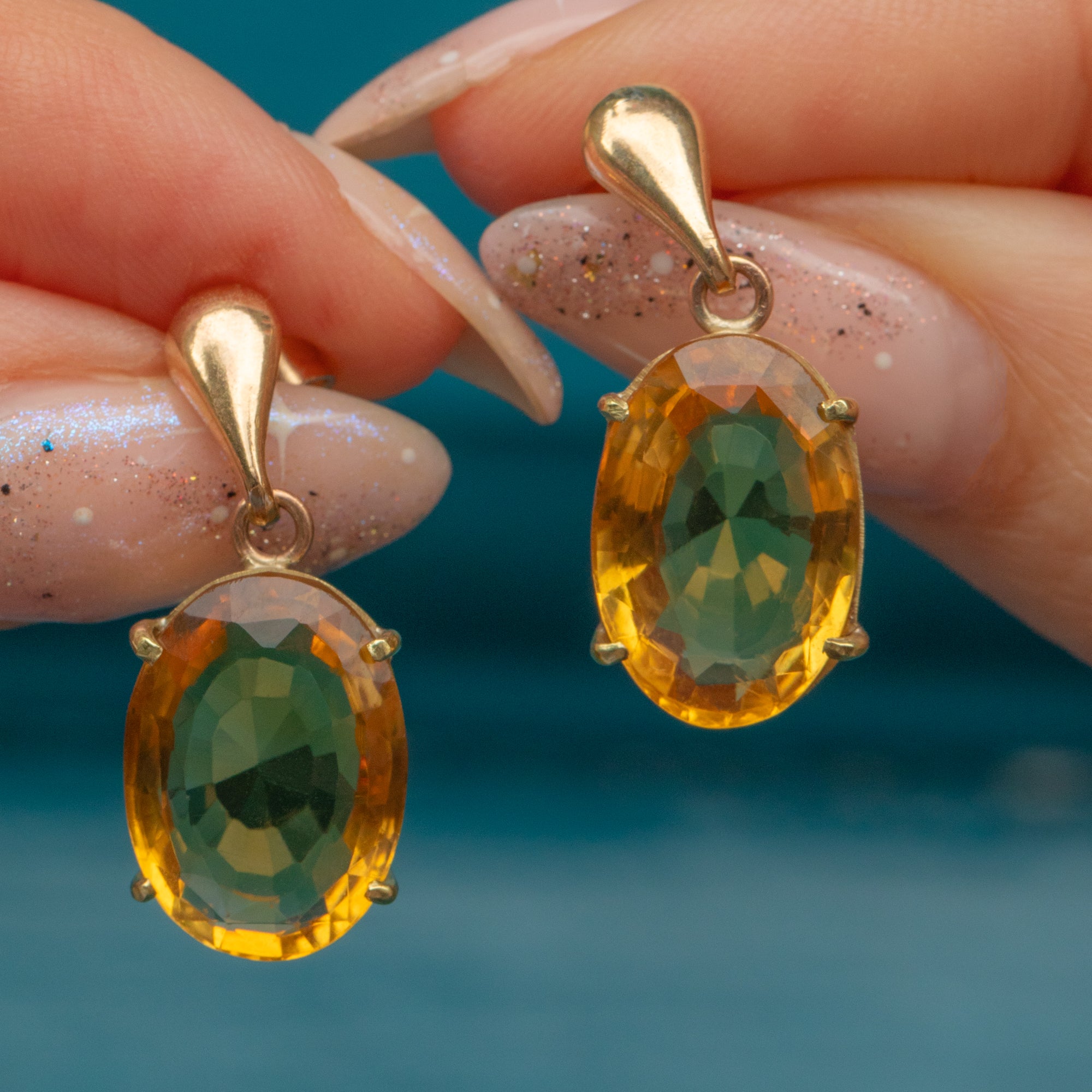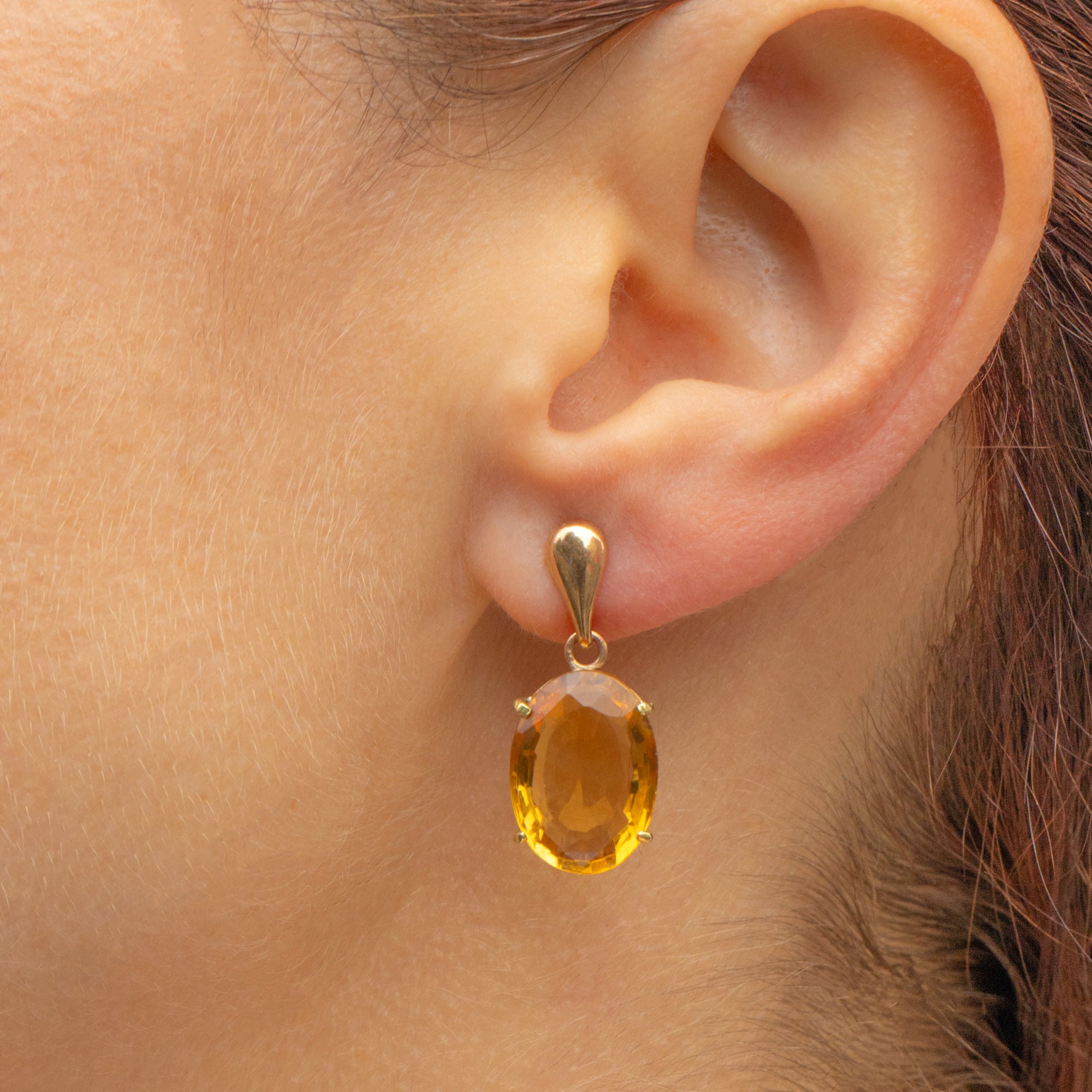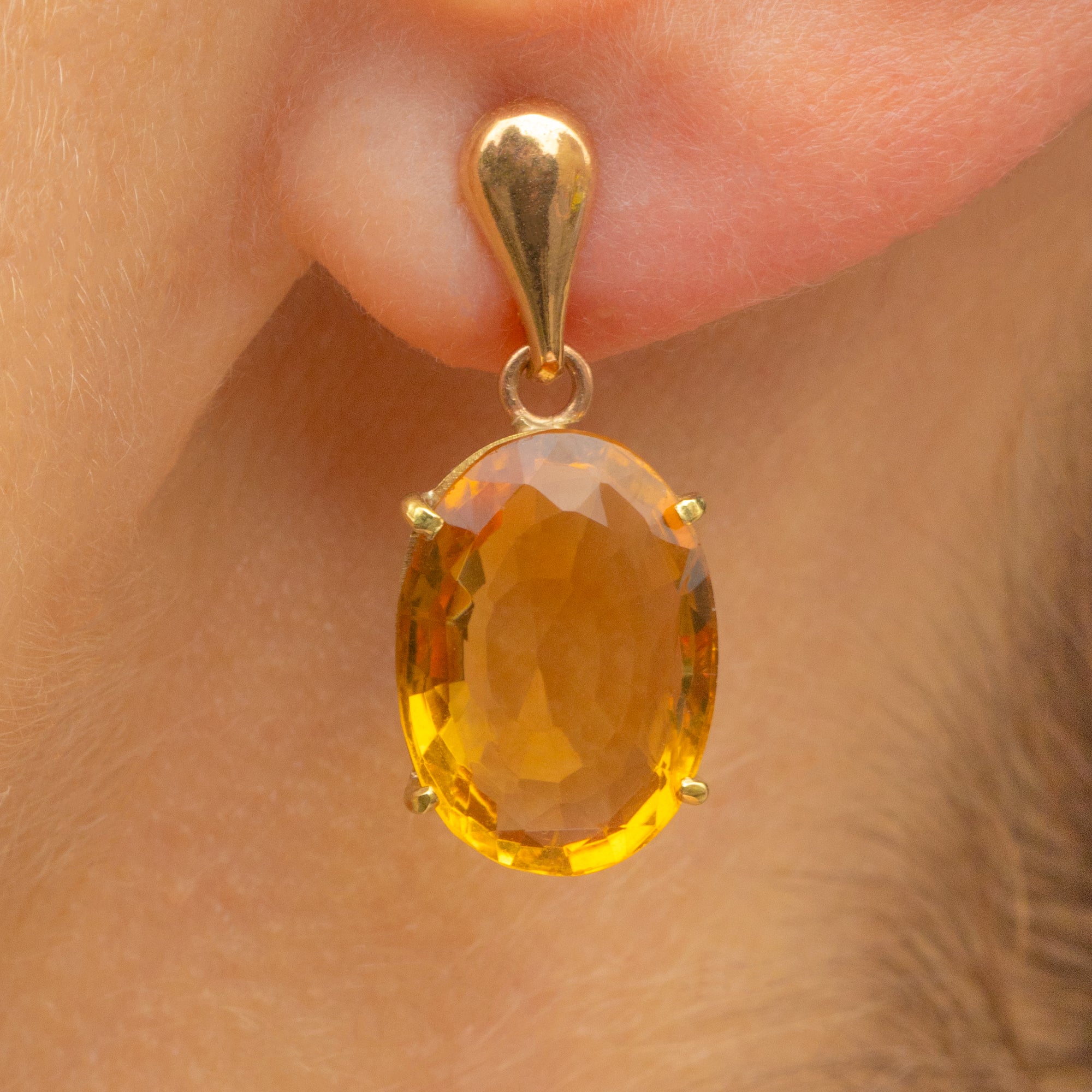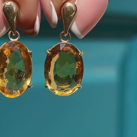 VERY GOOD-EXCELLENT. These 9ct Gold Citrine drop earrings are in wonderful condition! The Citrines are secure within the settings and can be worn with absolute confidence. There is some very subtle wear on the edges of the Citrines but nothing untoward. The Gold is buttery throughout, there is a visible join mark on one of the settings but it gives peace of mind they are securely soldered. With tight-fitting butterfly backs, simply pop these Citrine drop earrings in and enjoy their beauty!