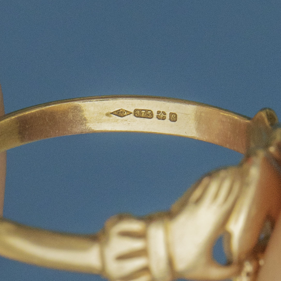 VERY GOOD. This 9ct Gold Claddagh ring is in very good condition. The Gold is buttery and the details have remained defined, with no signs or wear. There is a resize mark on the back of the band, which cannot be seen while the ring is worn. The ring is smooth and comfortable to wear, with a full set of English hallmarks inside dating to 1991.