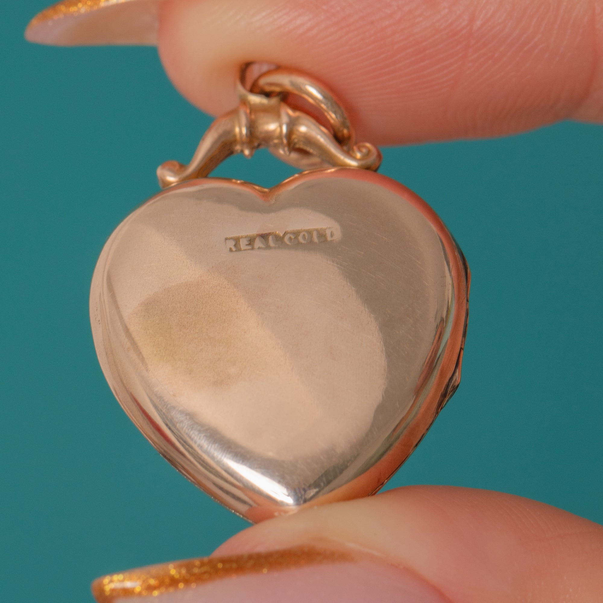 This beautiful Vintage locket is crafted in warm 9ct Gold and styled into a romantic heart shape. The softly puffed heart form features a hand-engraved starburst set with a single twinkling Diamond at its centre, giving just the right amount of sparkle.